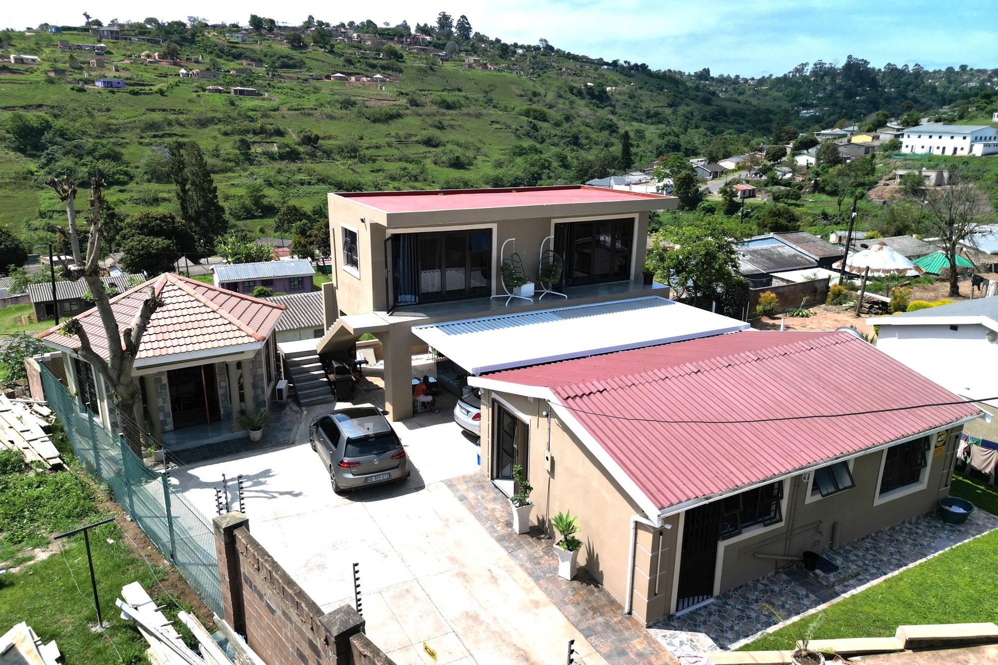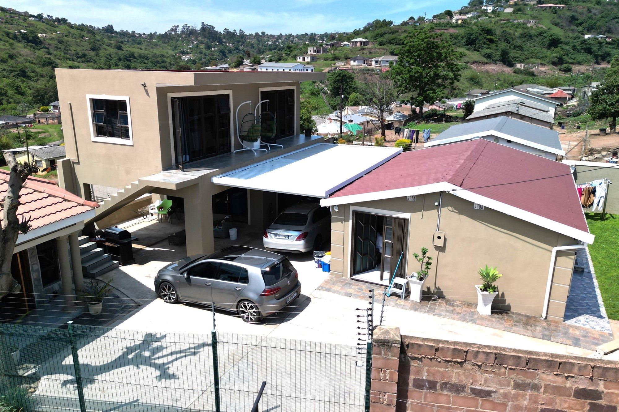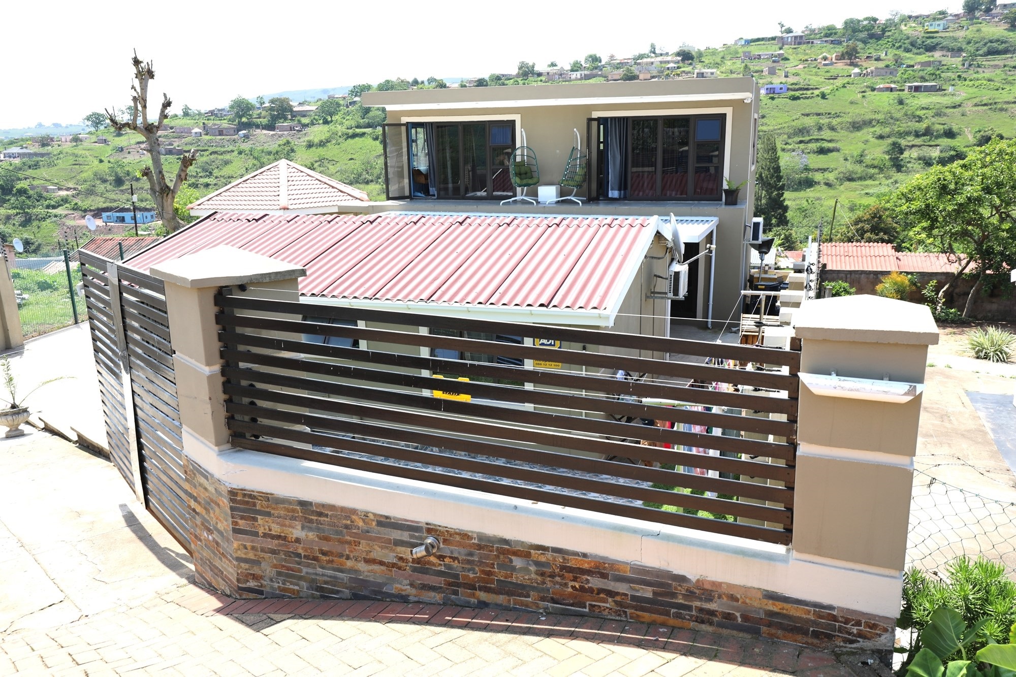 The other house is a double storeyed house with 2 bedrooms upstairs, both with access to the balcony and with a beautiful view. There is also a bathroom with modern finishes. Downstairs is a big lounge with aircon and a bathroom with connecting pipes for washing machine.