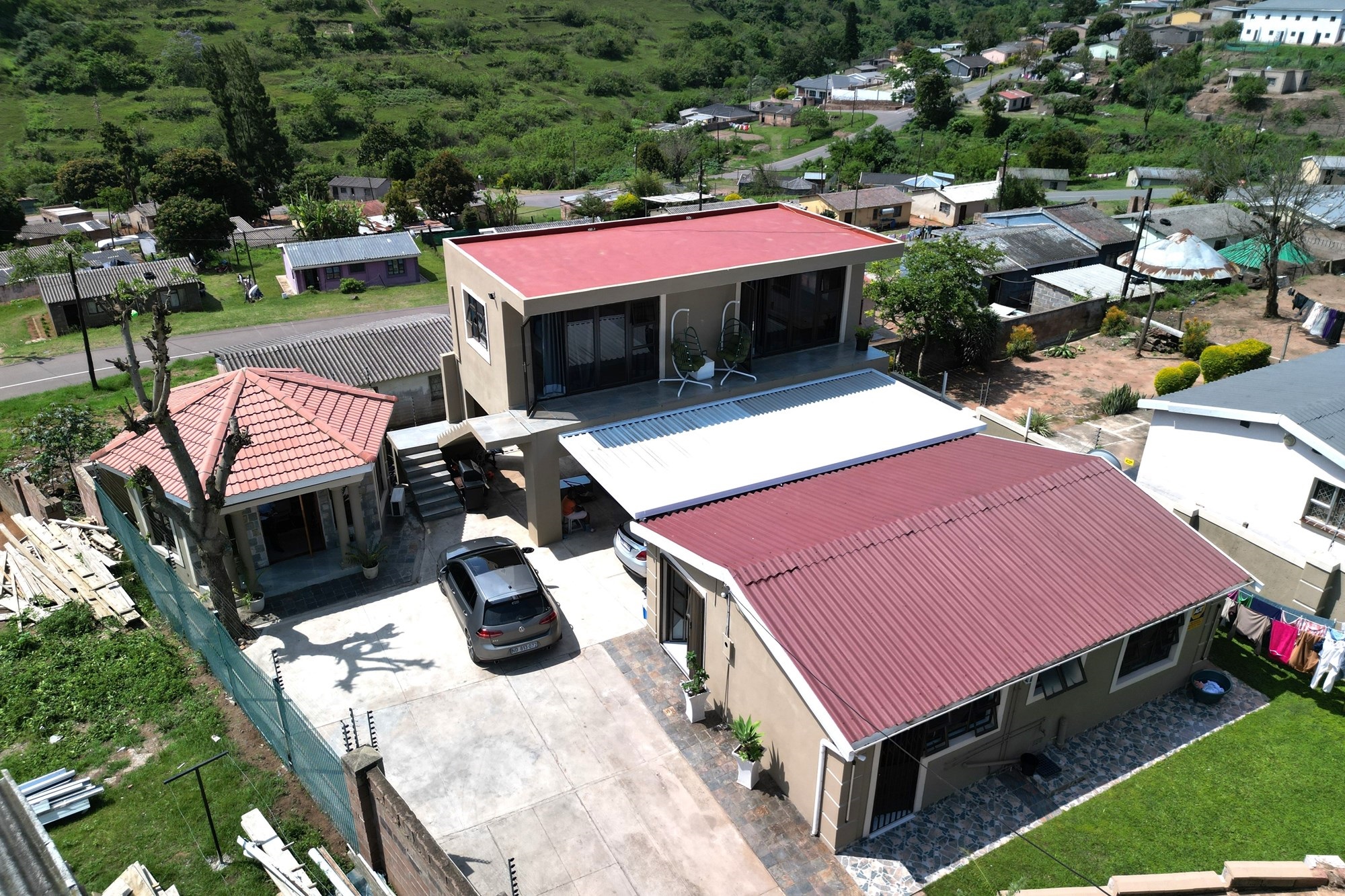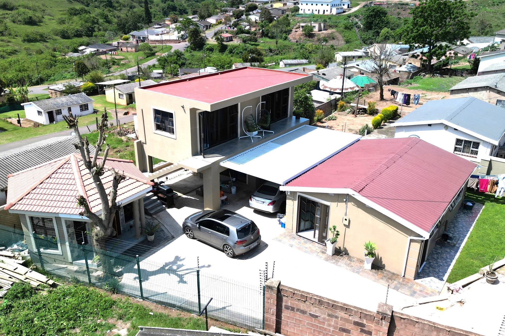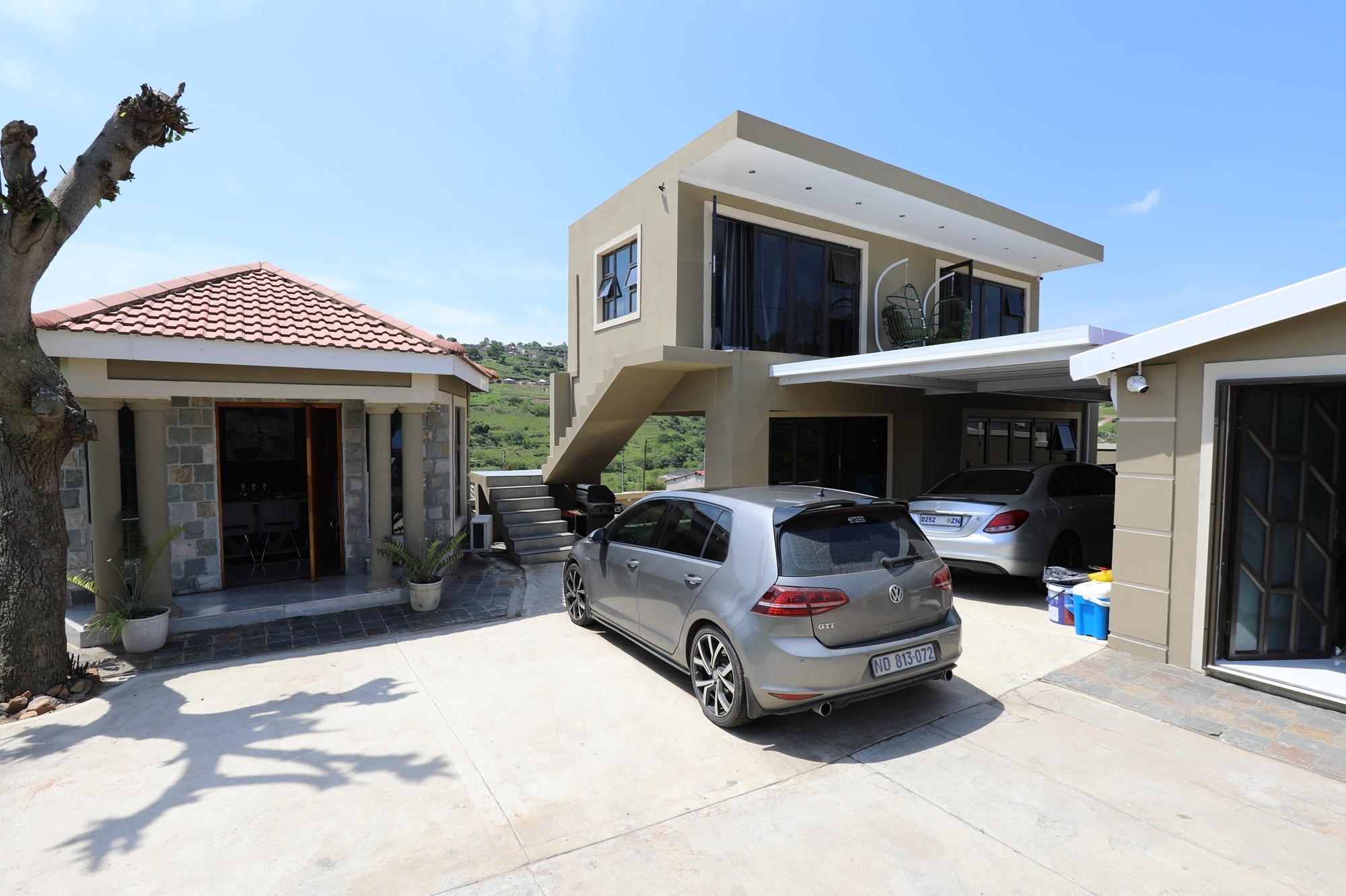 The other house is a double storeyed house with 2 bedrooms upstairs, both with access to the balcony and with a beautiful view. There is also a bathroom with modern finishes. Downstairs is a big lounge with aircon and a bathroom with connecting pipes for washing machine.
