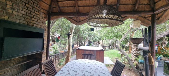 Bushveld living in Marloth Park — relaxed indoor-outdoor flow onto a covered patio with built-in braai and bubbling jacuzzi. Two bedrooms, two bathrooms on a generous 1530 m² stand.