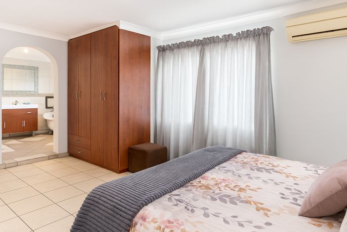 Relaxed luxury living in peaceful Aerorand with patrolled security and sunset balcony — entertainer’s built-in braai, ultra-modern kitchen, five en-suite bedrooms and double garage.