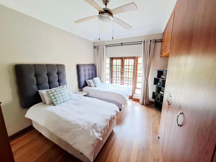 Private landscaped sanctuary with entertainment lapa and splash pool for lively summer gatherings; open-plan living with scullery, generous bedrooms, secure parking for eight vehicles. 4 beds, 3.5 baths.