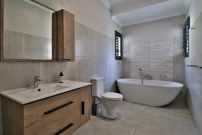 Relaxed family living on Nelspruit outskirts with nearby amenities, covered patio and balcony, backup 5kW battery/inverter, 24-hour security; three bedrooms, three bathrooms and double garage.