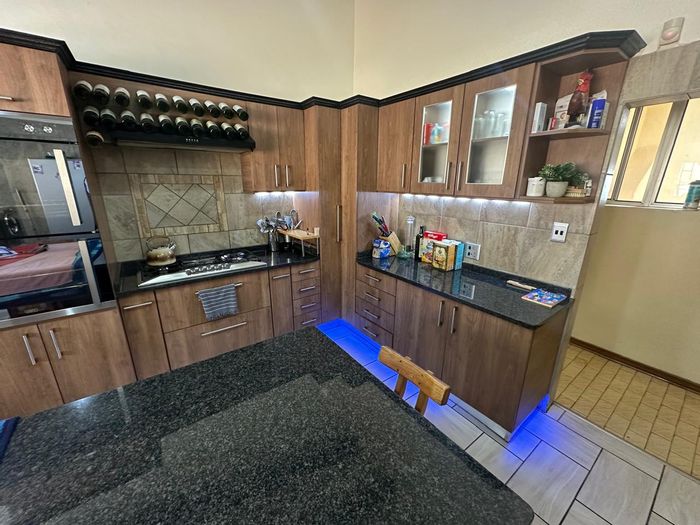West Acres Extension 6 entertainer with pool and covered braai overlooking lush garden; owner-built home includes upstairs study with kitchenette, wine cellar and scope to add extra bedrooms. Double garage.