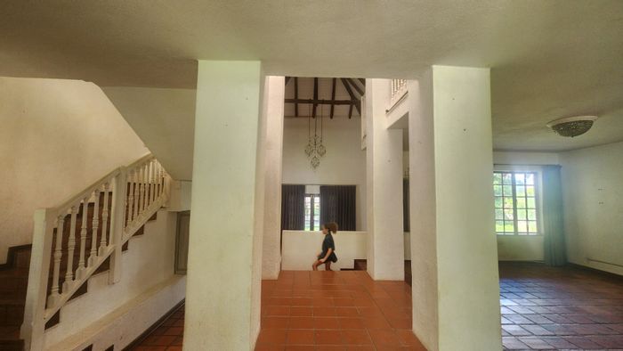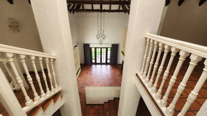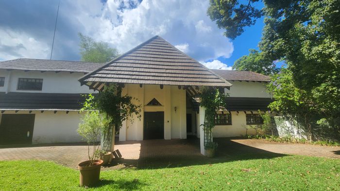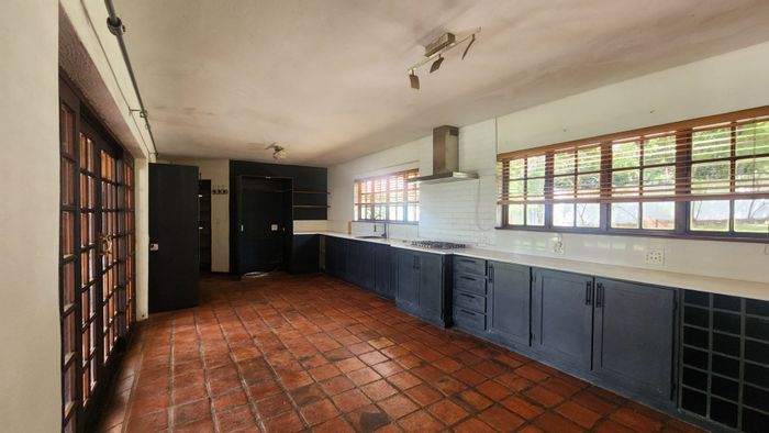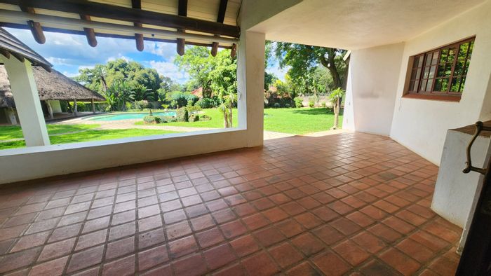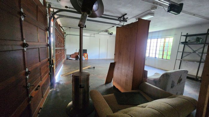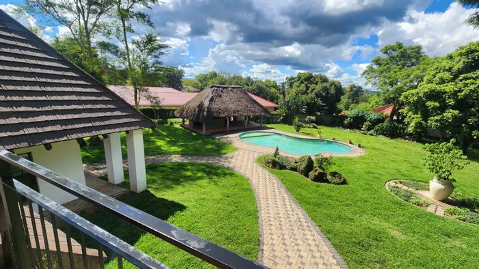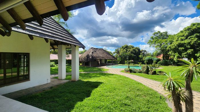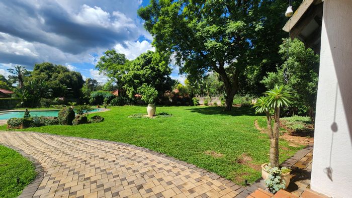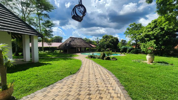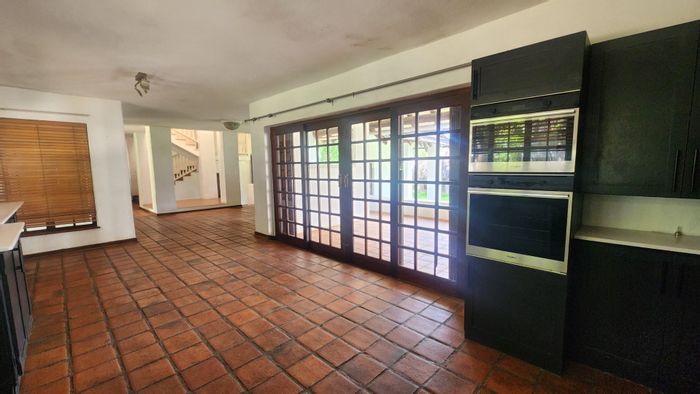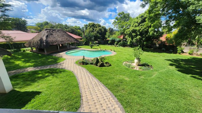 5 bedrooms, 4 bathrooms, domestic room, 3 garages, carport, kitchen with gas stoves, pool, and large gardens.