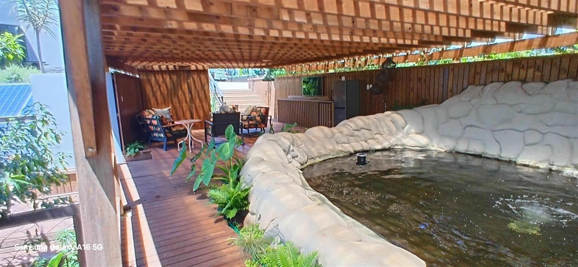 The heart of the home is the open-plan kitchen, equipped with high-end appliances, including a gas hob and eye-level oven. It flows seamlessly into the dining room and lounge, creating an inviting space for gathering and entertaining. For those who appreciate outdoor living, the patio overlooks a beautifully landscaped garden, complete with a koi pond and water feature, making it a tranquil retreat.