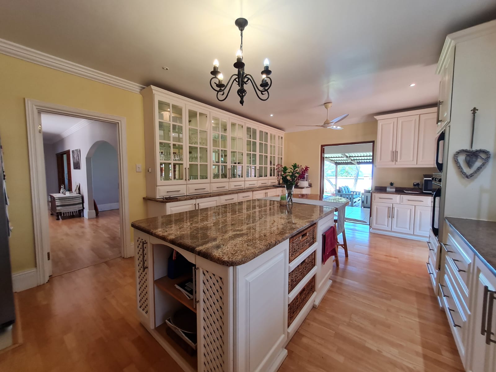 The country-style kitchen, complete with granite tops, chandelier lighting and scullery, is both charming and functional, flowing seamlessly onto the undercover patio. French doors from the living area, lead out to the lush garden, undercover entertainment patio, and sparkling pool — all perfectly positioned to capture those dreamy coastal views and golden afternoon light.