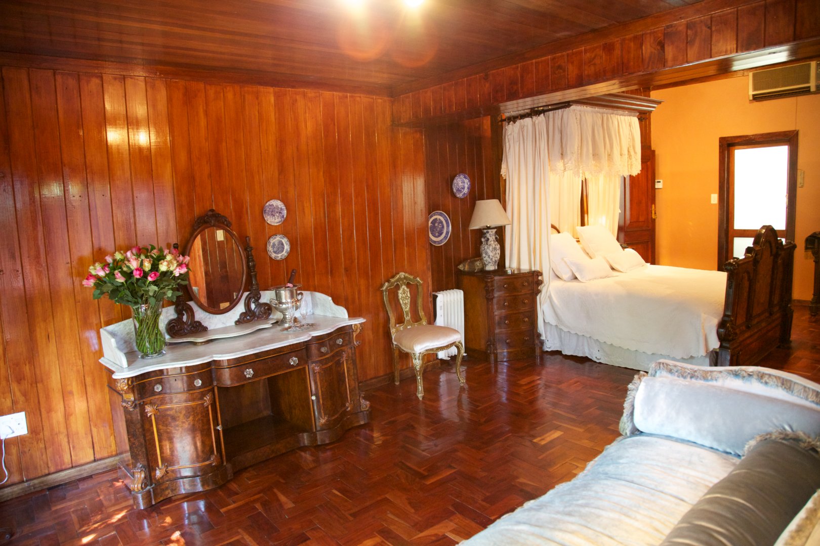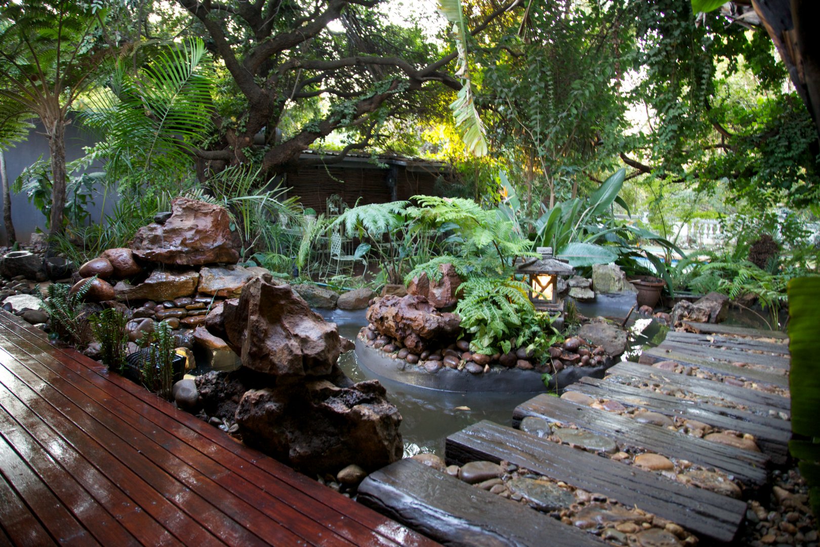 The main living areas, including a formal dining room and large open-plan lounge, are bright and welcoming, enhanced by rich wood and classic finishes. Stacking wooden doors open onto a beautifully landscaped garden with a tranquil water feature and swimming pool, offering year-round greenery thanks to a strong borehole-fed irrigation system on the 1880m2 stand.