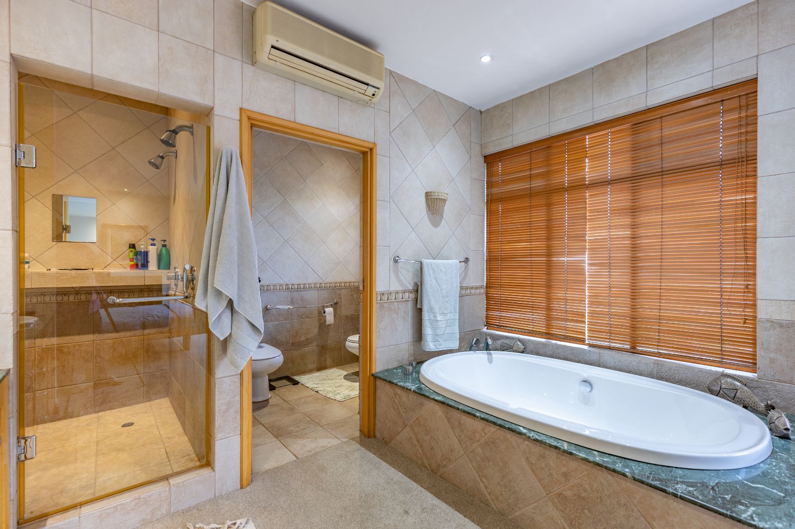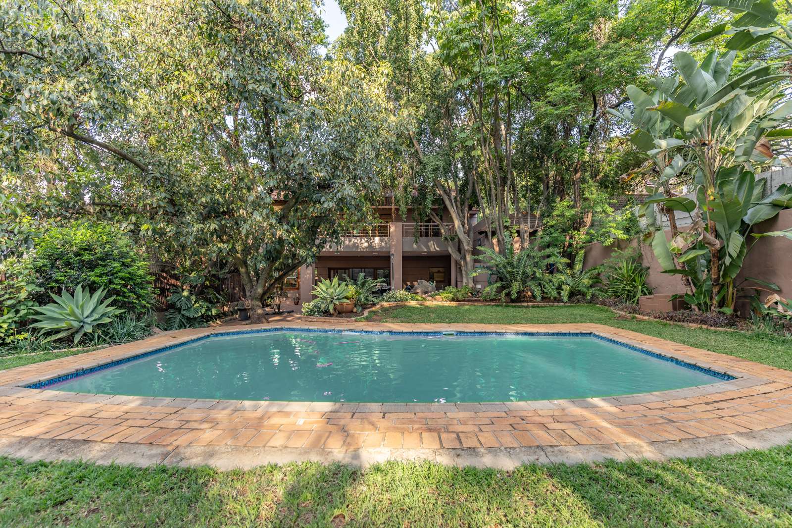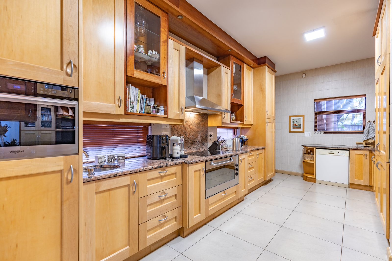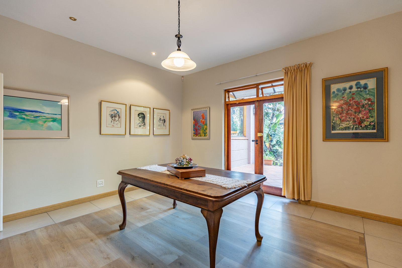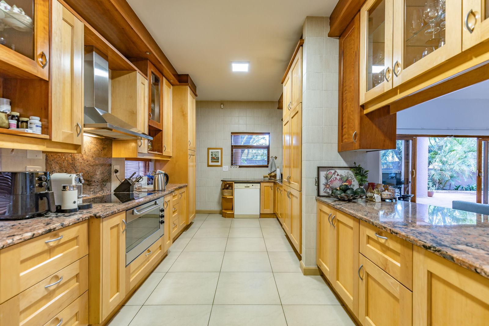 On the ground level, the heart of the home is an exquisitely appointed kitchen featuring integrated appliances, including a fitted fridge and freezer, as well as solid wood and glass display cabinets. With granite countertops, a spacious pantry, and a scullery equipped for a dishwasher, this kitchen offers functionality in a timeless design. The kitchen flows seamlessly into the first of two lounges, complete with built-in glass and wooden cabinets and access to a stunning outdoor entertainment area. This roofed sanctuary includes a Jacuzzi, overlooking a lush, bird-rich garden and a sparkling pool surrounded by mature trees—a peaceful oasis for relaxation or hosting.
