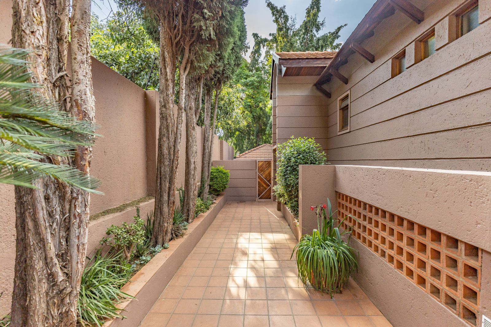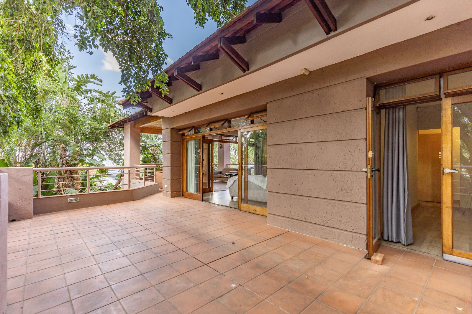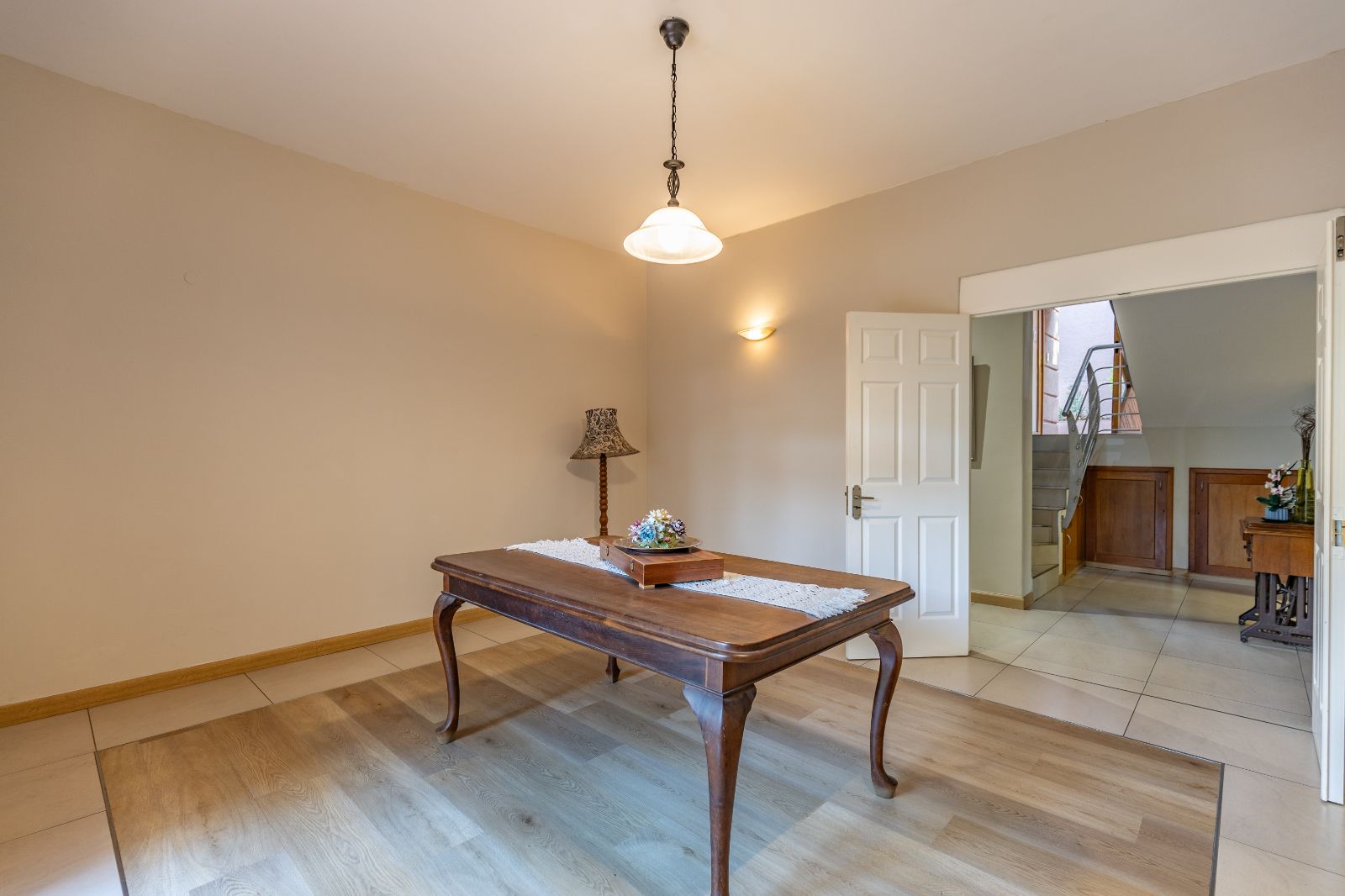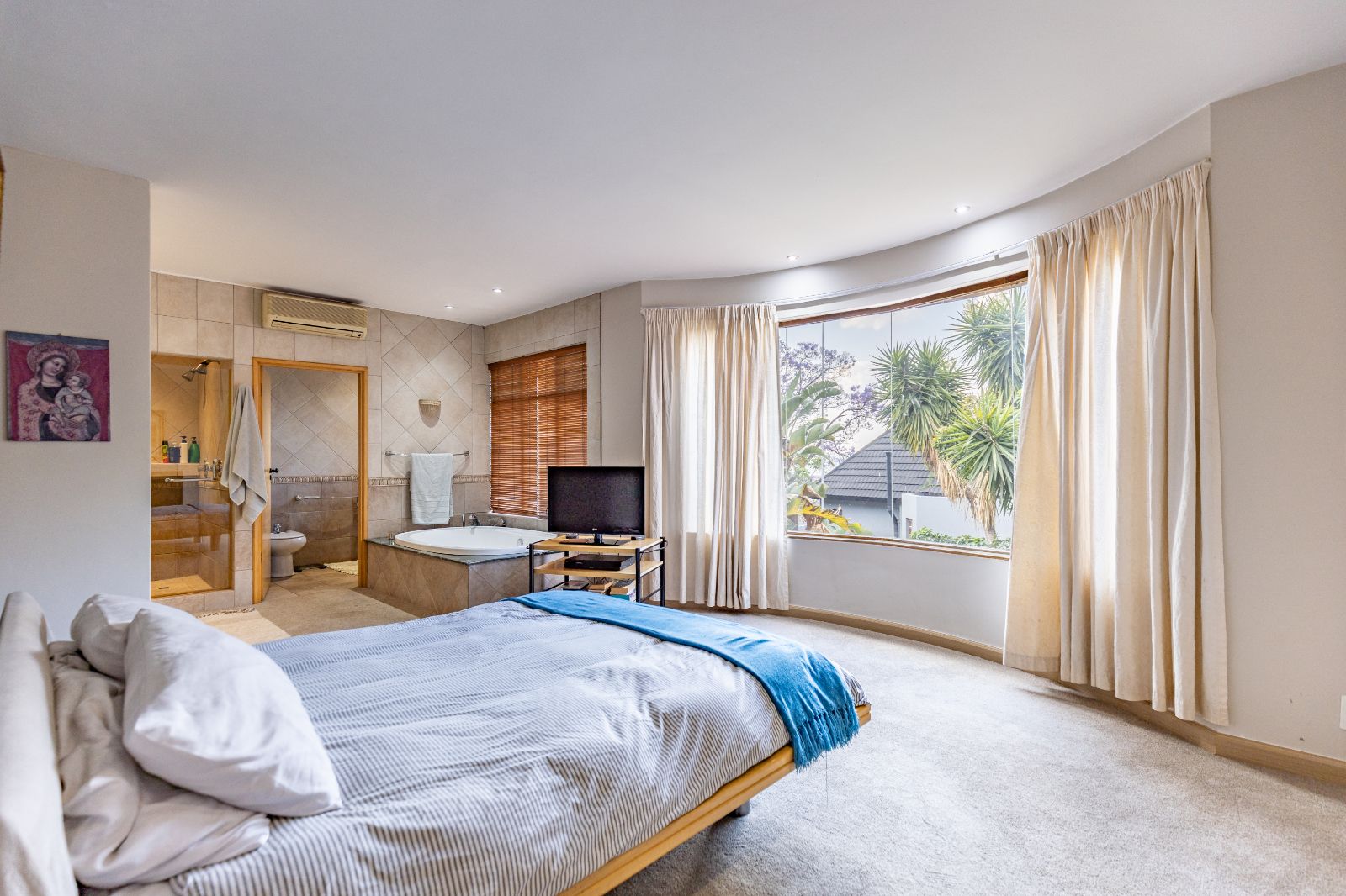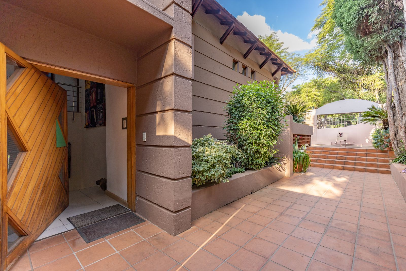 On the ground level, the heart of the home is an exquisitely appointed kitchen featuring integrated appliances, including a fitted fridge and freezer, as well as solid wood and glass display cabinets. With granite countertops, a spacious pantry, and a scullery equipped for a dishwasher, this kitchen offers functionality in a timeless design. The kitchen flows seamlessly into the first of two lounges, complete with built-in glass and wooden cabinets and access to a stunning outdoor entertainment area. This roofed sanctuary includes a Jacuzzi, overlooking a lush, bird-rich garden and a sparkling pool surrounded by mature trees—a peaceful oasis for relaxation or hosting.