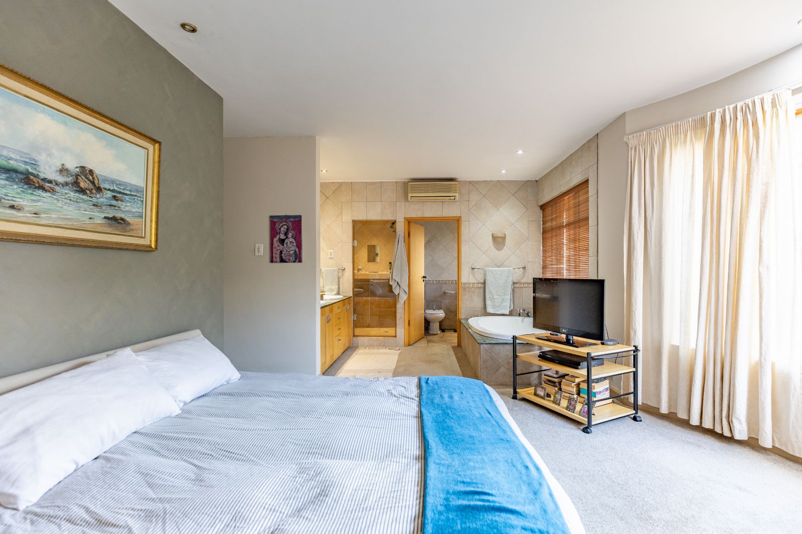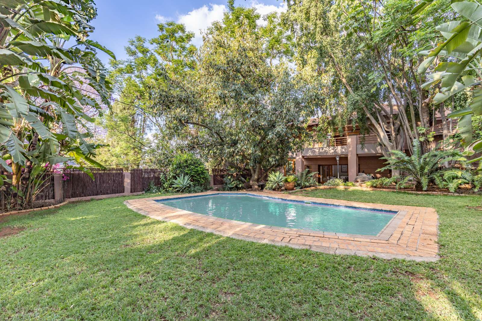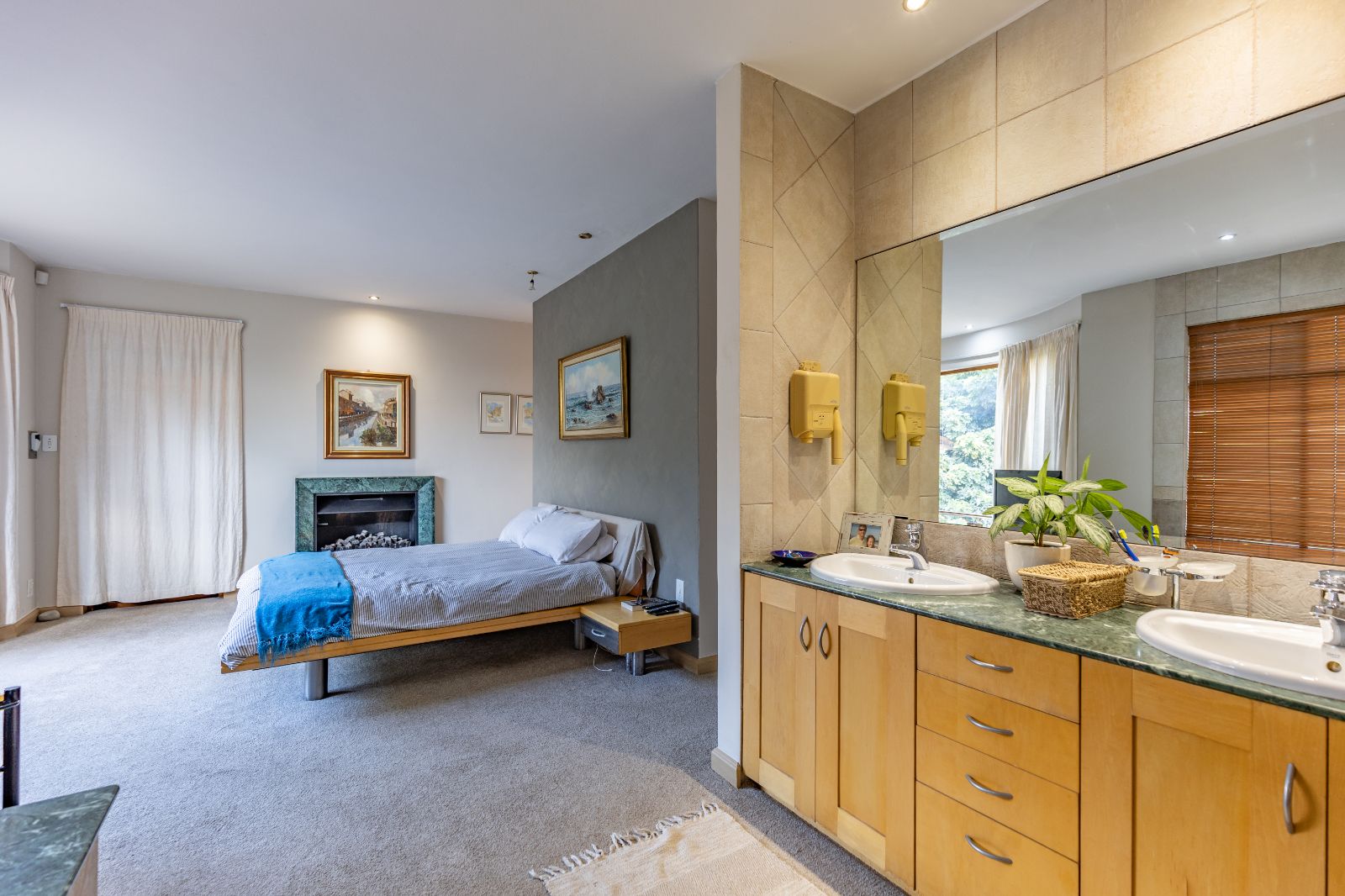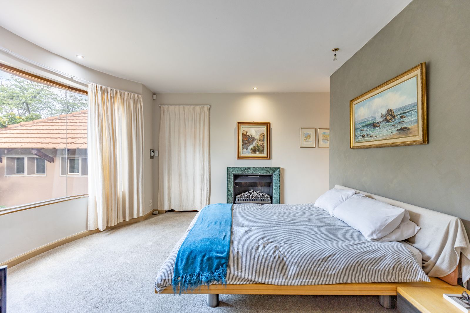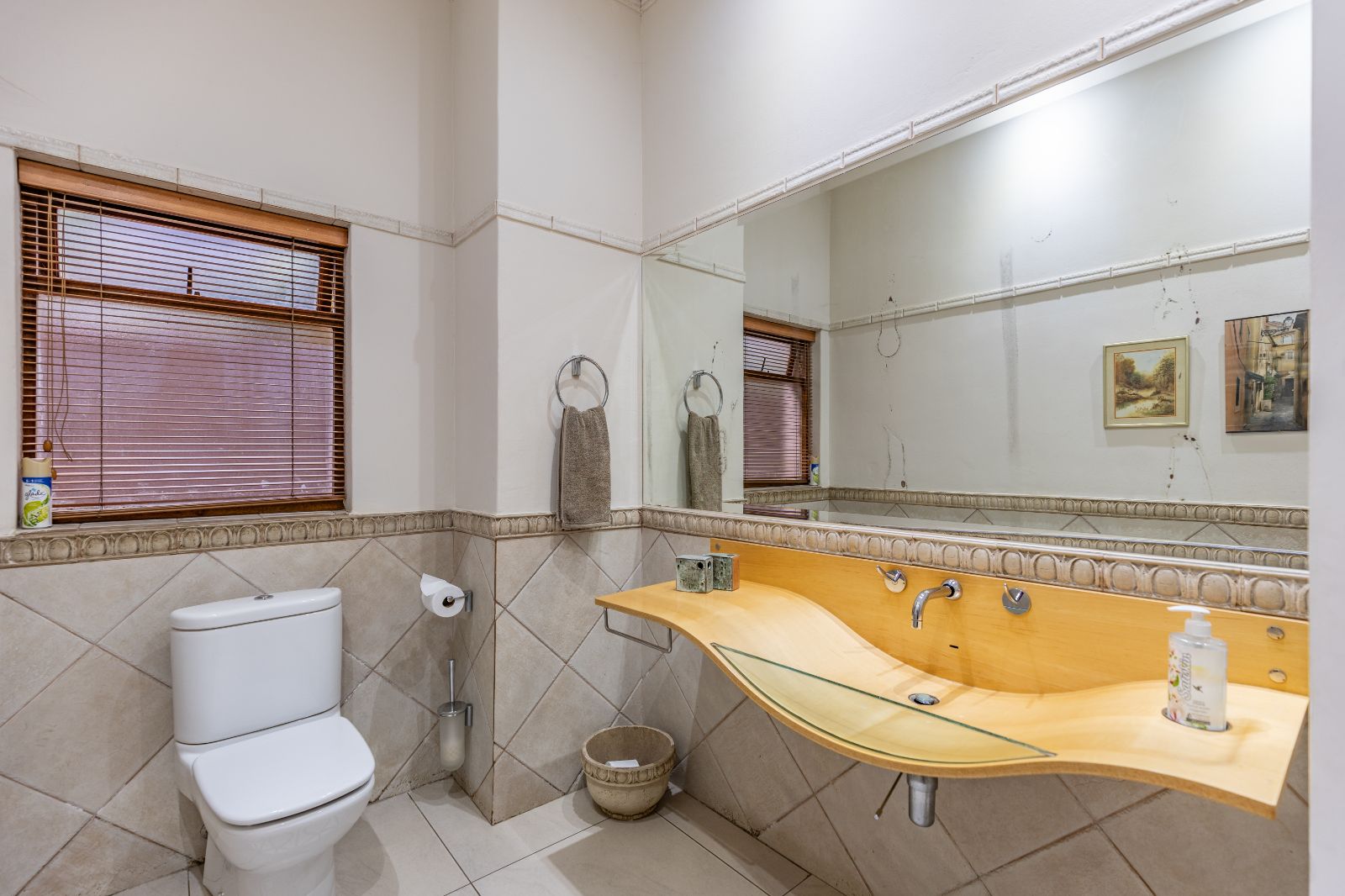 On the ground level, the heart of the home is an exquisitely appointed kitchen featuring integrated appliances, including a fitted fridge and freezer, as well as solid wood and glass display cabinets. With granite countertops, a spacious pantry, and a scullery equipped for a dishwasher, this kitchen offers functionality in a timeless design. The kitchen flows seamlessly into the first of two lounges, complete with built-in glass and wooden cabinets and access to a stunning outdoor entertainment area. This roofed sanctuary includes a Jacuzzi, overlooking a lush, bird-rich garden and a sparkling pool surrounded by mature trees—a peaceful oasis for relaxation or hosting.