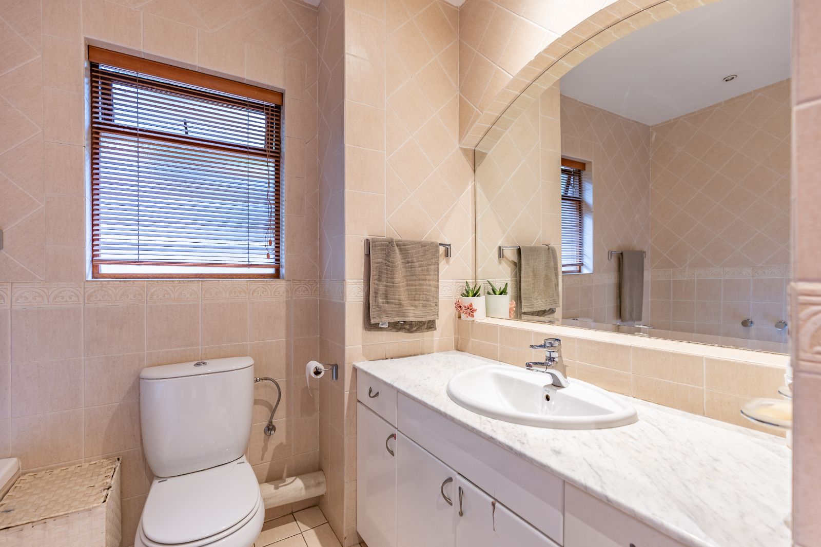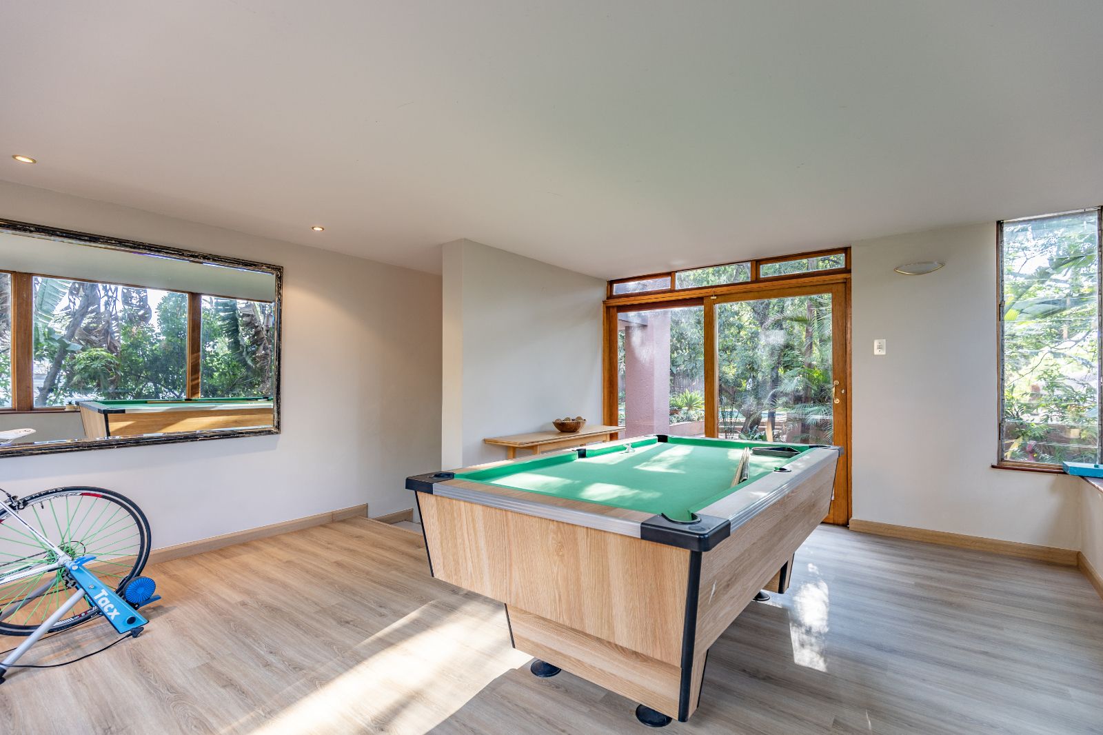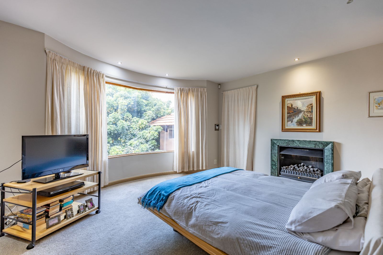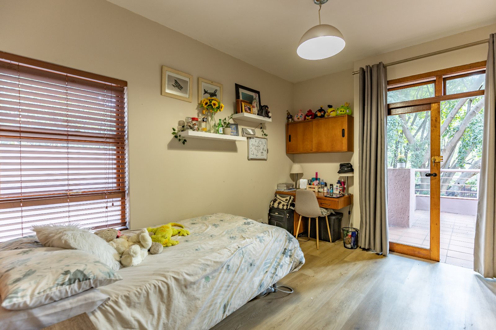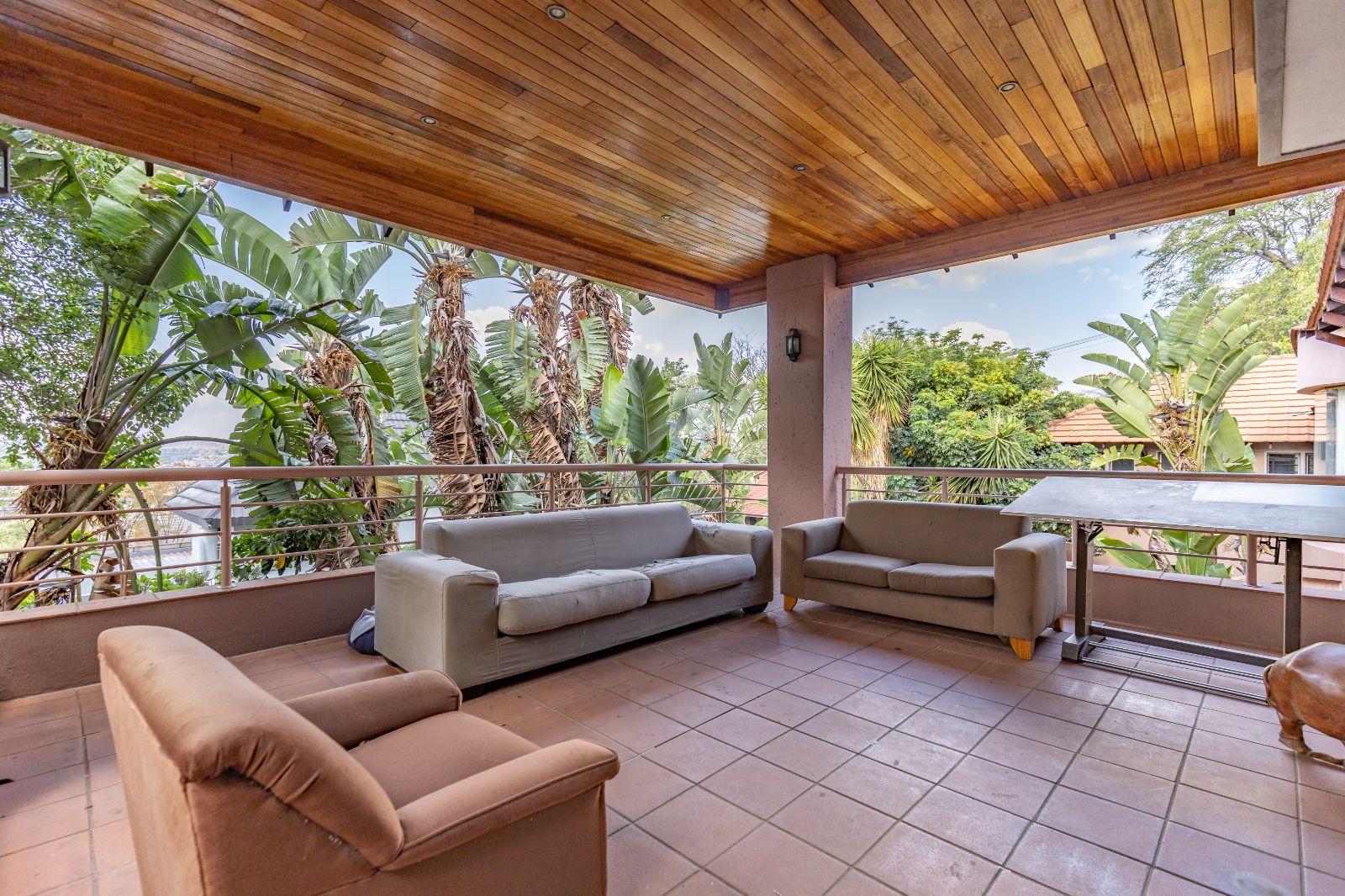 On the ground level, the heart of the home is an exquisitely appointed kitchen featuring integrated appliances, including a fitted fridge and freezer, as well as solid wood and glass display cabinets. With granite countertops, a spacious pantry, and a scullery equipped for a dishwasher, this kitchen offers functionality in a timeless design. The kitchen flows seamlessly into the first of two lounges, complete with built-in glass and wooden cabinets and access to a stunning outdoor entertainment area. This roofed sanctuary includes a Jacuzzi, overlooking a lush, bird-rich garden and a sparkling pool surrounded by mature trees—a peaceful oasis for relaxation or hosting.
