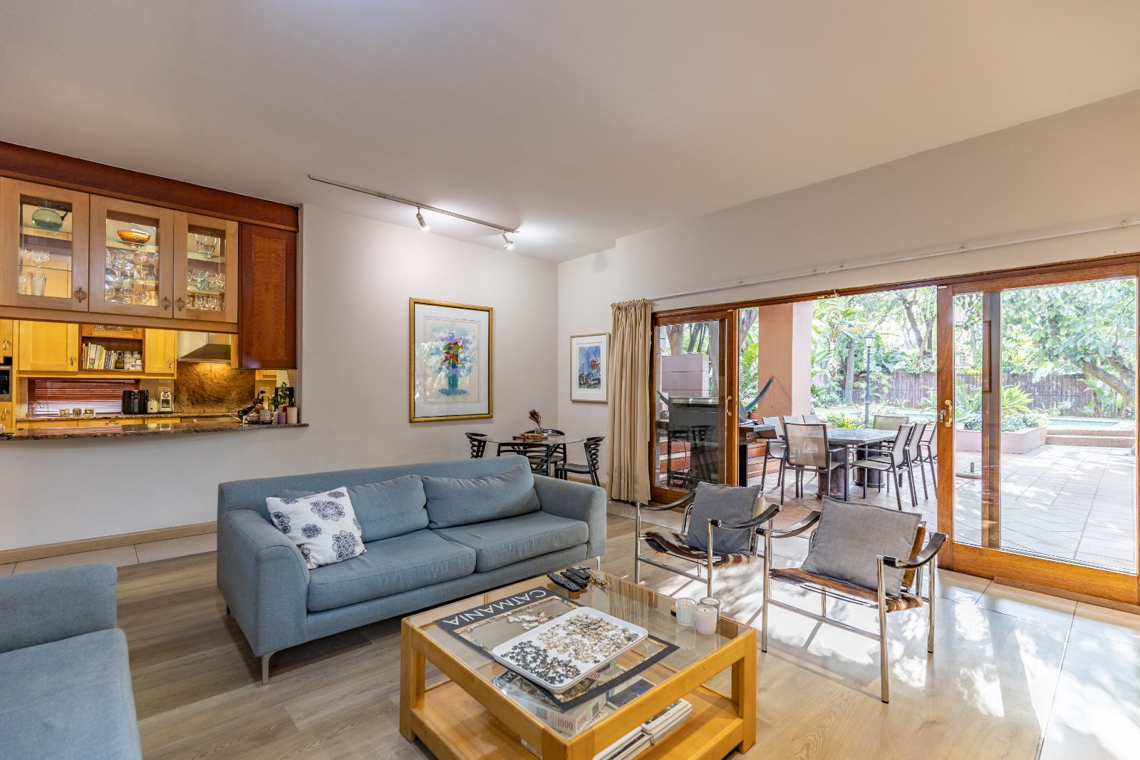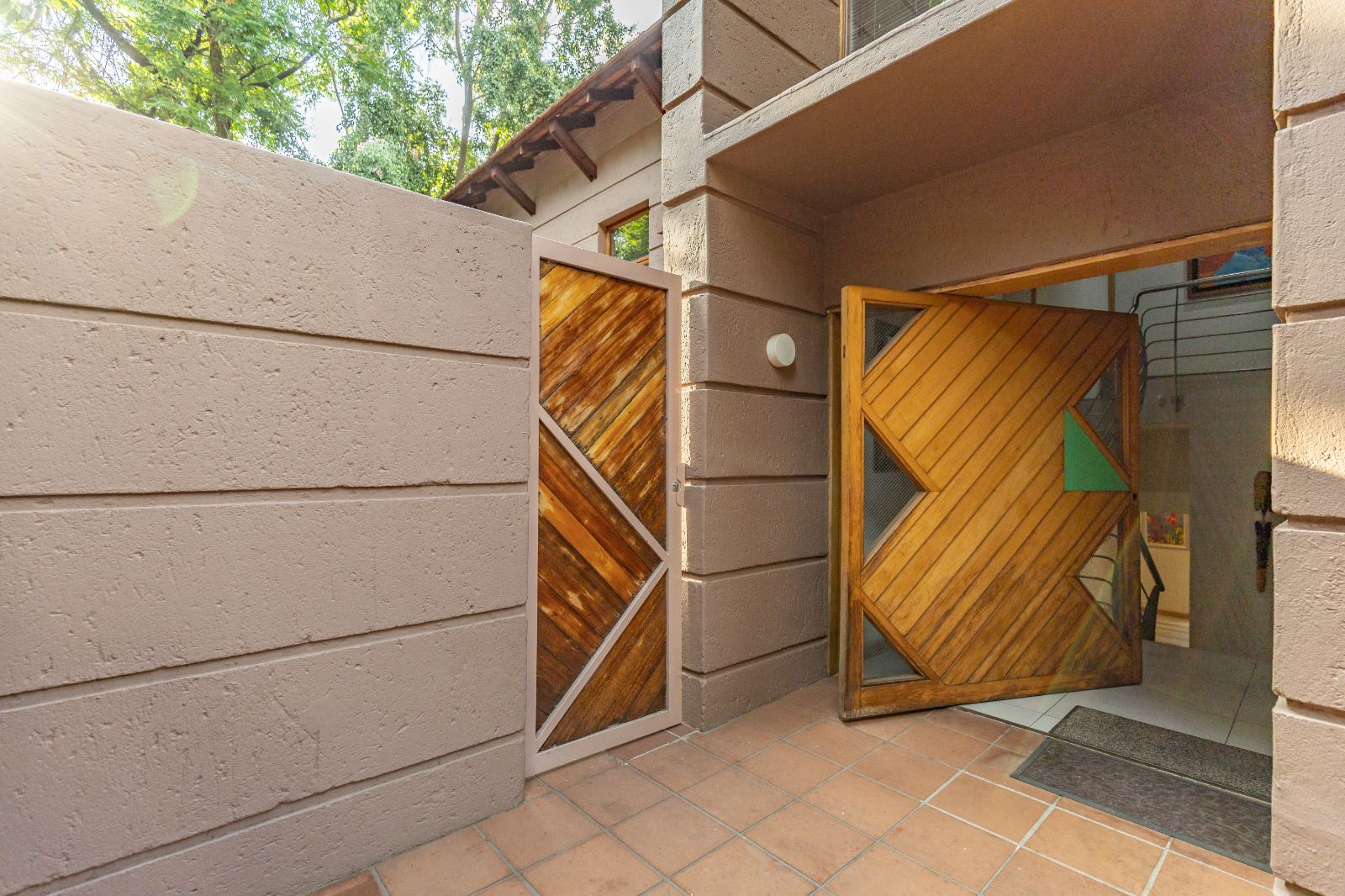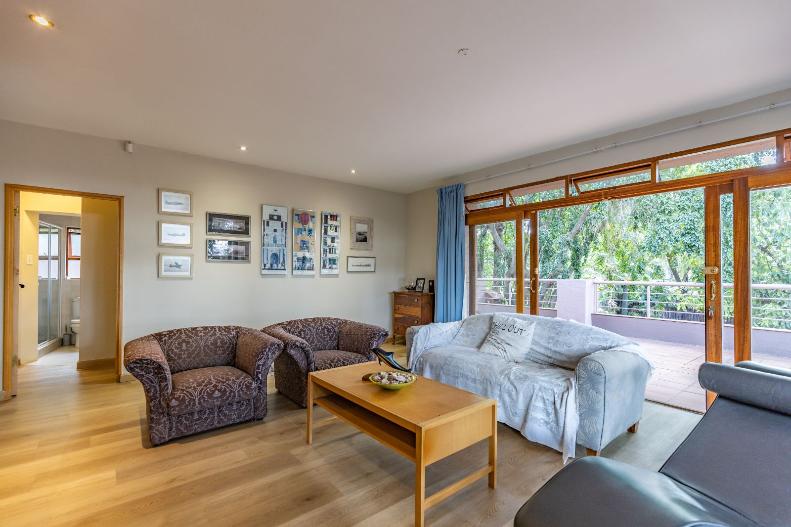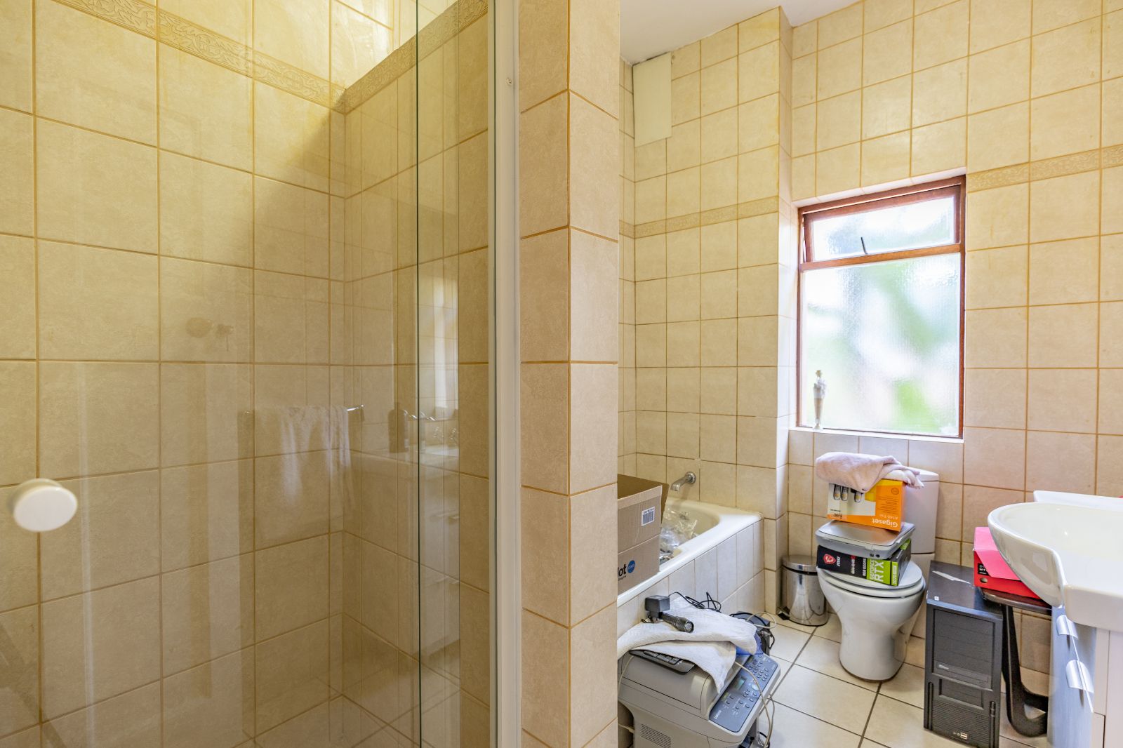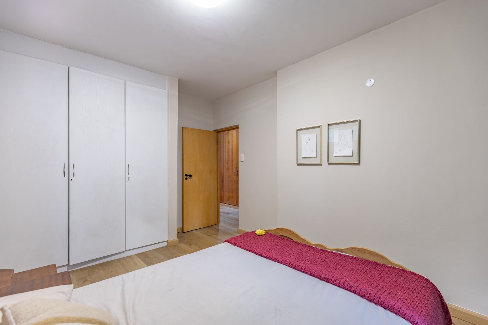 On the ground level, the heart of the home is an exquisitely appointed kitchen featuring integrated appliances, including a fitted fridge and freezer, as well as solid wood and glass display cabinets. With granite countertops, a spacious pantry, and a scullery equipped for a dishwasher, this kitchen offers functionality in a timeless design. The kitchen flows seamlessly into the first of two lounges, complete with built-in glass and wooden cabinets and access to a stunning outdoor entertainment area. This roofed sanctuary includes a Jacuzzi, overlooking a lush, bird-rich garden and a sparkling pool surrounded by mature trees—a peaceful oasis for relaxation or hosting.