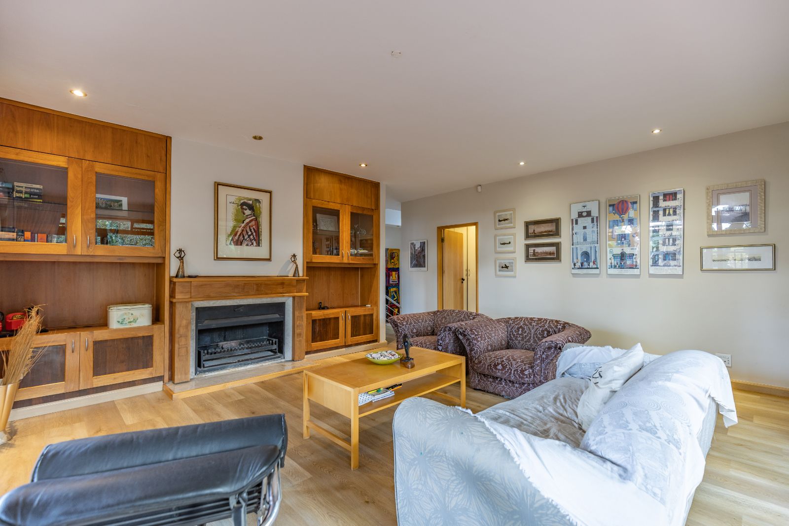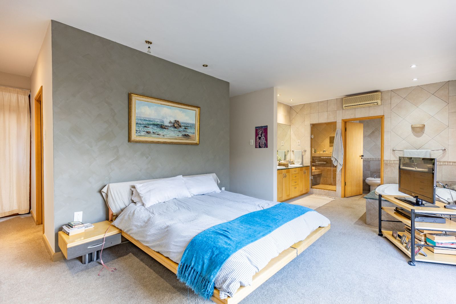 Upstairs, a broad, light-filled staircase leads to the second lounge, complete with a cozy wood-burning fireplace and custom cabinetry. This luxurious living area opens onto two balconies—one roofed for a serene escape or stylish entertaining and an open balcony perfect for sunbathing or stargazing. The upper level also houses four bedrooms, including the magnificent main suite with an open-plan en-suite bathroom, air conditioning, and a gas fireplace. Two additional bedrooms share a full bathroom, while the fourth bedroom boasts its own en-suite bathroom and access to a private terrace with charming garden views.
