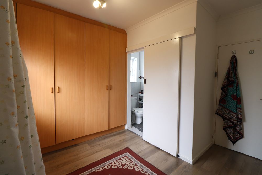 The second bedroom easily fits a double bed and includes shelving with ample cupboard space.