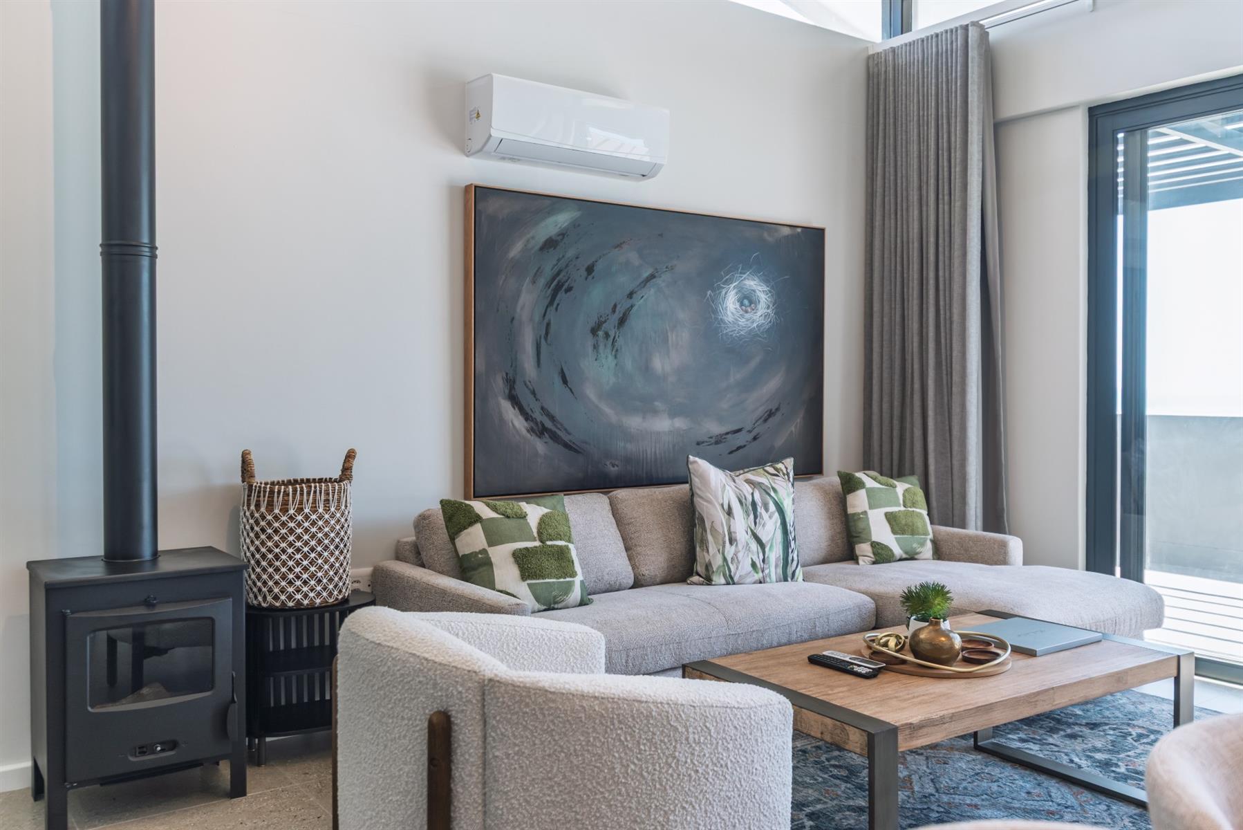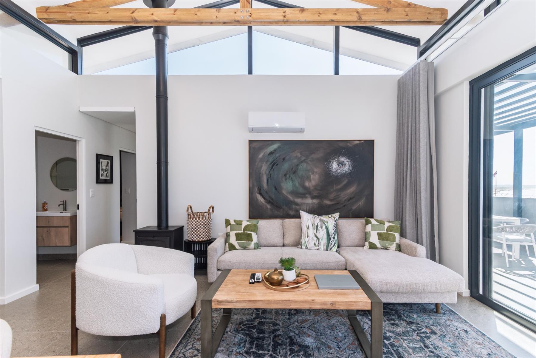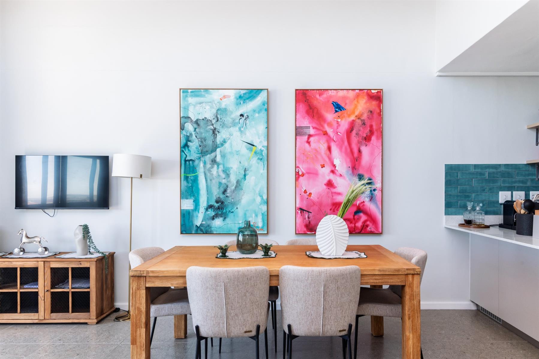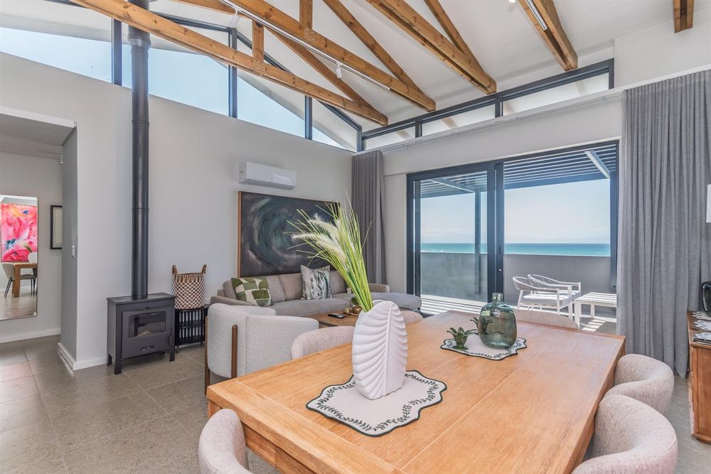 The open-plan layout seamlessly connects the lounge and dining room to a modern kitchen, equipped with granite tops, a gas hob, and an under-counter oven. Enjoy effortless entertaining with a dishwasher and a fridge / freezer included to keep the vibes chilled and clean. Natural light floods the space through skylight windows and sliding doors, enhancing the inviting atmosphere. Step outside to your private patio taking in the fresh sea air, perfect for morning coffee or evening gatherings.