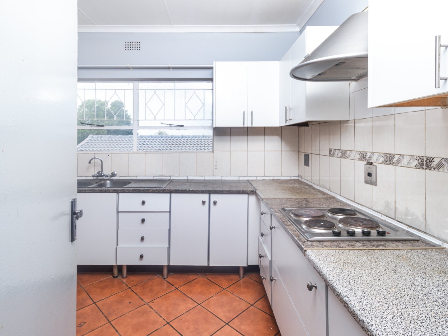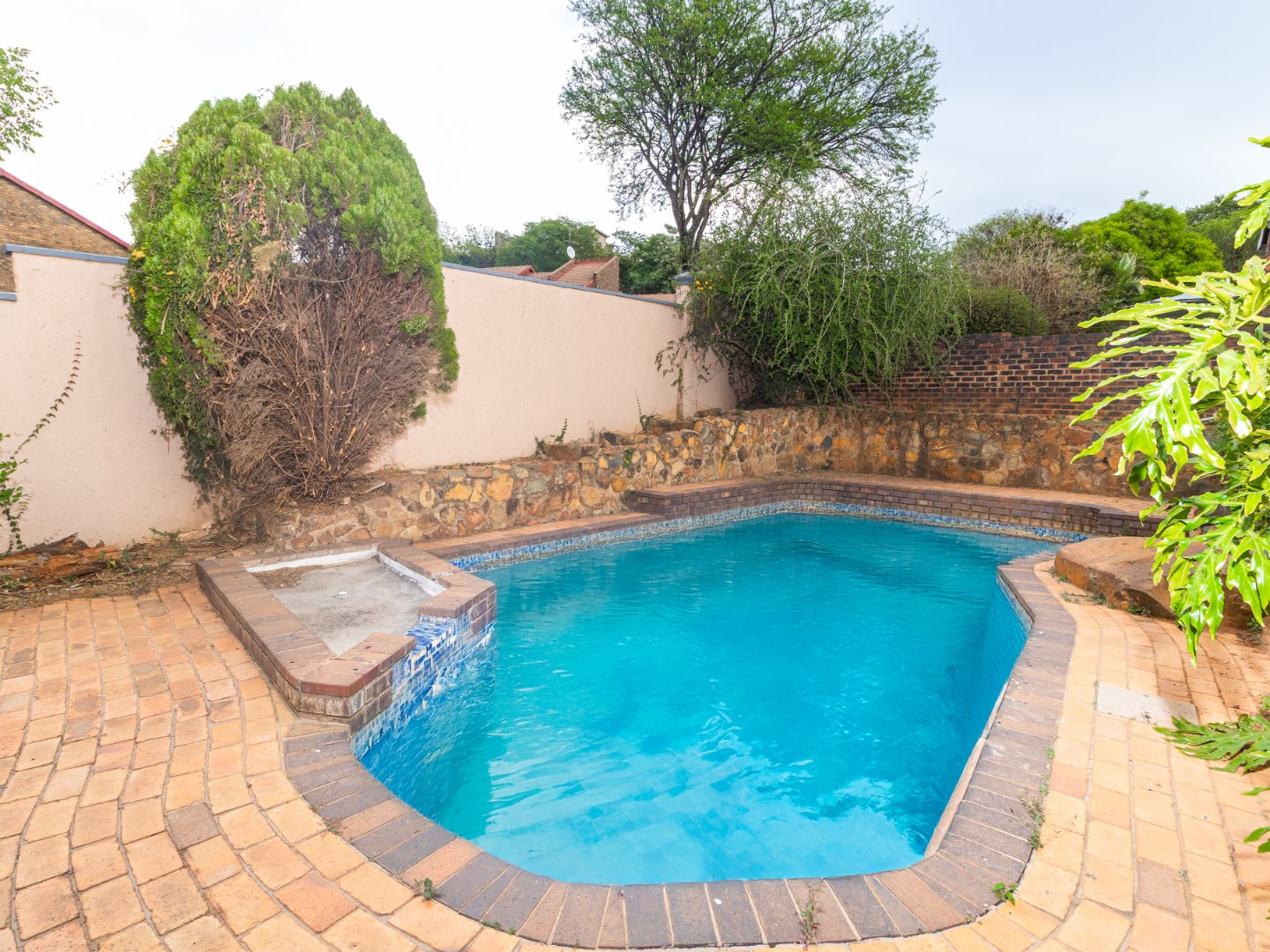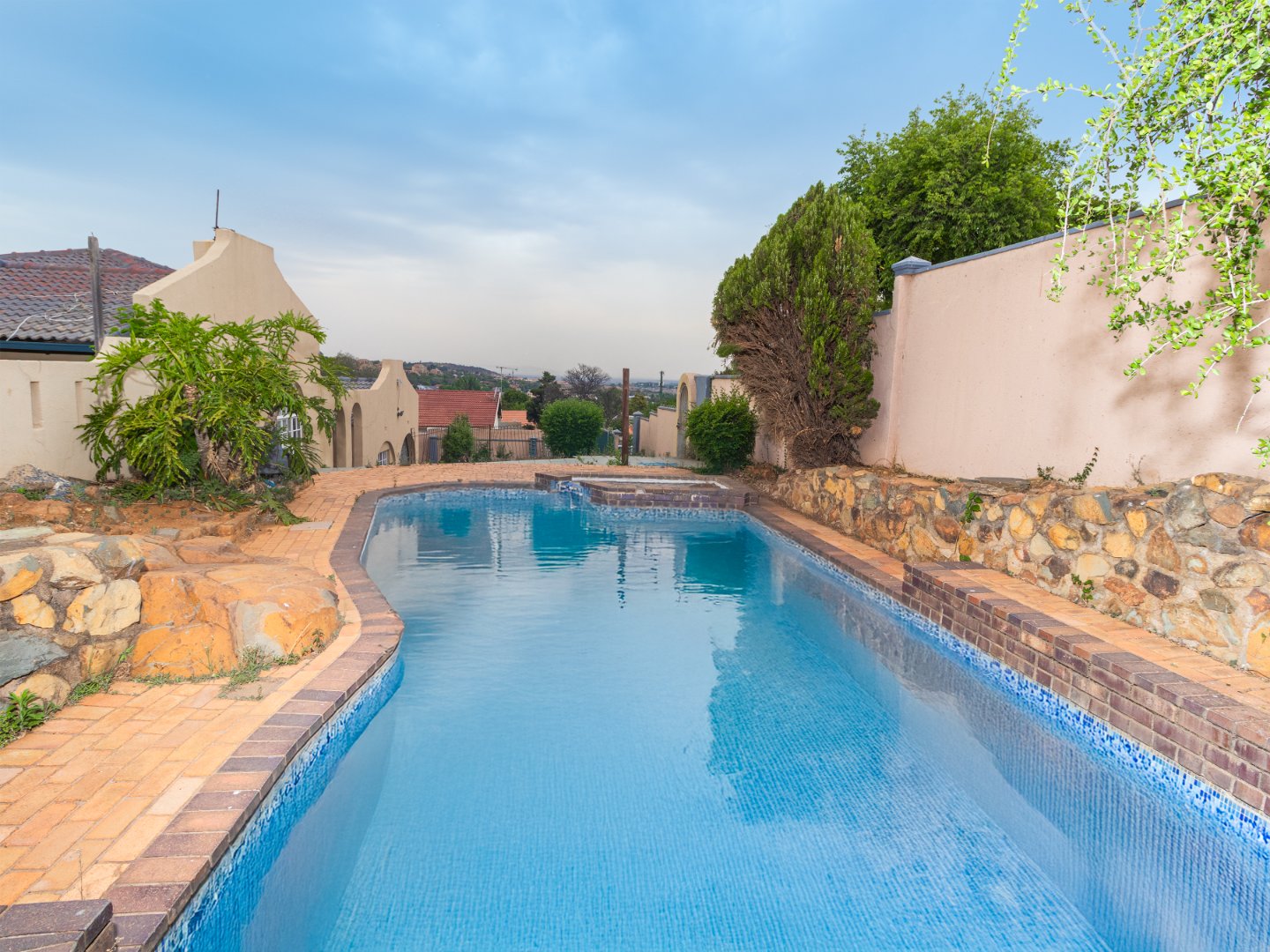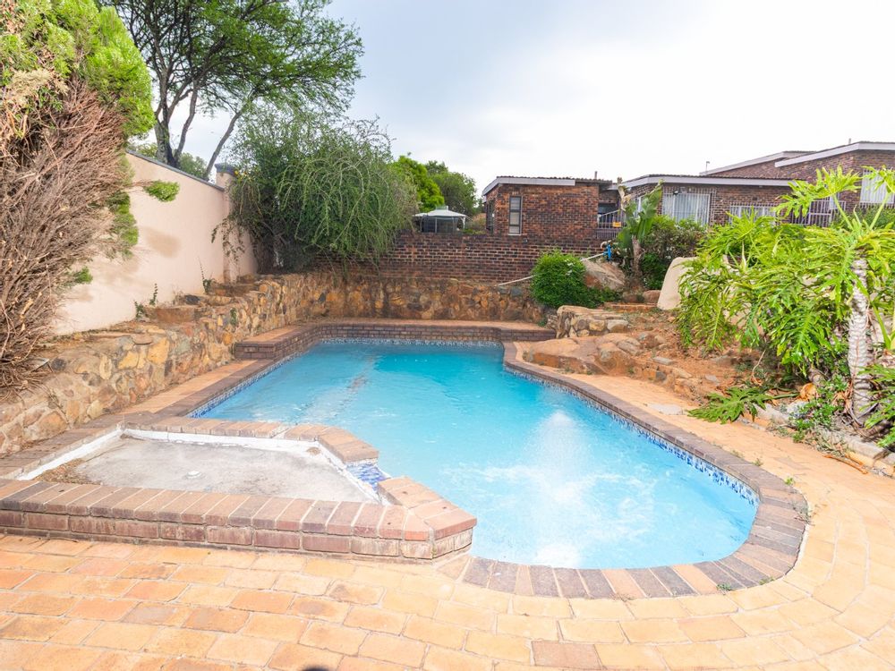 The tiled lounge flows into the tiled dining room, then followed by a tiled Kitchen with built-in cupboards. There are 4 tiled Bedrooms with built-in cupboards, master consist of an en suite bathtub, basin,shower and loo. The 2nd bathroom consist of a bathtub, basin and loo. The flatlet has its own Shower, basin and loo. A big store room, double garage, ample parking space and a sparkling swimming pool to enjoy those summer days.