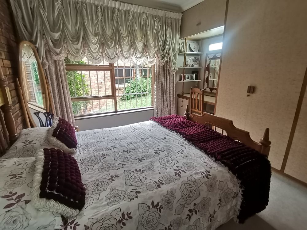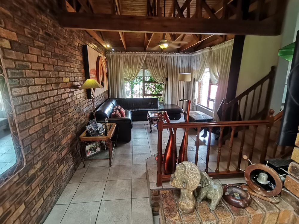 The kitchen is both stylish and functional, offering granite countertops, ample cupboard space, and a distinctive double-volume ceiling with exposed wooden beams. A separate scullery and laundry keep the main kitchen clutter-free. The kitchen flows effortlessly into the open-plan dining area, ideal for family meals and entertaining.