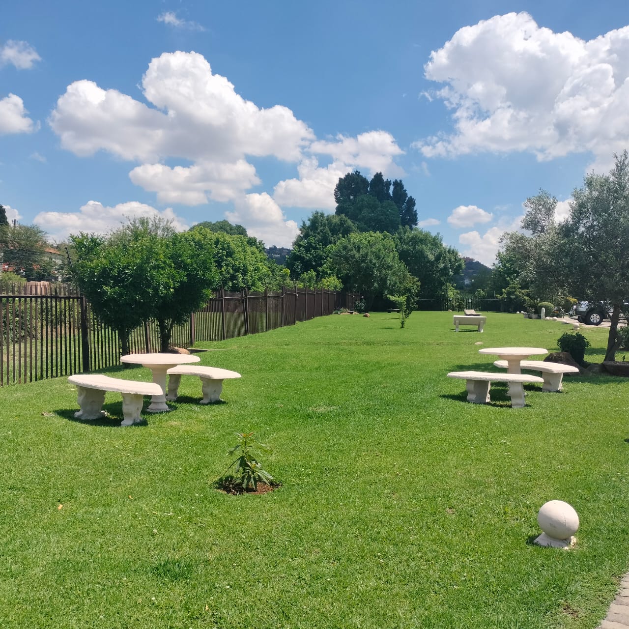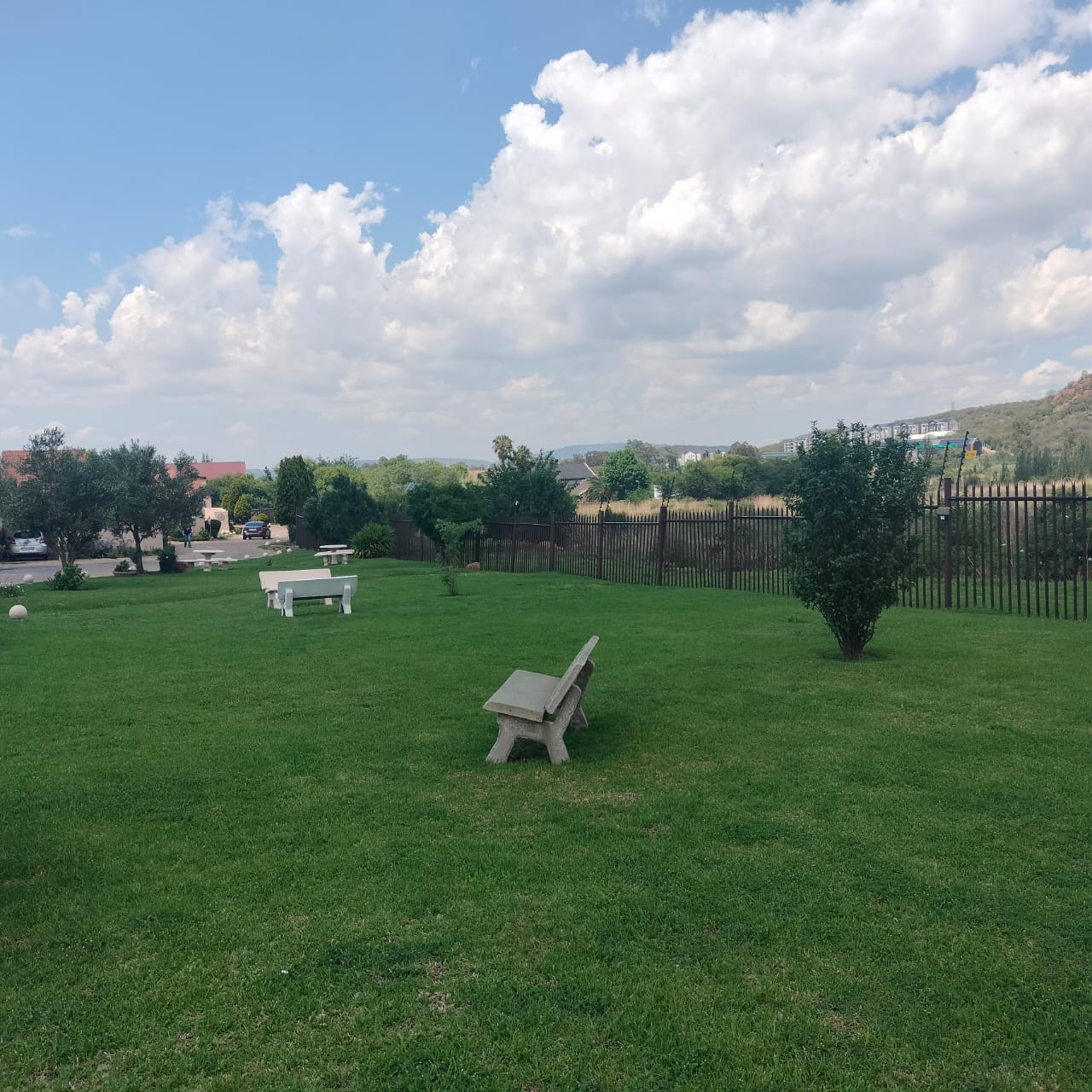 The complex features beautifully maintained gardens, adding to the peaceful and well-kept environment.