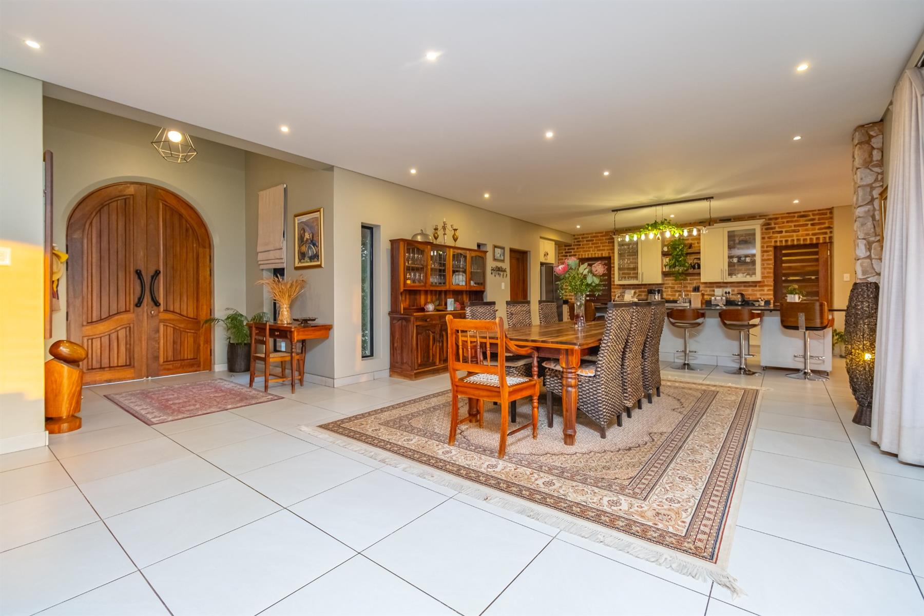 The professional kitchen is a true centerpiece, showcasing a NeroNite granite island with seating for five. This rare, high-end South African granite, the hardest and darkest, with near-zero absorption has been installed in a luxurious leather finish. The space is further enhanced by a five-burner gas hob with electric oven, a well-appointed pantry, and a private scullery with ample room for all appliances. A breakfast hub and cozy corner make mornings special, while the entertainment areas flow effortlessly outdoors. Two gas fireplaces and a Hydrofire wood-burning fireplace add warmth, complemented by a large covered patio, quality South African braai area, and manicured lawn with a charming fire pit at the garden’s edge, ideal for relaxed evenings outdoors.