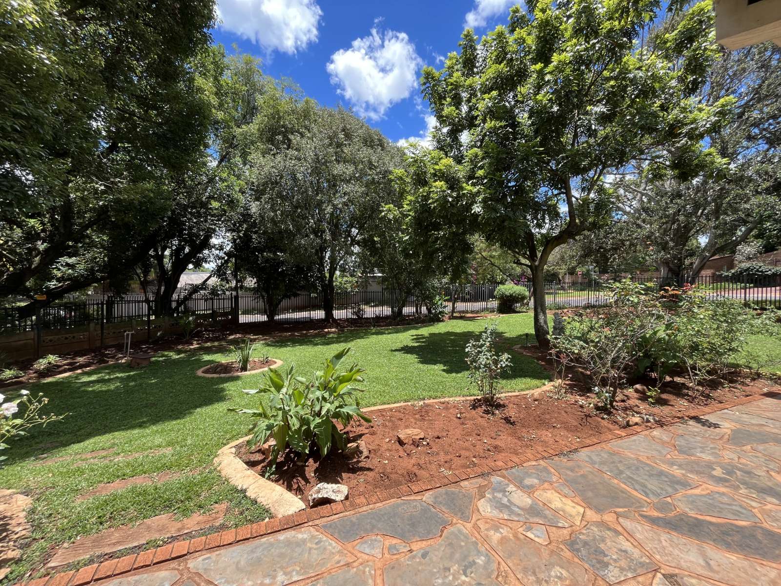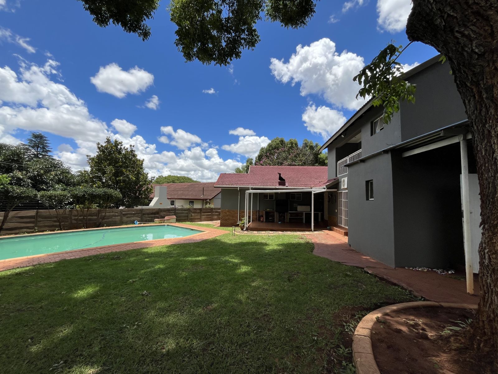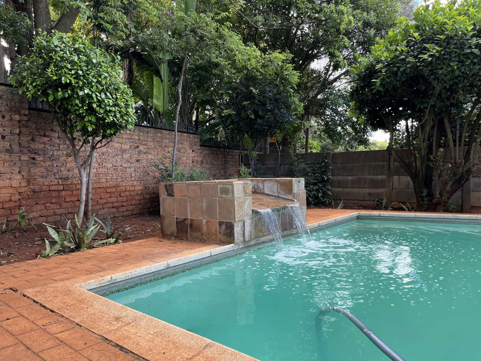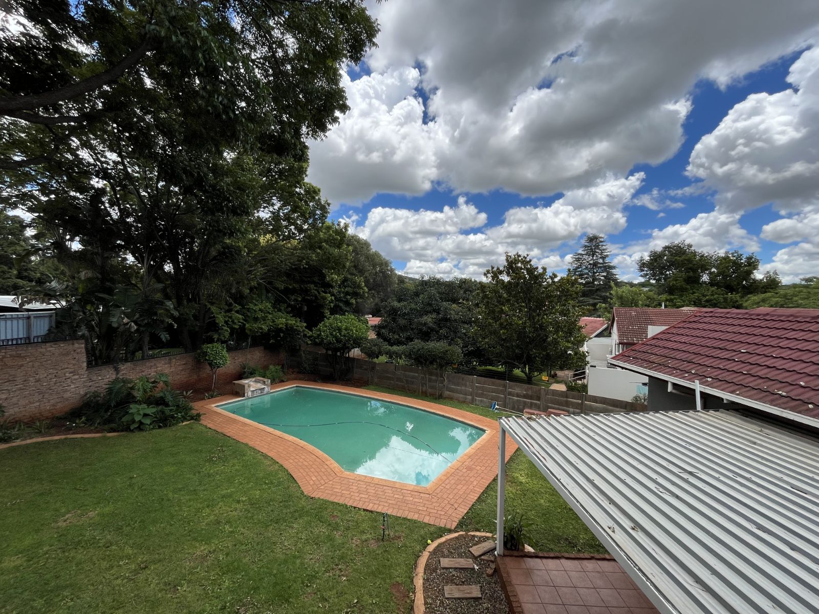 Outdoors, the property truly comes into its own. A sparkling swimming pool with a water feature, complemented by a built-in braai, creates an inviting setting for family gatherings and relaxed entertaining. The large, established garden offers ample space for children, pets, or future enhancements.