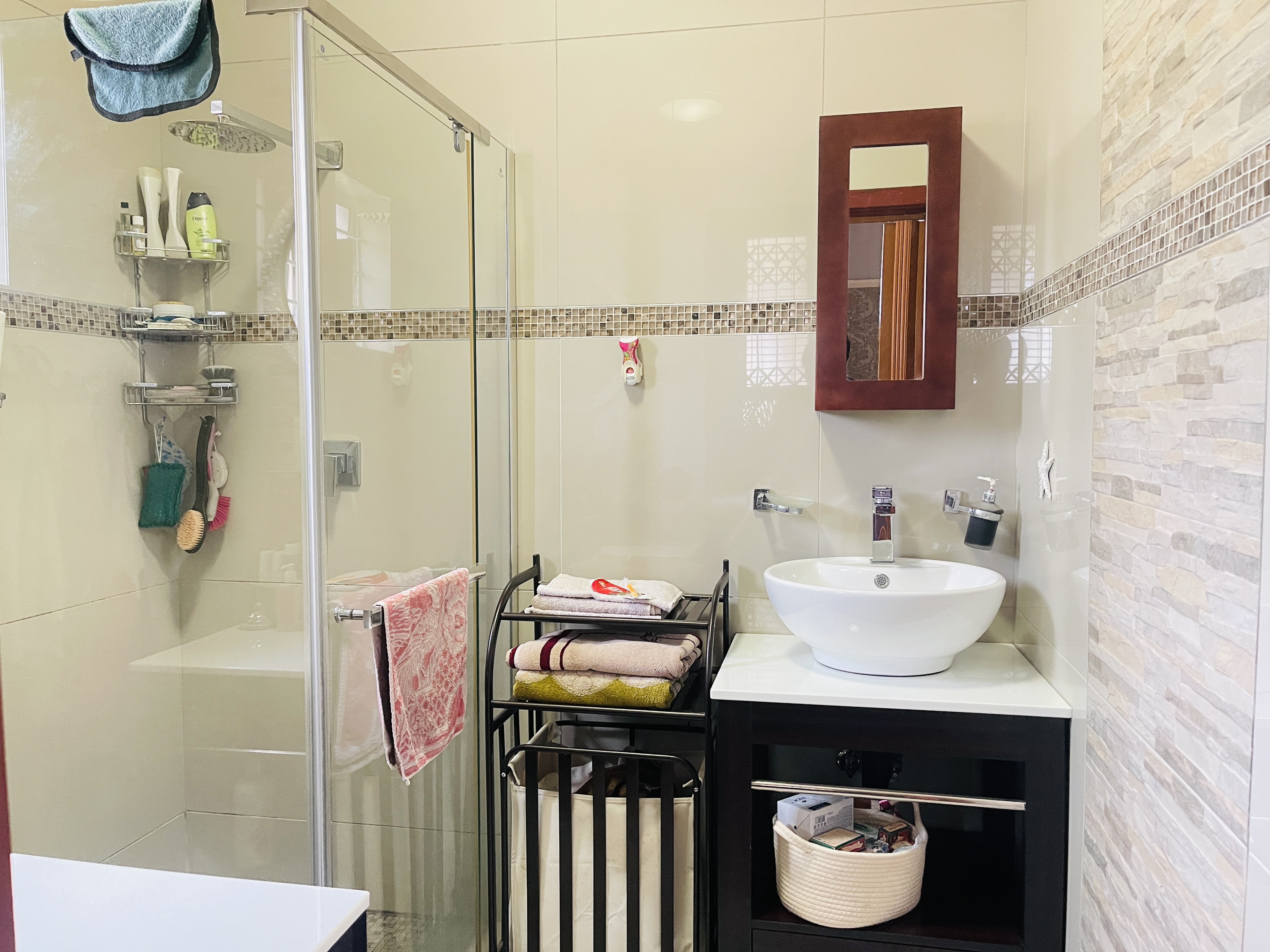 A well-kept bathroom setup with a separate toilet and a beautifully maintained shower