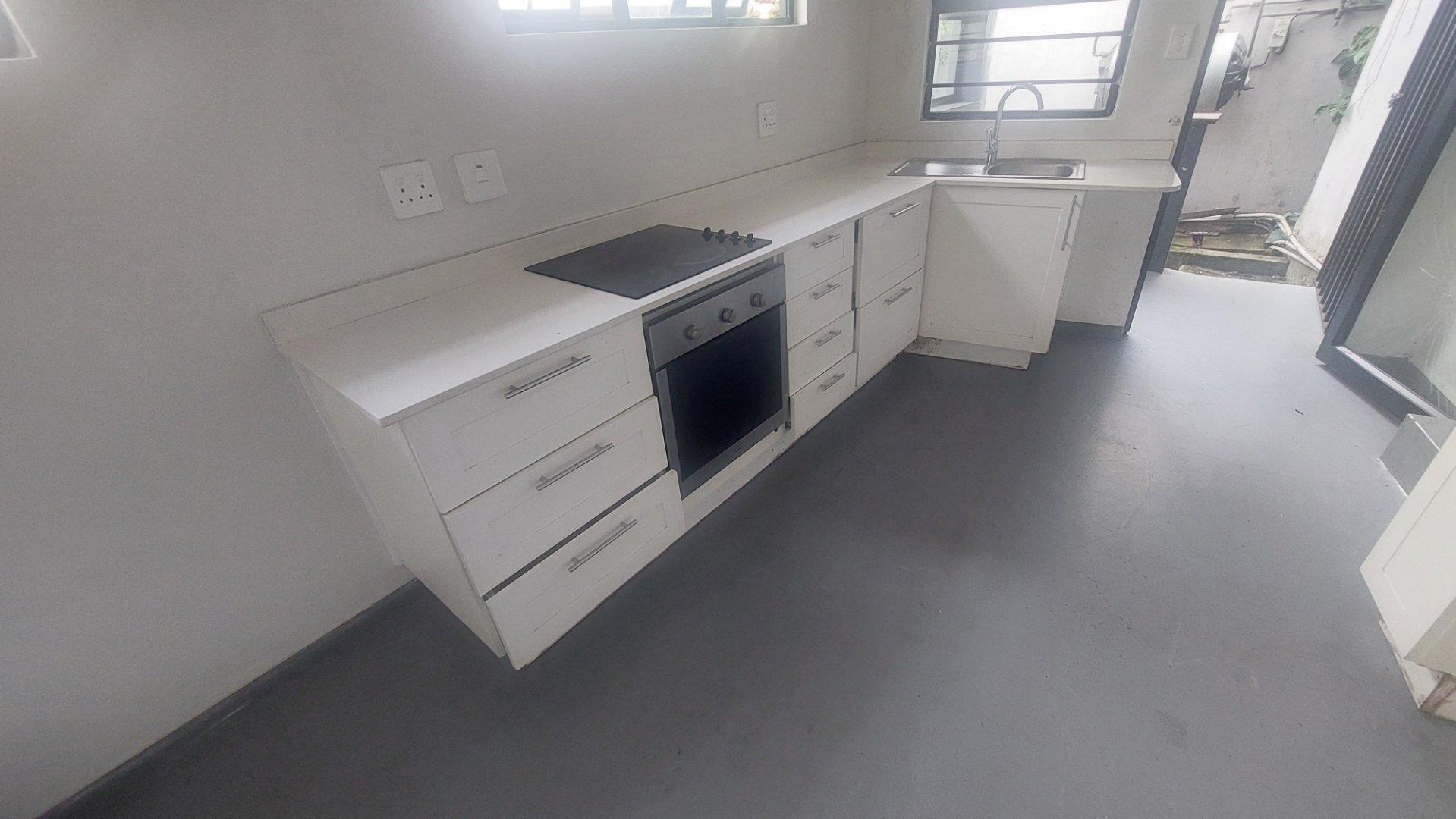 This garden cottage consists of a spacious bedroom with built in cupboards which leads to a full standing shower in the bathroom. The lounge is open plan with kitchen. Kitchen comes with stove and fully fitted modern cupboards.