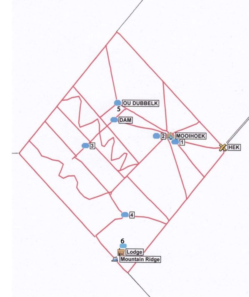 -3 active boreholes, 2 water reservoirs, and 6 watering holes.
