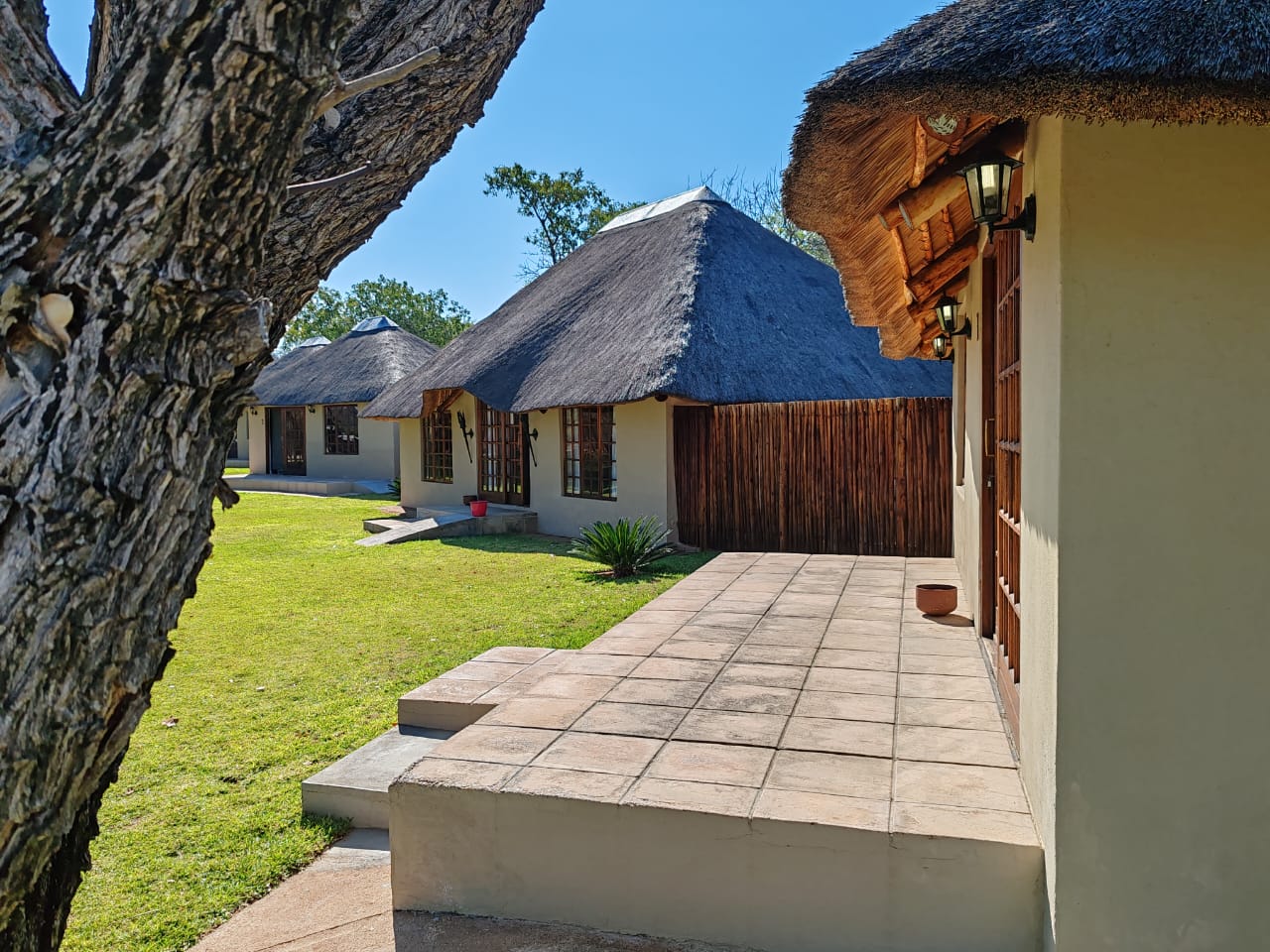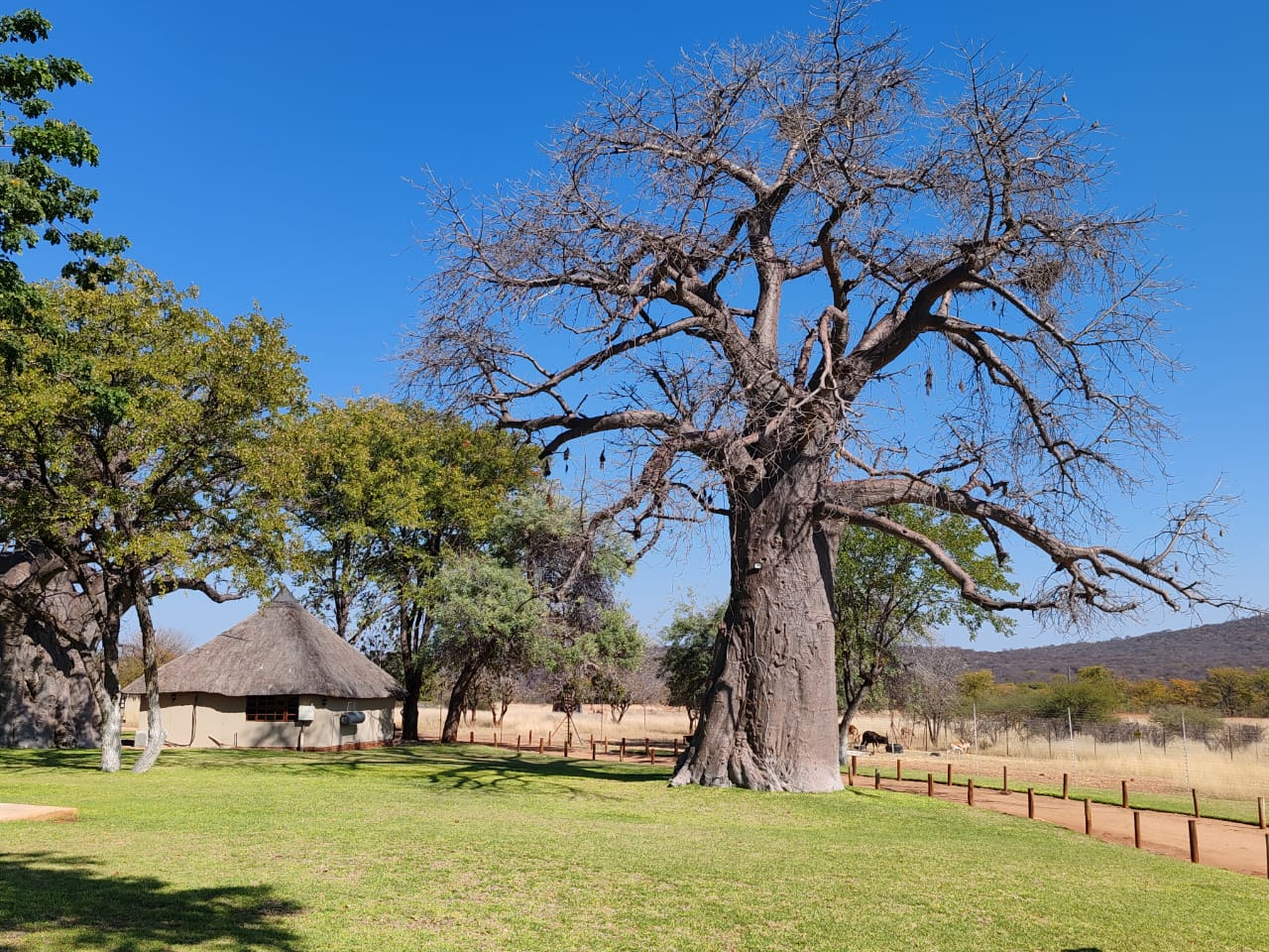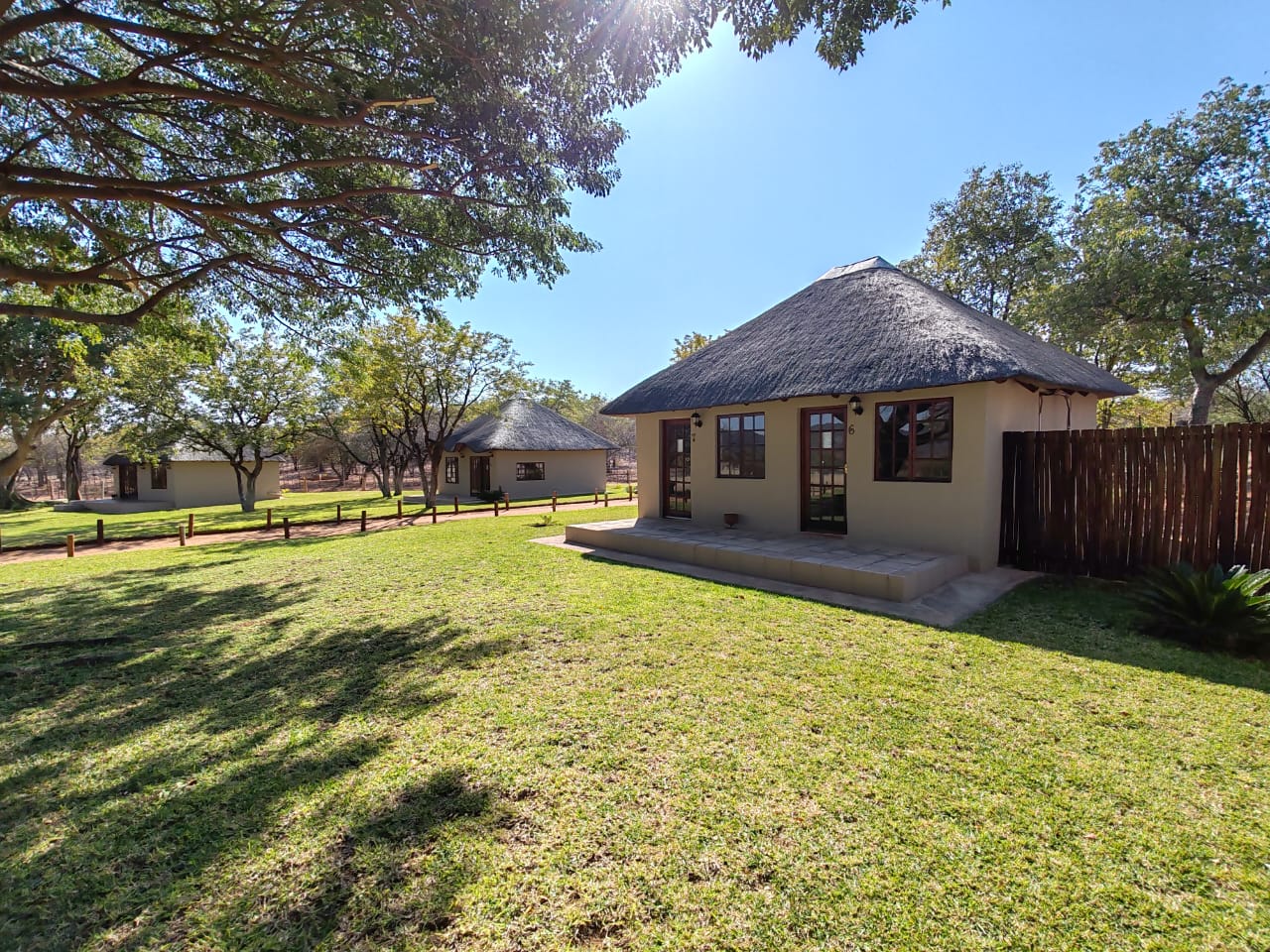 The chalets can sleep up to 30 people. Built in a generous semi circle they face green lawns, an ancient Baobab and the