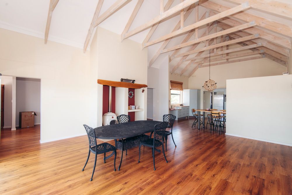 Top Floor: The heart of the home, features an expansive open-plan lounge, bar area, and kitchen. The bar comes equipped with a built-in braai, and the lounge is complemented by a jet-master fireplace. Adjacent to the lounge is a spacious dining room. The kitchen offers a built-in gas hob, electric oven, and a large scullery.