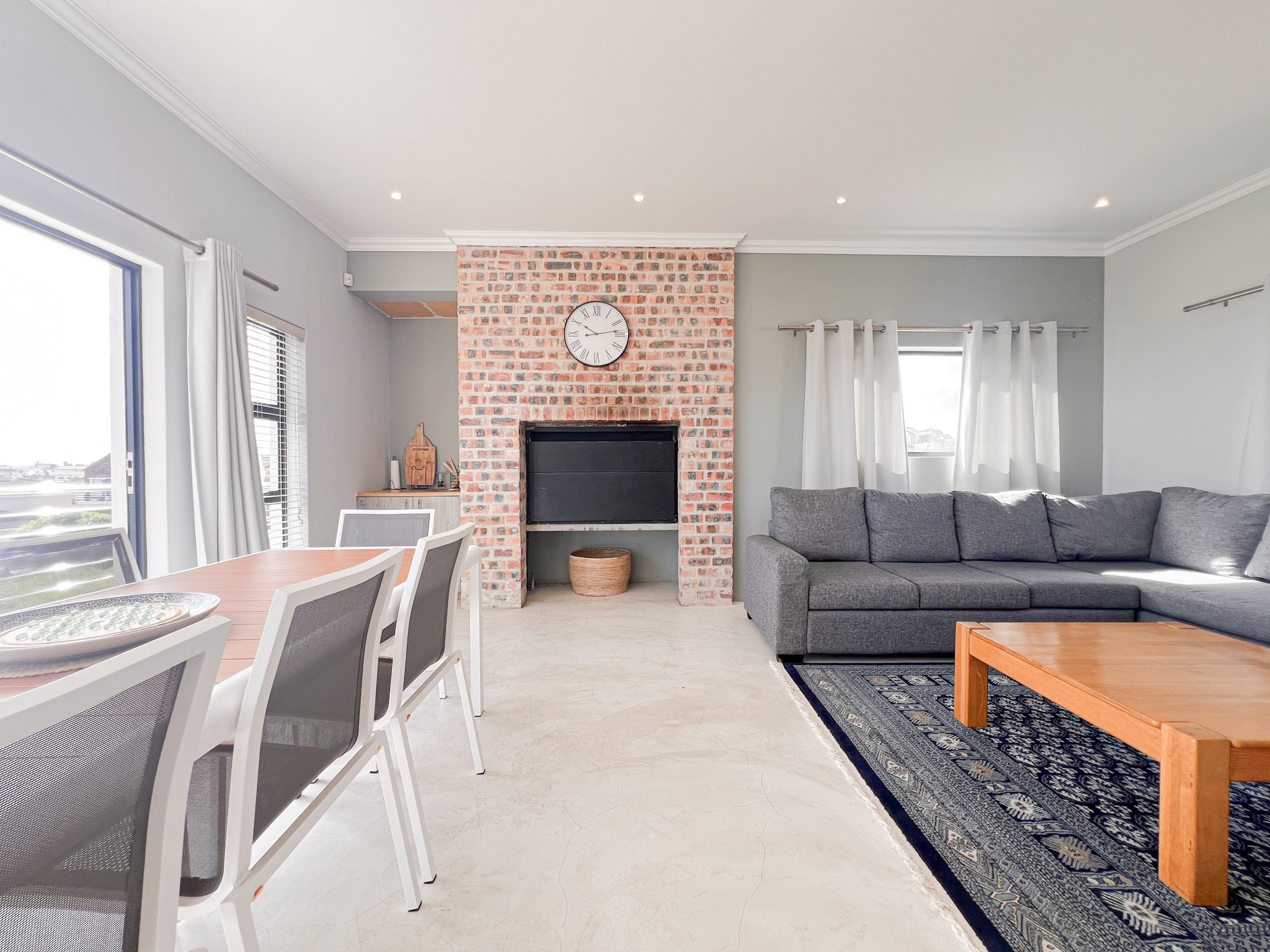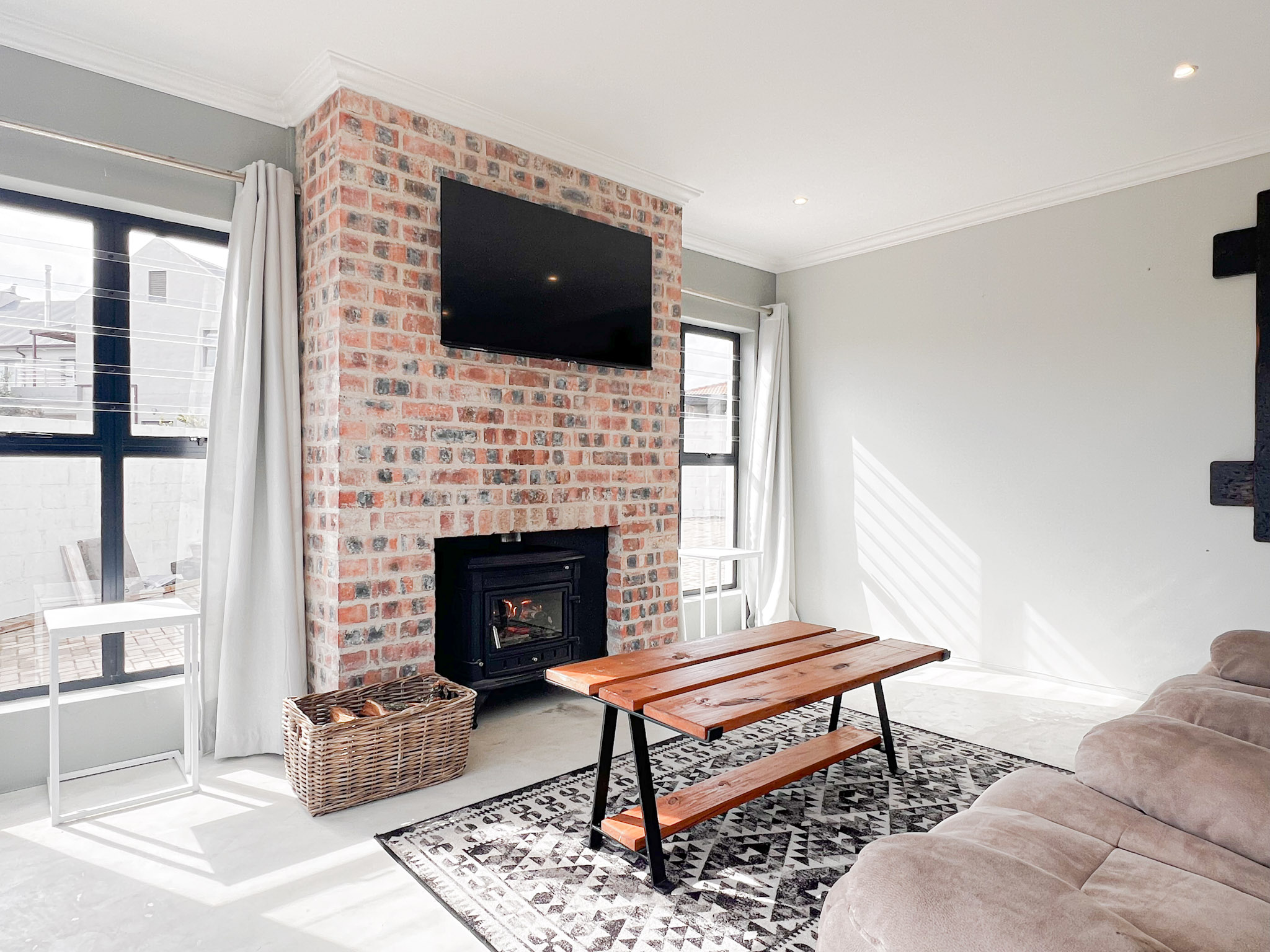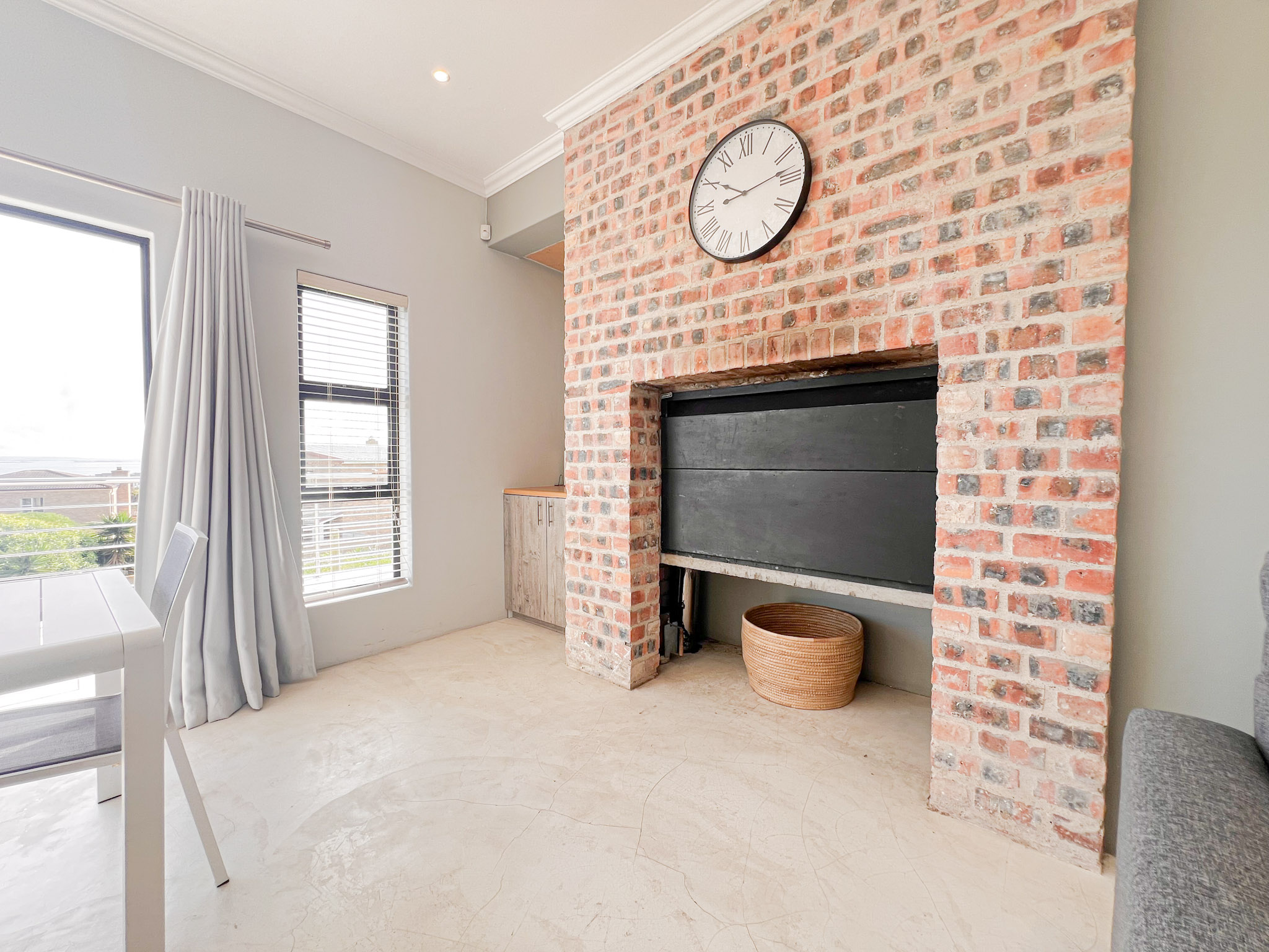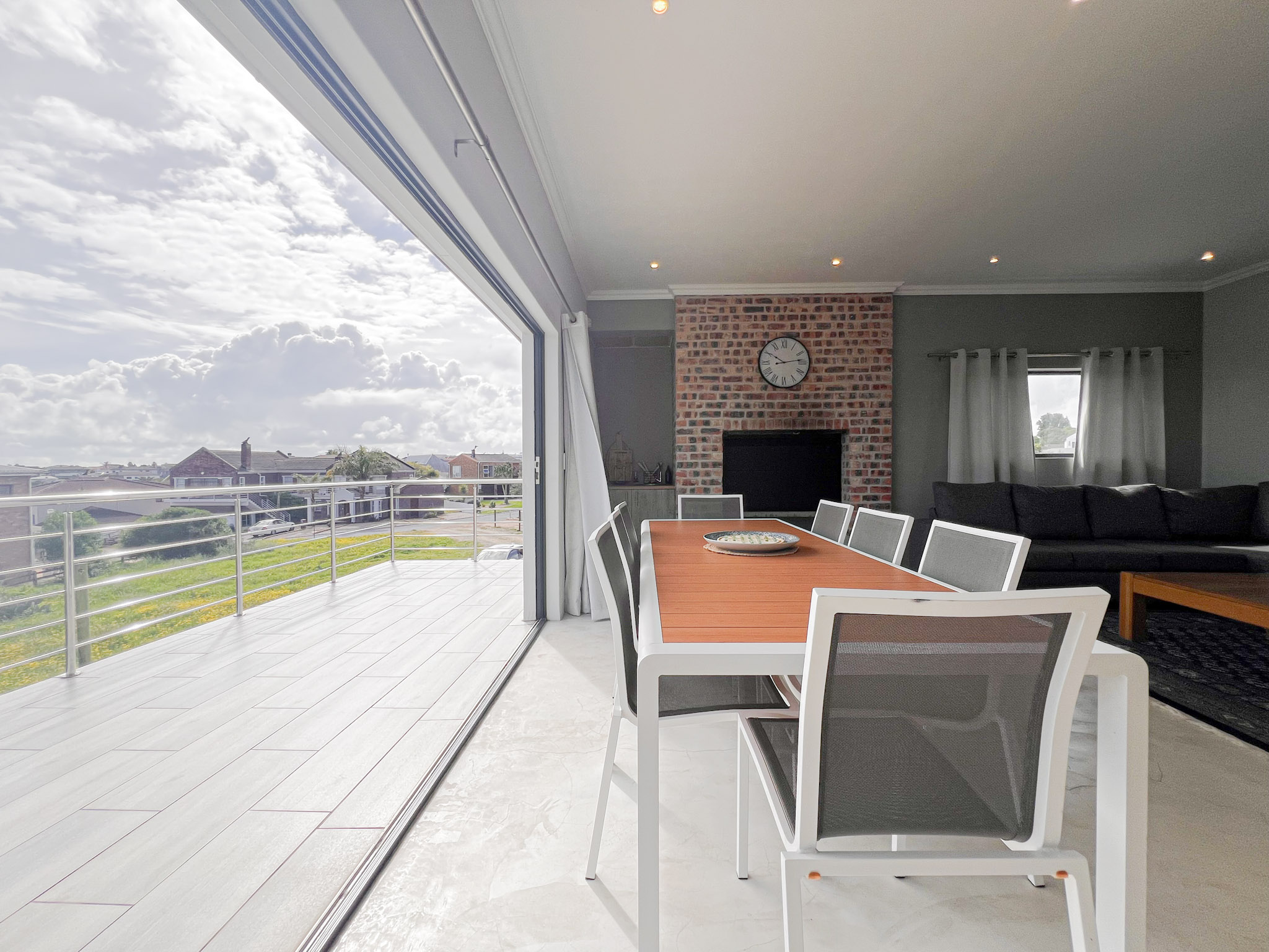 A sunny upstairs lounge with an indoor braai – perfect for entertaining no matter the weather