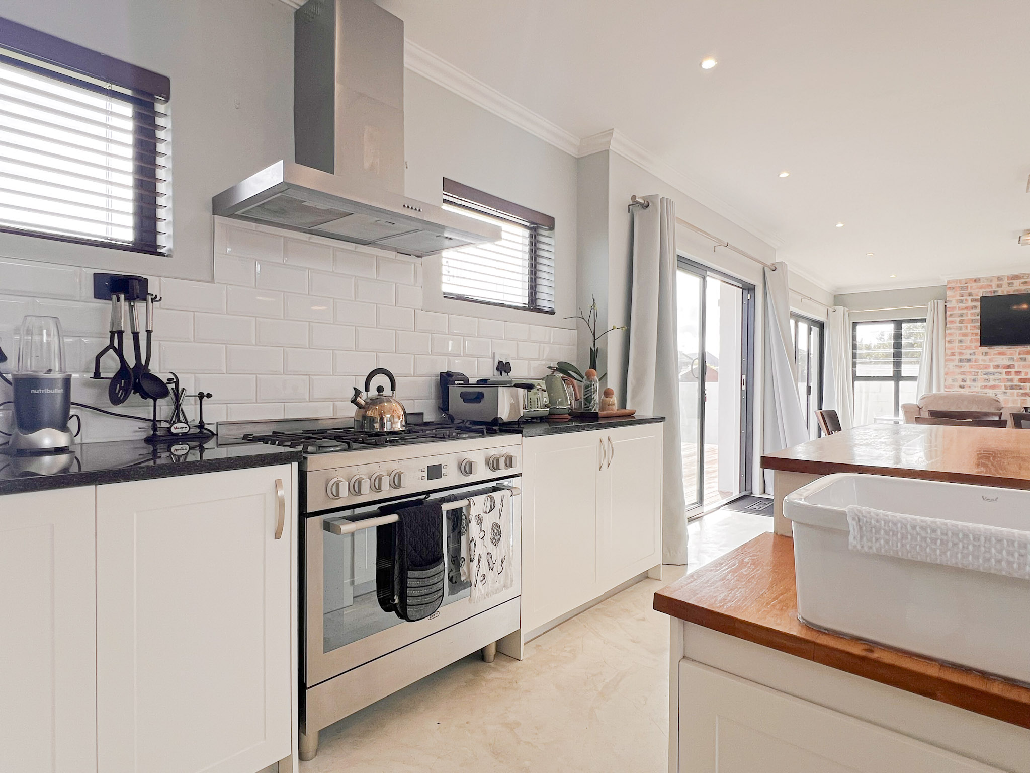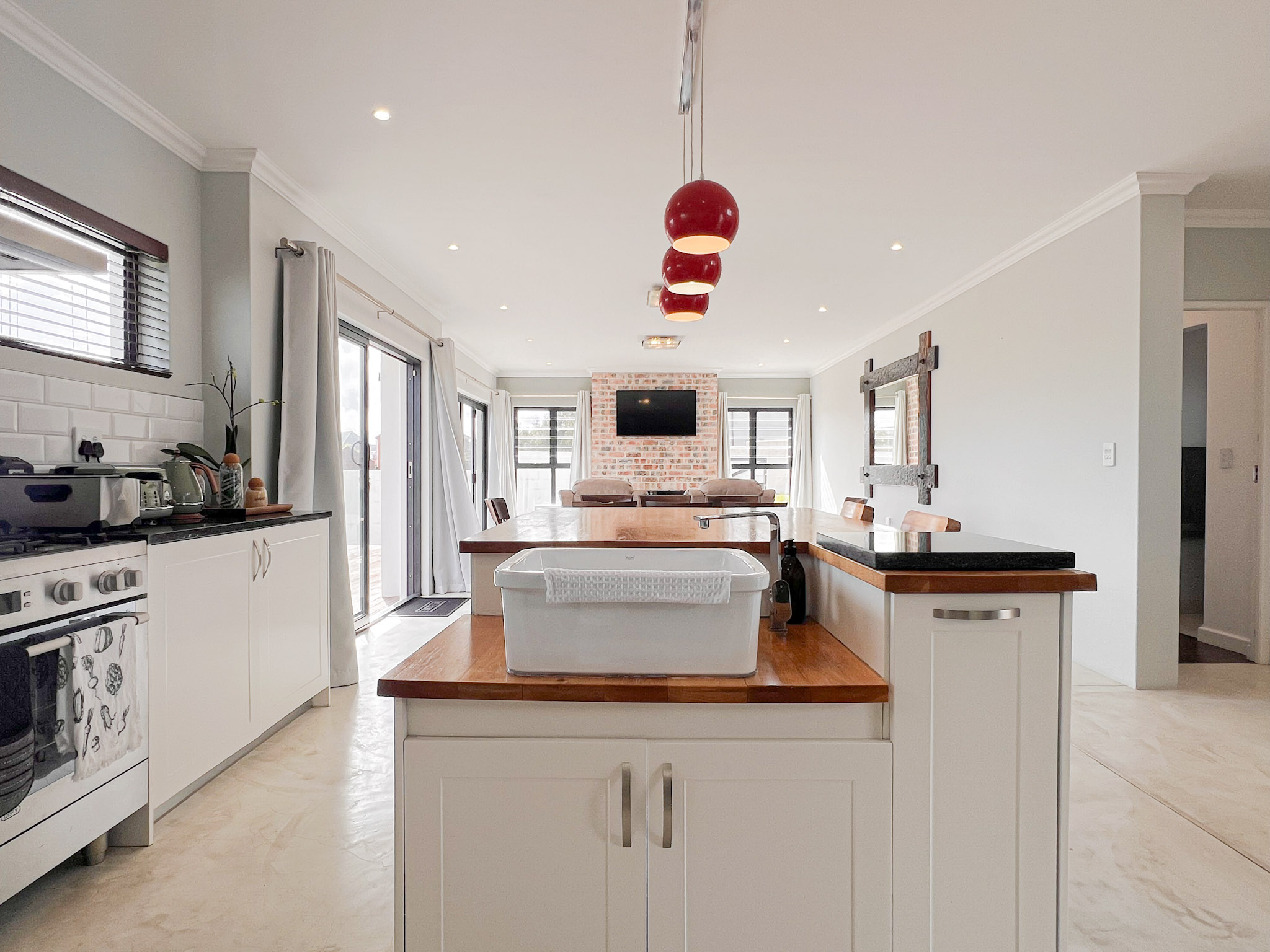 Open-plan kitchen and lounge, with a cozy built-in fireplace for chilly Langebaan evenings