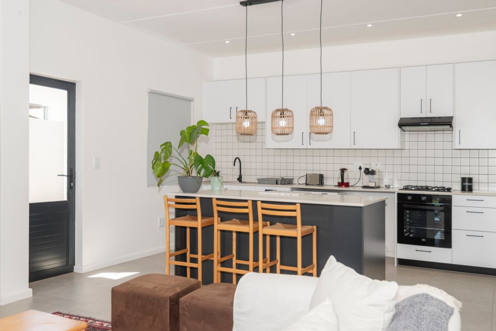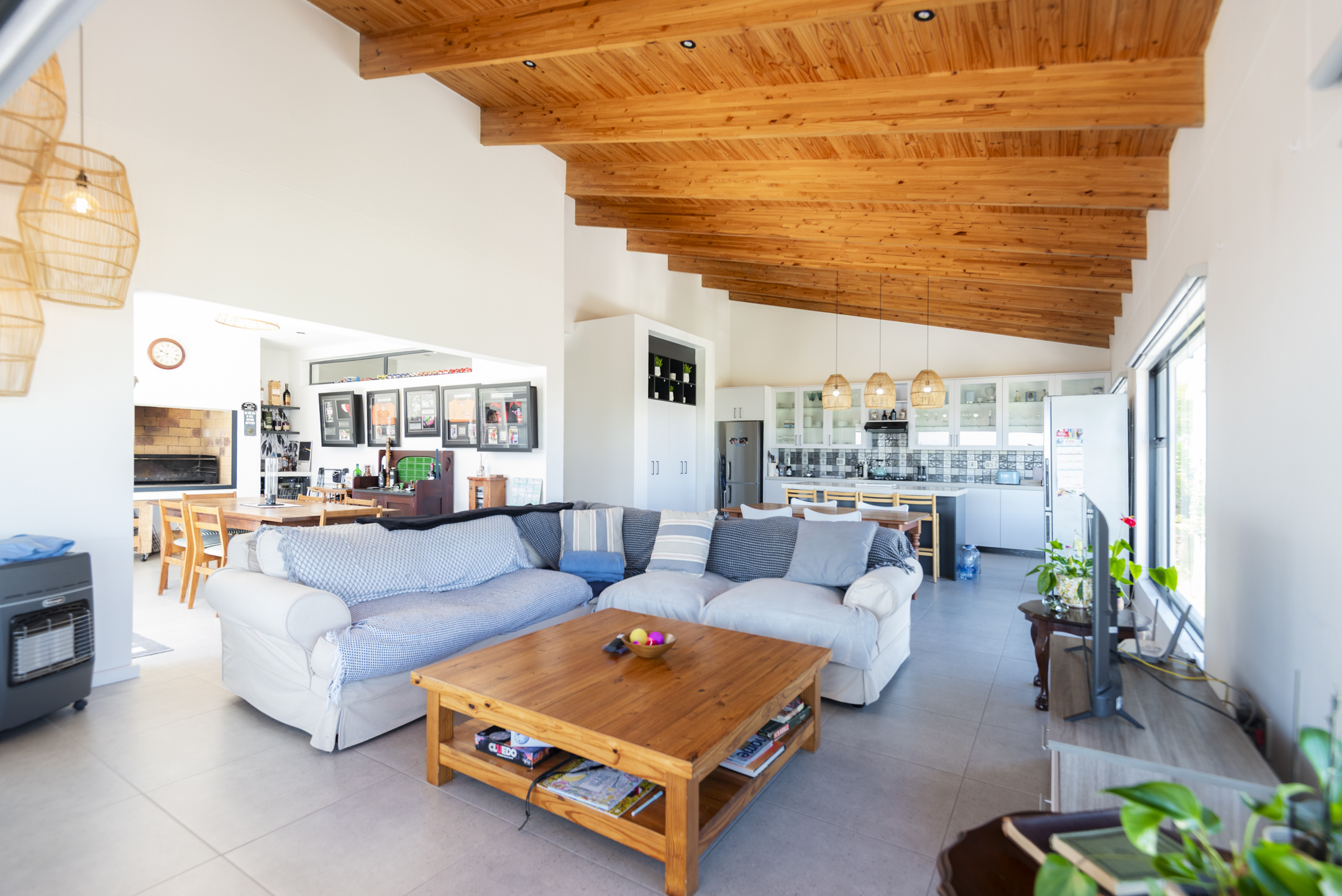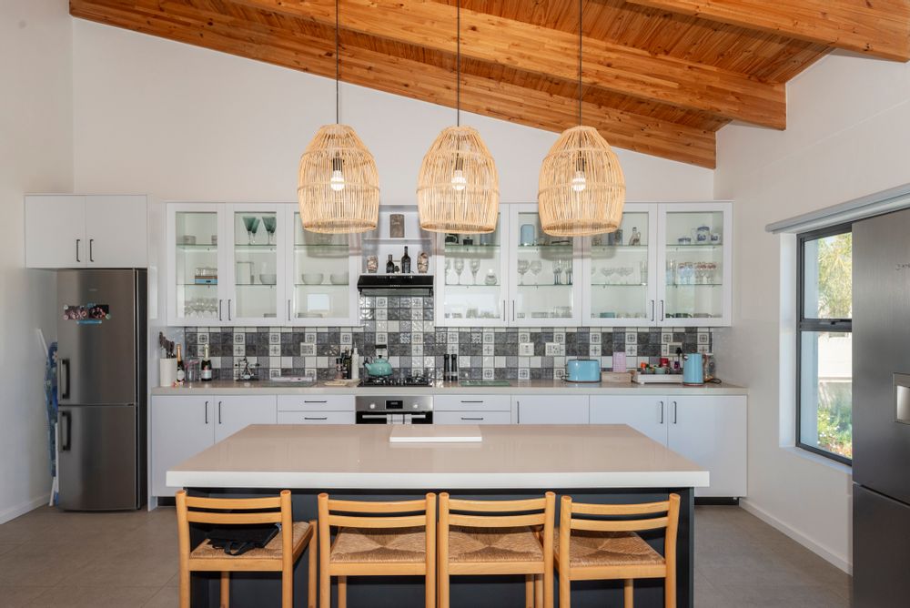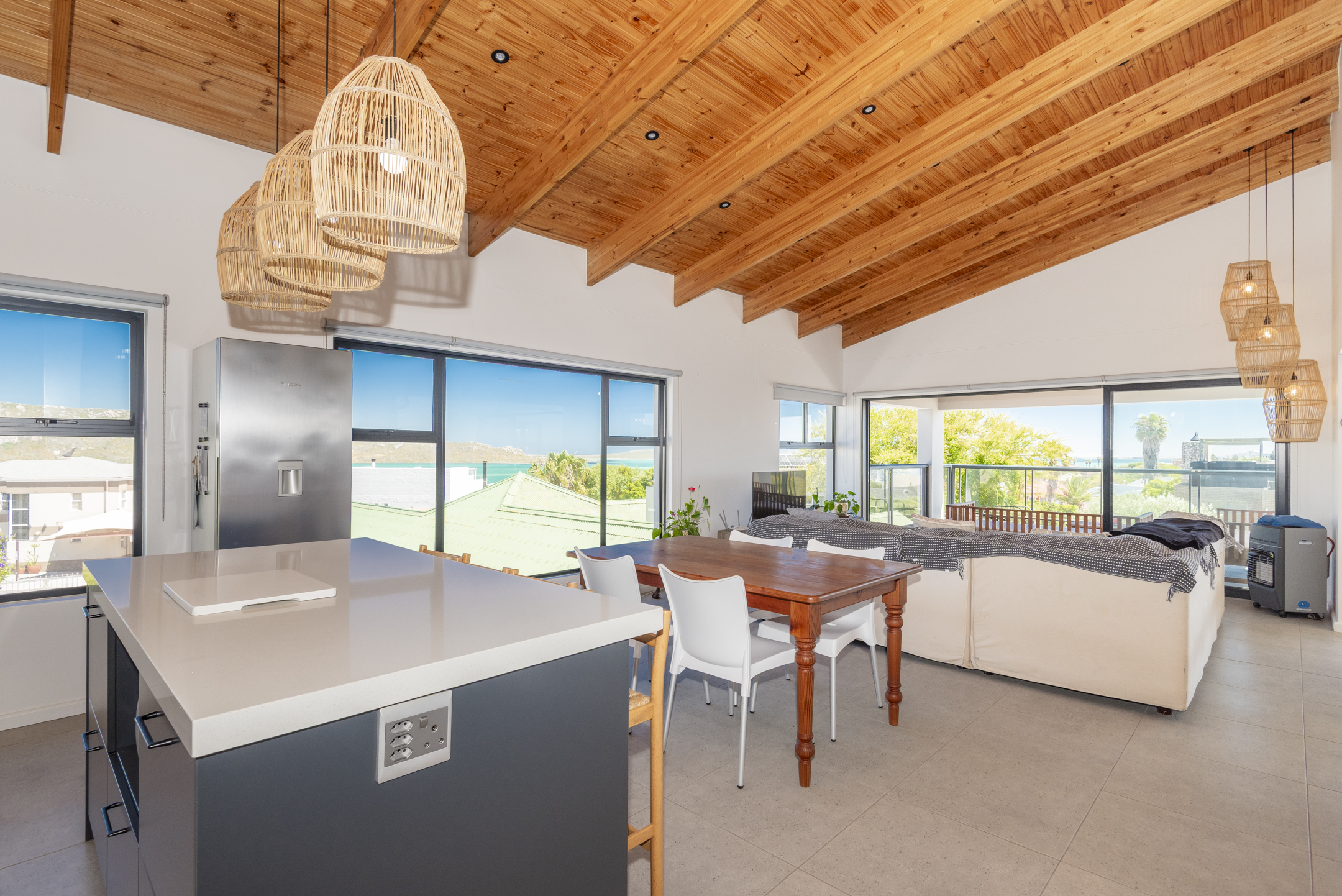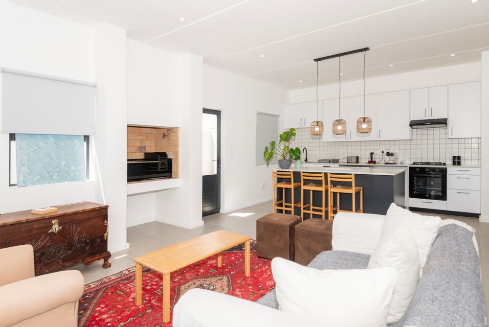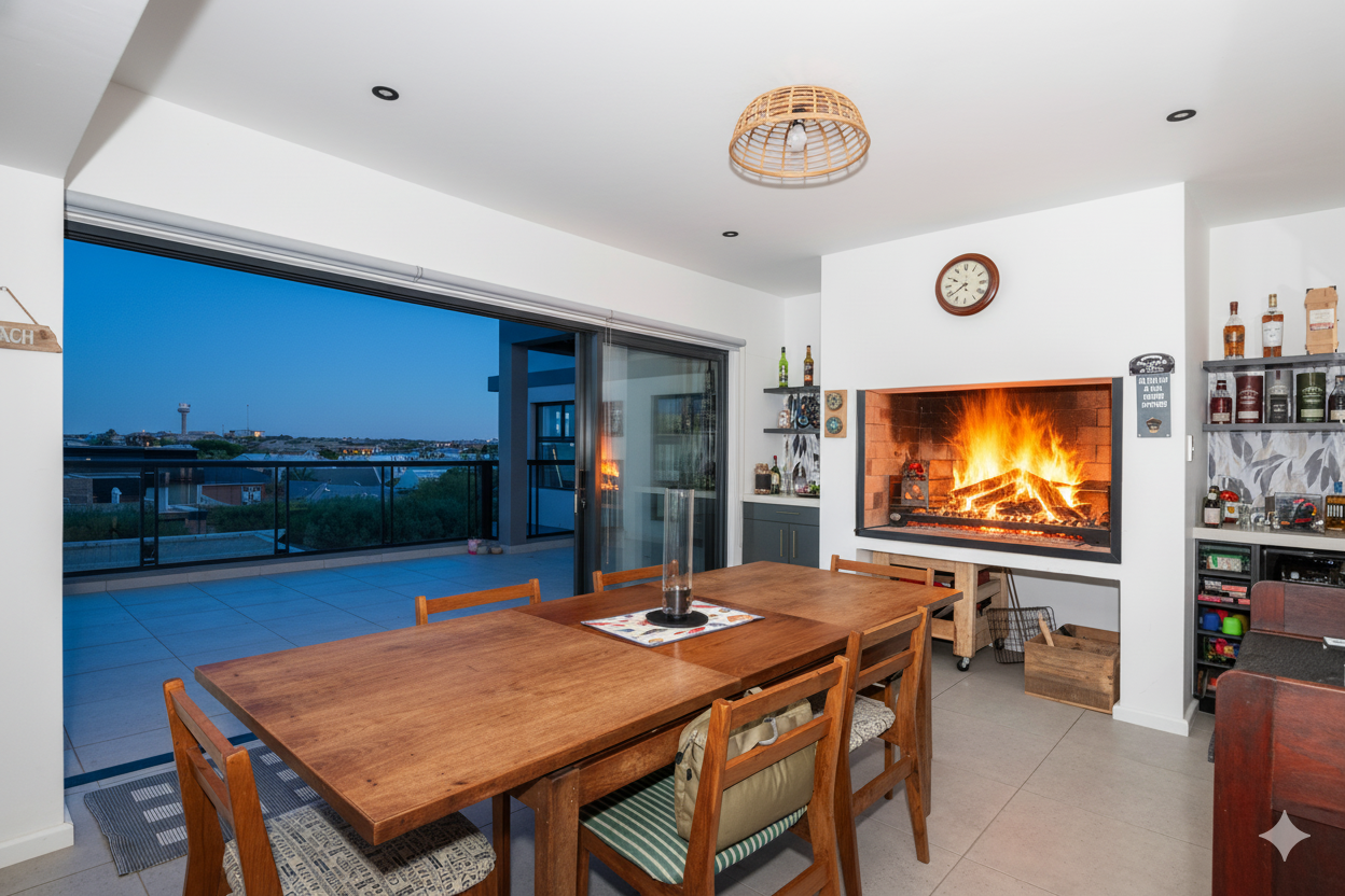 The modern kitchen is both stylish and functional, complete with a separate scullery and laundry area that keep the main space clean and uncluttered. The kitchen flows seamlessly into a generous open-plan lounge featuring a built-in braai — perfect for hosting gatherings year-round. Large sliding doors open to a covered balcony where you can unwind with sundowners while taking in the tranquil coastal views.