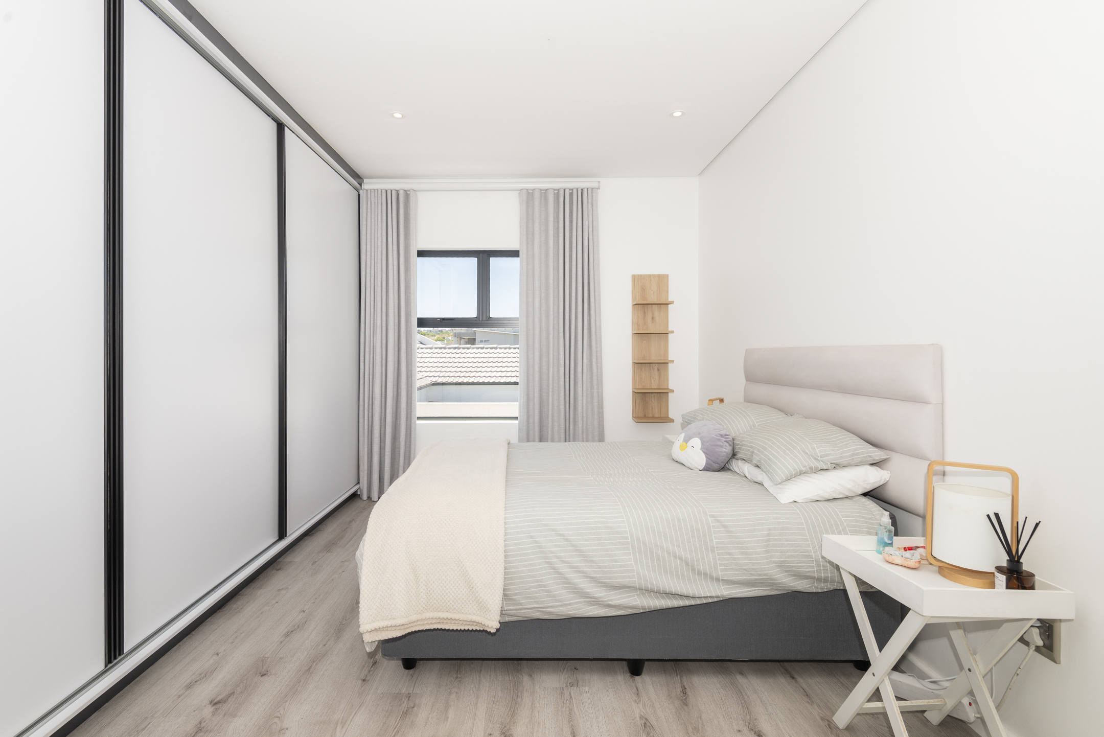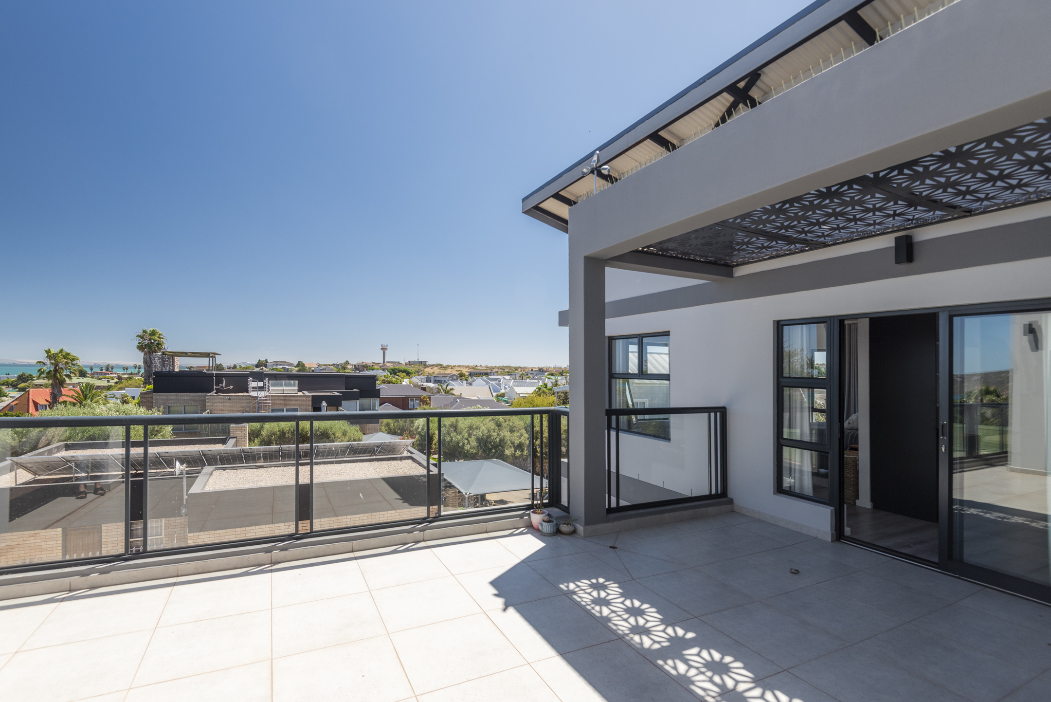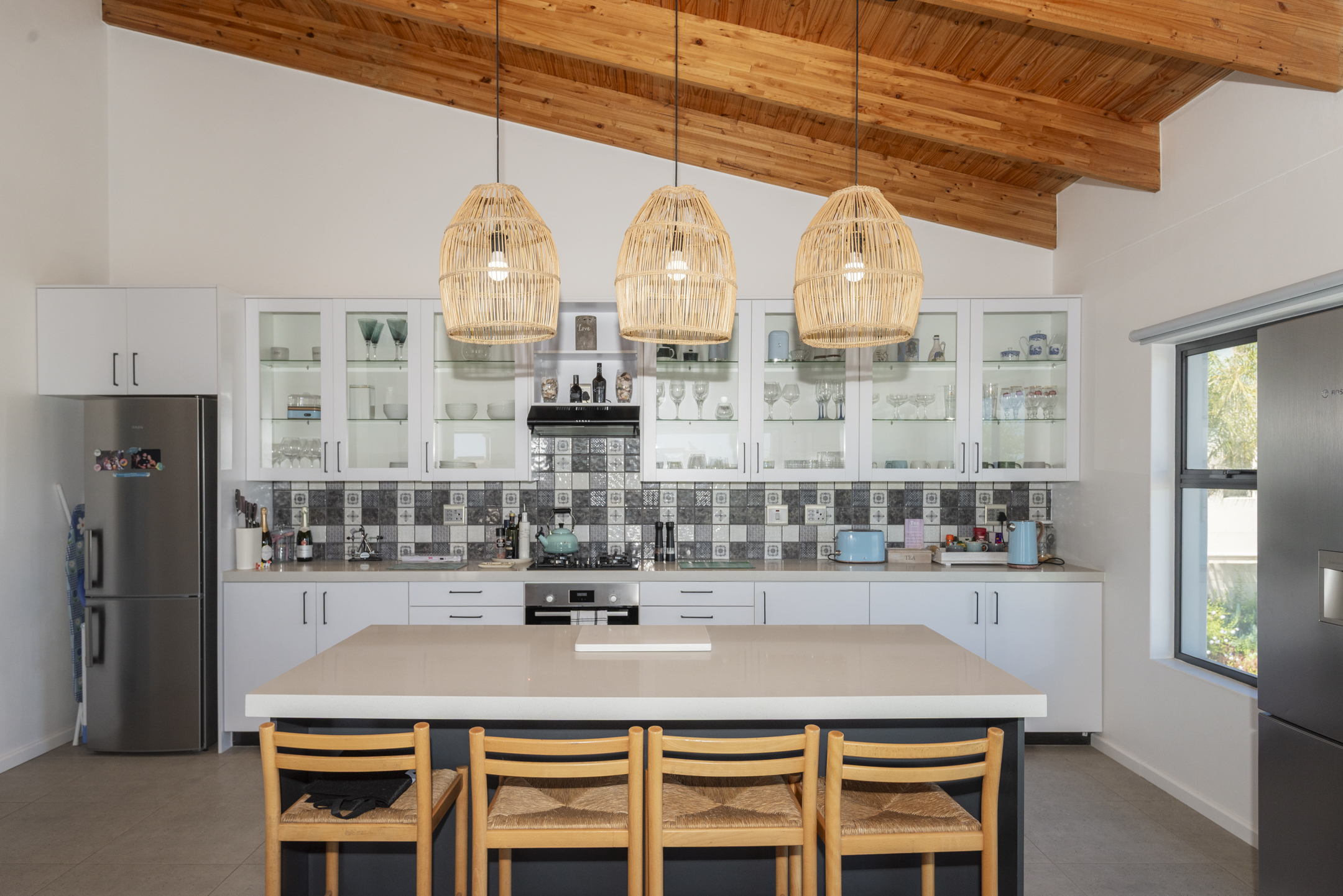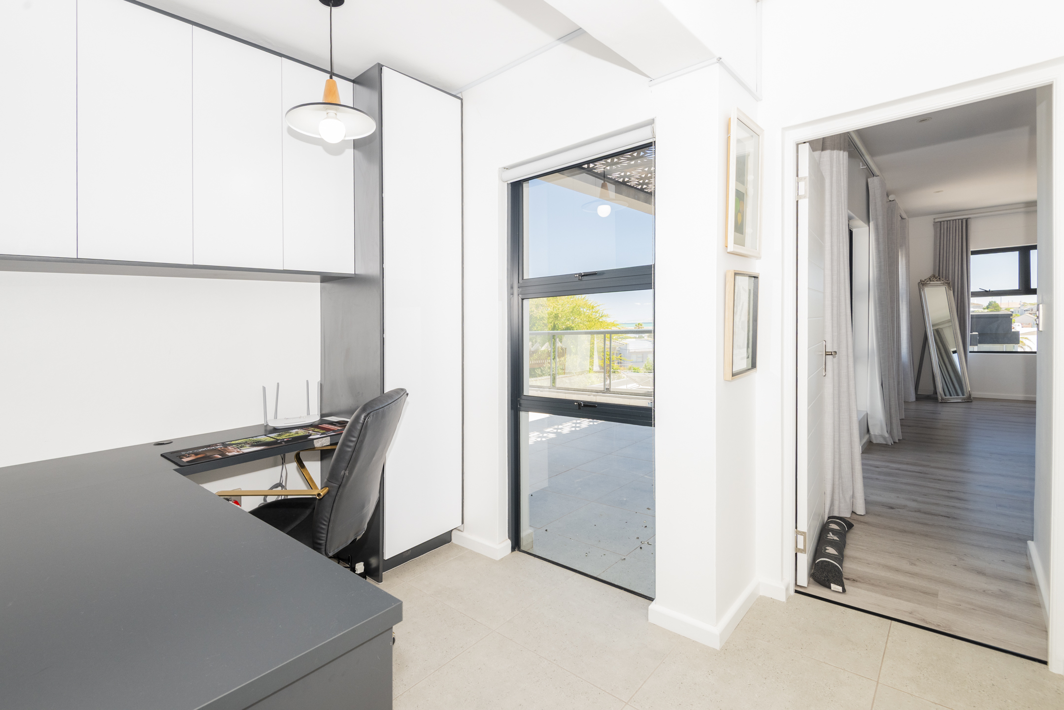 The modern kitchen is both stylish and functional, complete with a separate scullery and laundry area that keep the main space clean and uncluttered. The kitchen flows seamlessly into a generous open-plan lounge featuring a built-in braai — perfect for hosting gatherings year-round. Large sliding doors open to a covered balcony where you can unwind with sundowners while taking in the tranquil coastal views.