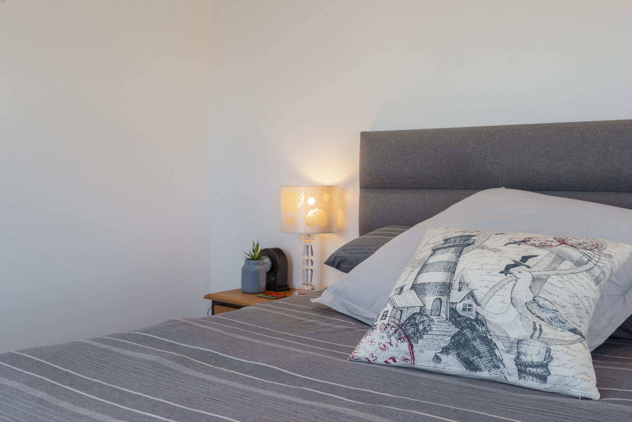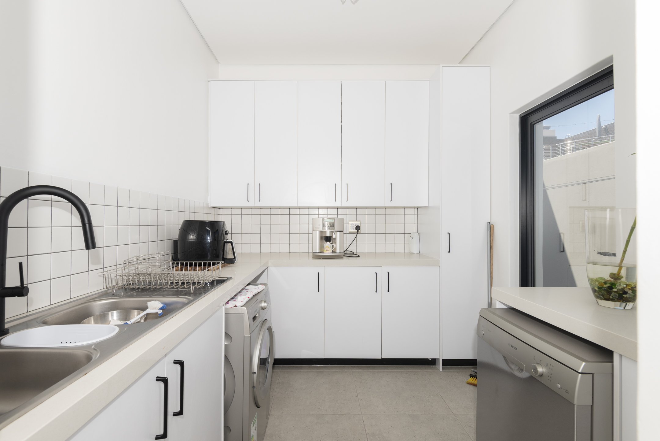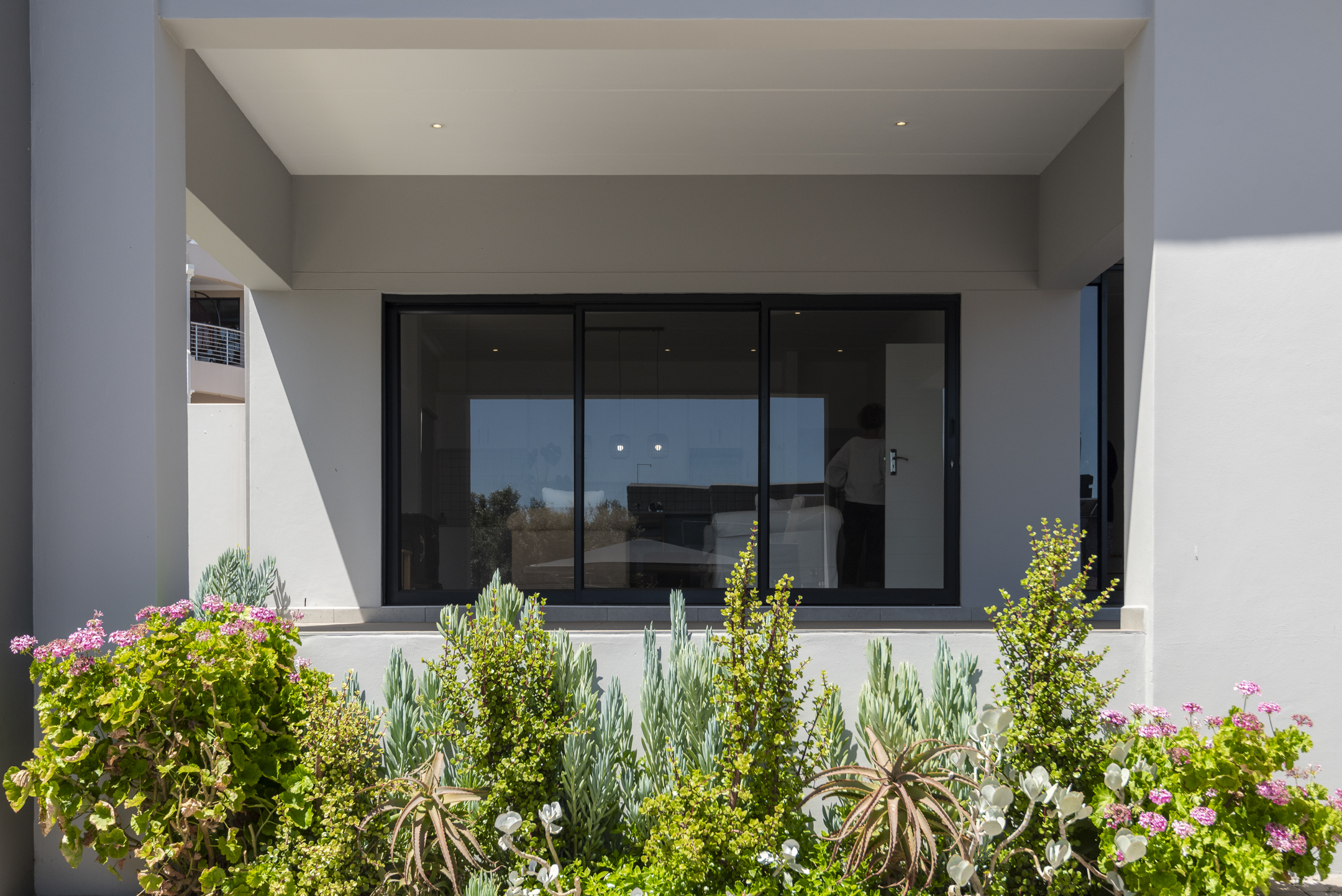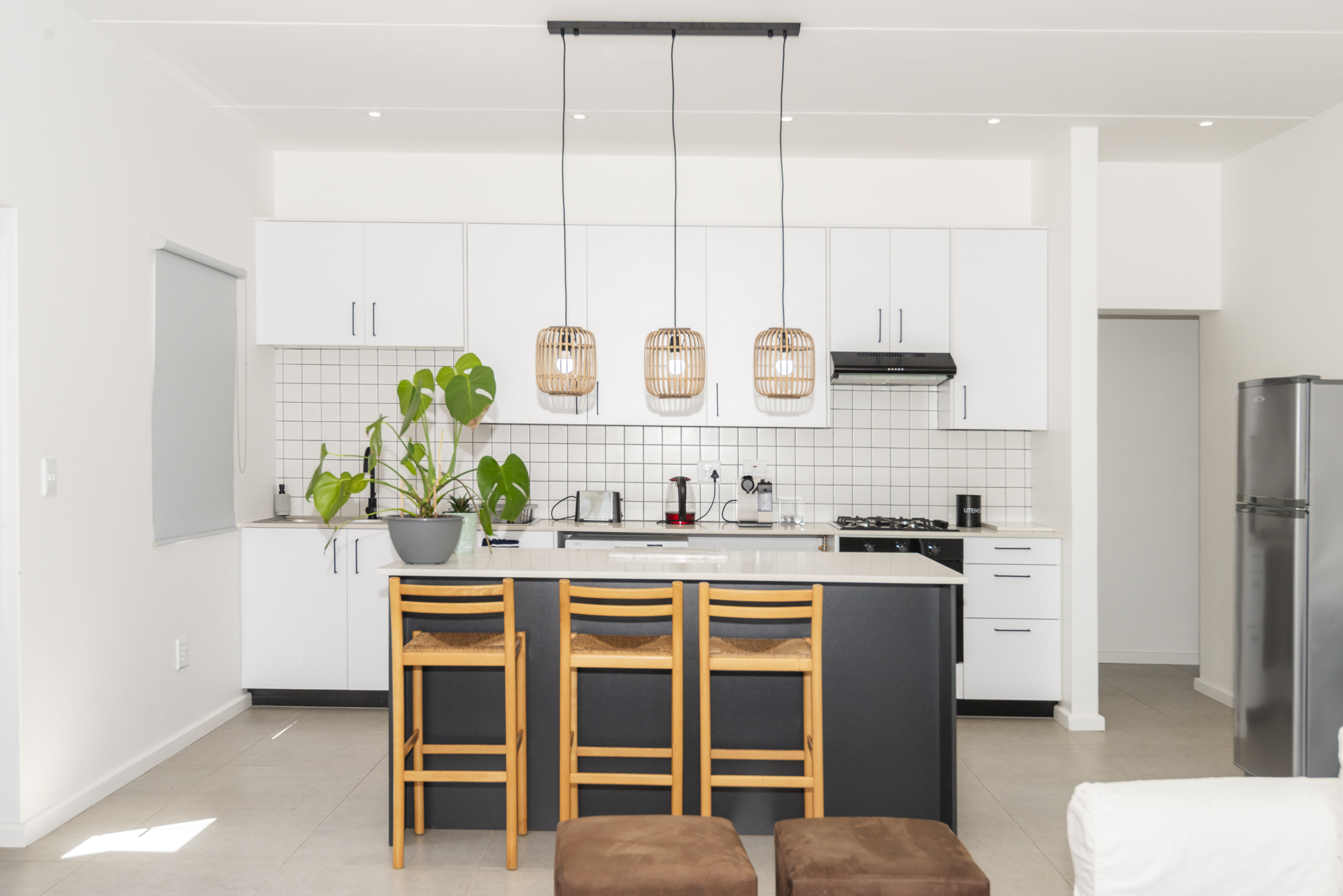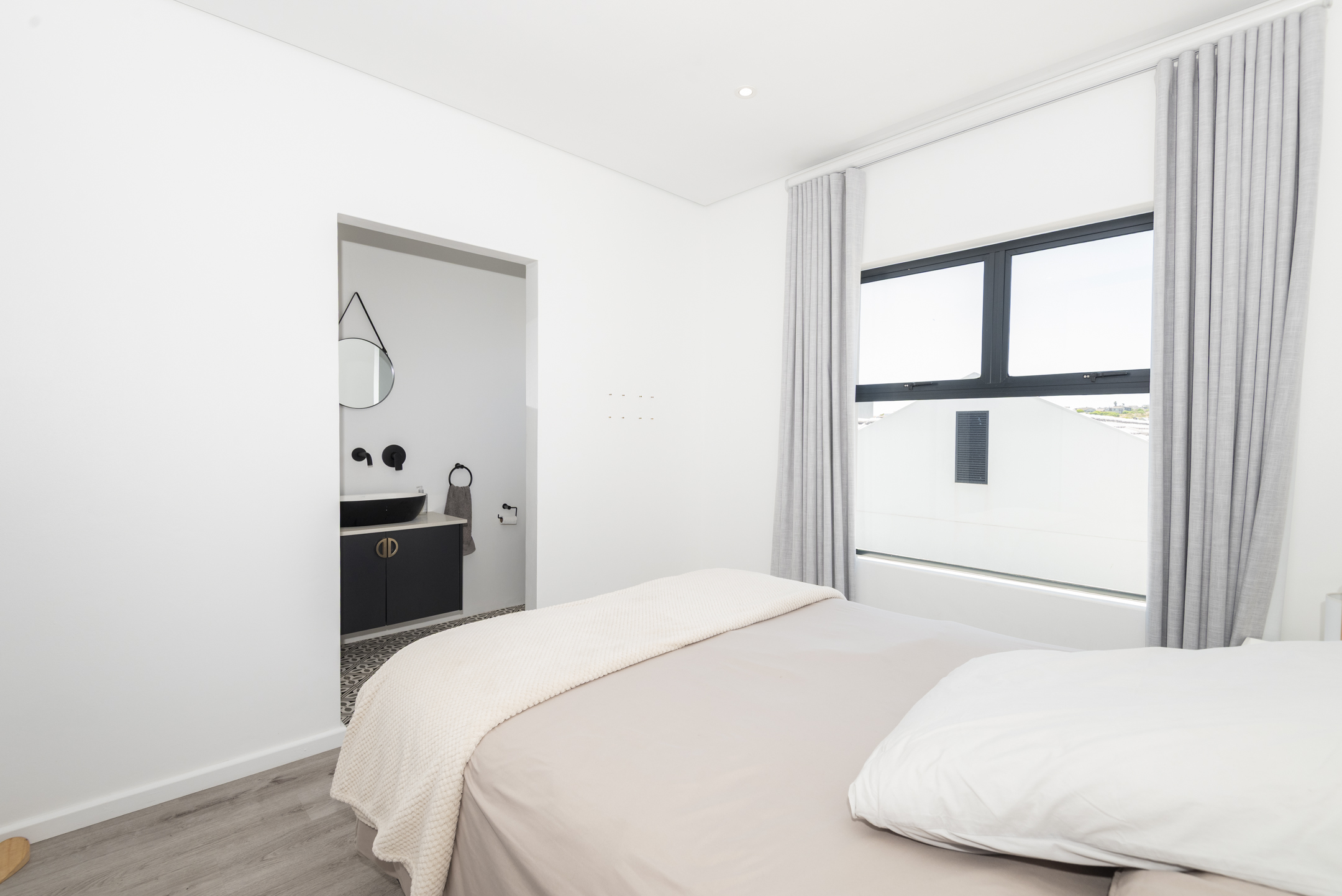 The modern kitchen is both stylish and functional, complete with a separate scullery and laundry area that keep the main space clean and uncluttered. The kitchen flows seamlessly into a generous open-plan lounge featuring a built-in braai — perfect for hosting gatherings year-round. Large sliding doors open to a covered balcony where you can unwind with sundowners while taking in the tranquil coastal views.
