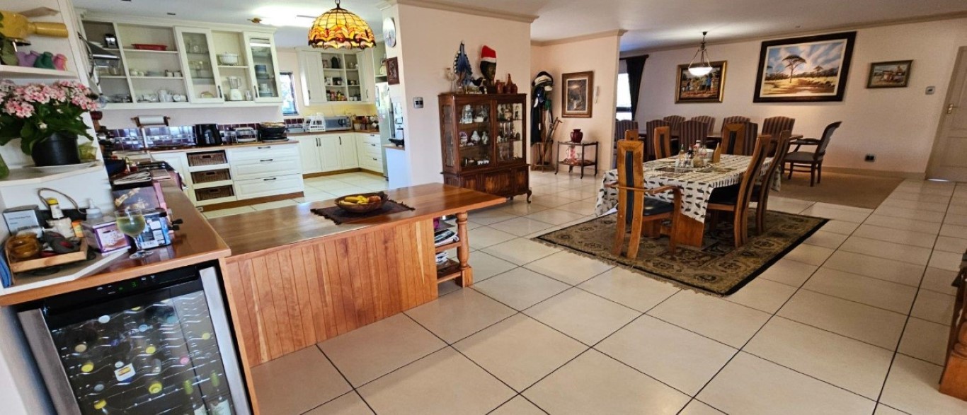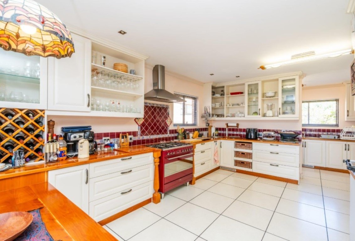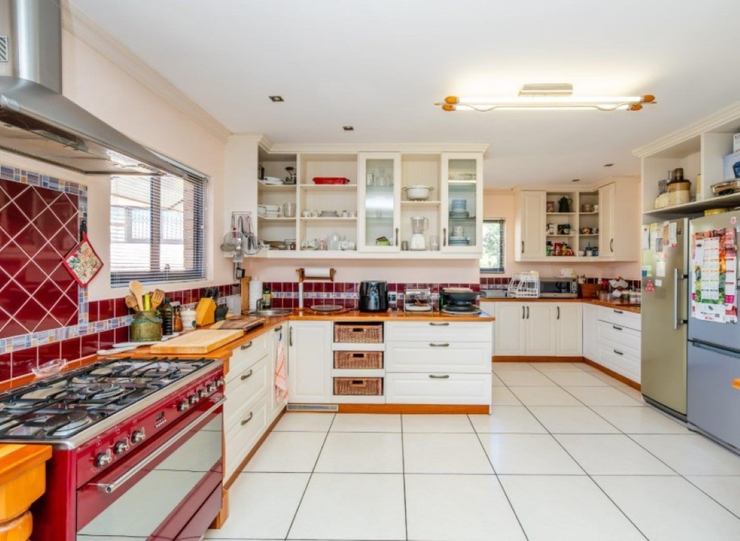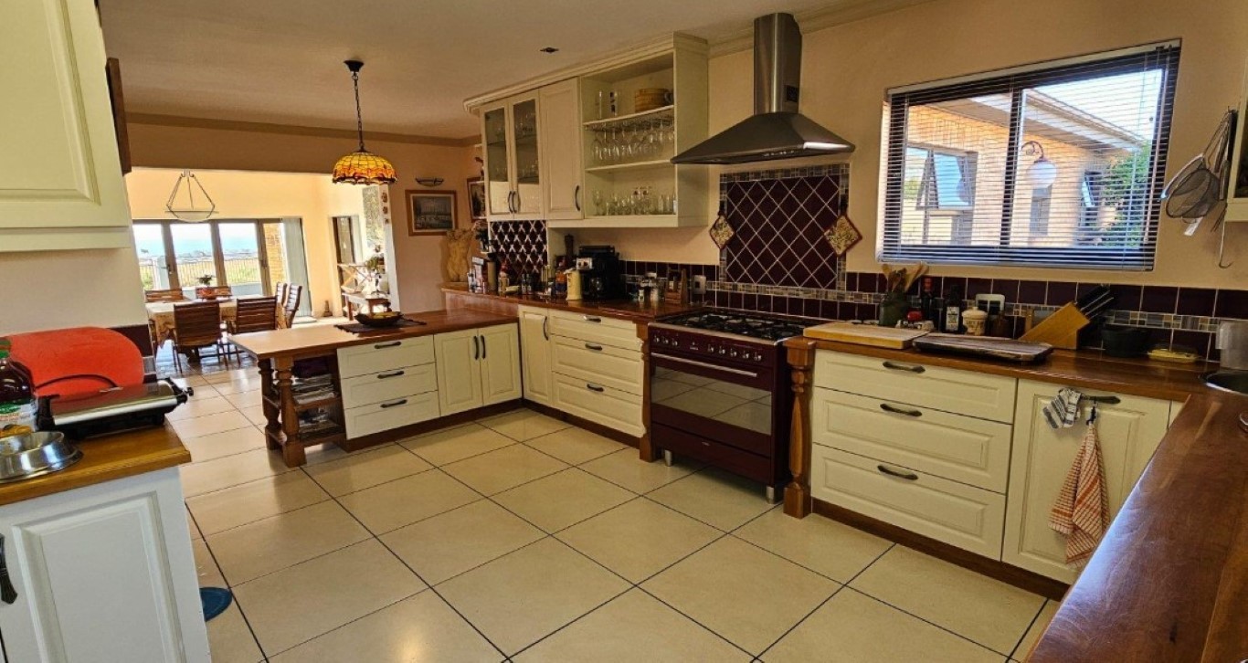The open-plan lounge, dining, braai, and kitchen areas flow seamlessly, with air conditioning in the lounge. Stacking doors open from the braai area to a covered patio and garden. The kitchen features a 5-burner SMEG gas stove with large electric oven, cherrywood countertops, built-in shelving, and a separate scullery/laundry. Guest toilet near the living area.