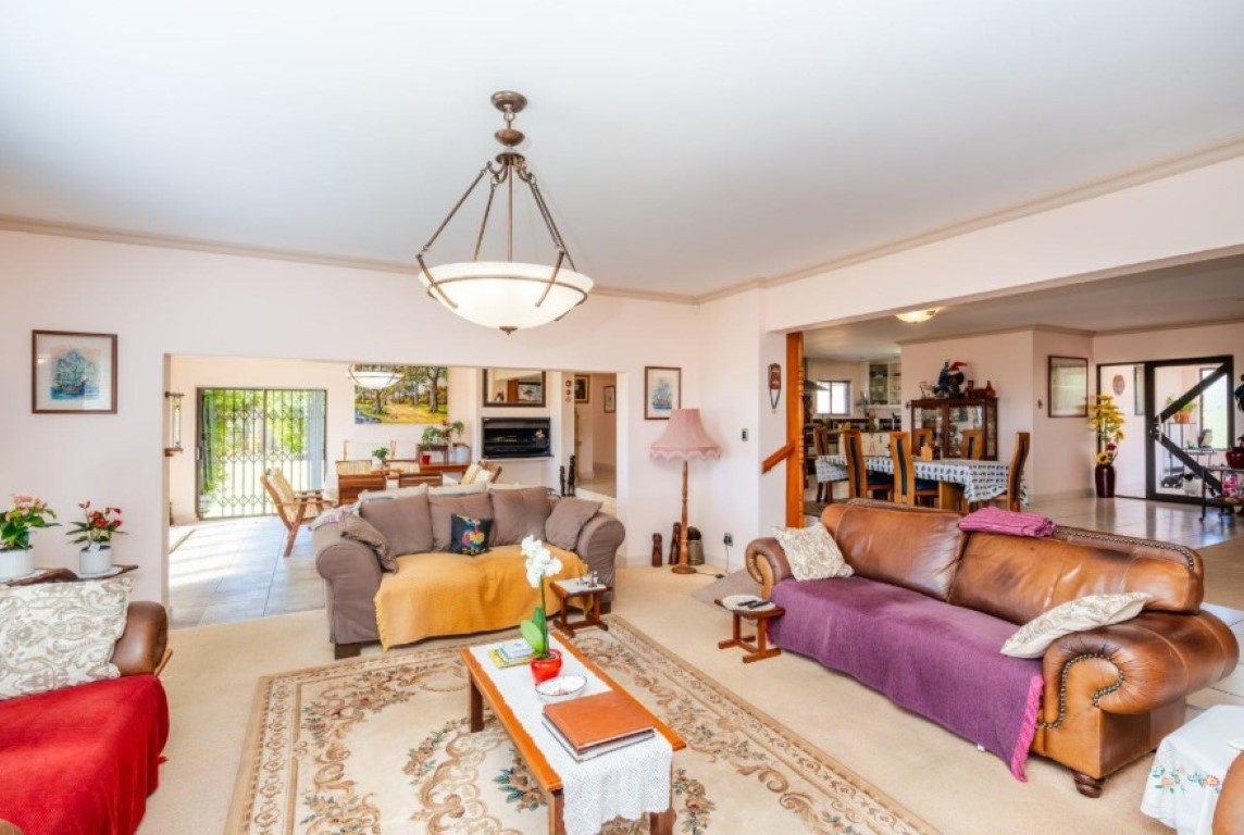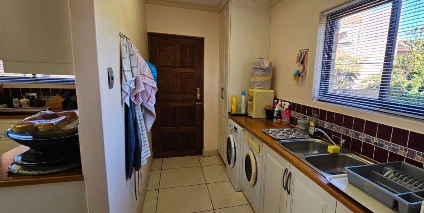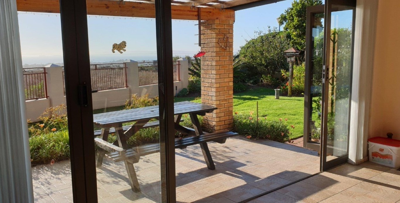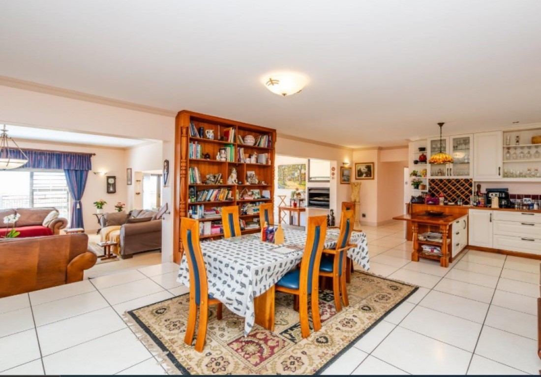 The open-plan lounge, dining, braai, and kitchen areas flow seamlessly, with air conditioning in the lounge. Stacking doors open from the braai area to a covered patio and garden. The kitchen features a 5-burner SMEG gas stove with large electric oven, cherrywood countertops, built-in shelving, and a separate scullery/laundry. Guest toilet near the living area.