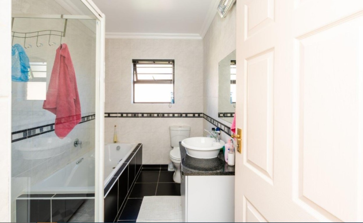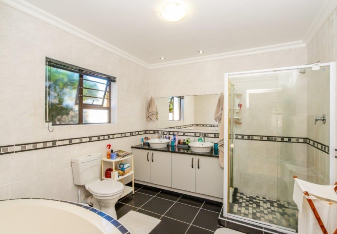 Extras include wood Venetian blinds throughout, solar geyser, 5 kW inverter with 2 × 5 kW batteries and 8 solar panels, a private room with en-suite shower (ideal staff accommodation), automated double garage with direct access, automated gate with intercom, full security system, outdoor lighting, and a computerised irrigation system.