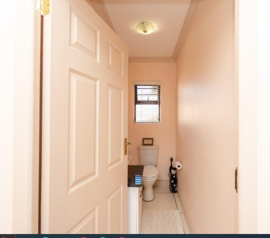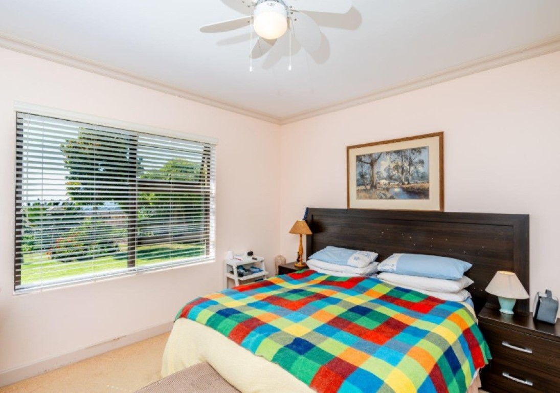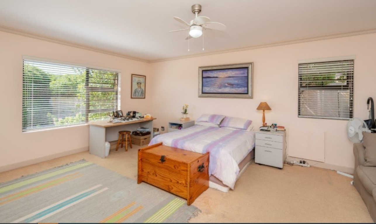 The home offers four bedrooms, three north-west facing with built-in cupboards, sharing a full family bathroom. The spacious main suite includes a walk-in dressing room, built-in dressing table, and en-suite bathroom with his-and-hers vanities.