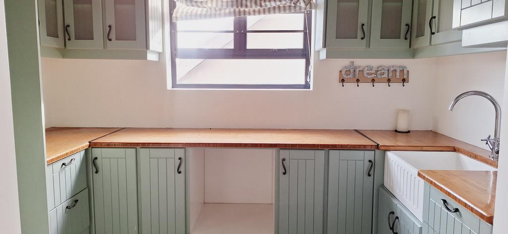 FLATLET: Above the double garage a cosy apartment offers an open-plan lounge and kitchenette with built-in cupboards, a spacious bedroom with an en-suite bathroom (bath, shower, and toilet).
