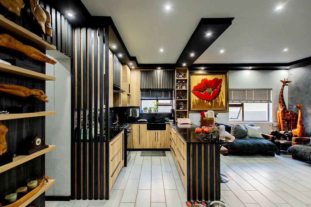 Open plan living area and modern kitchen.