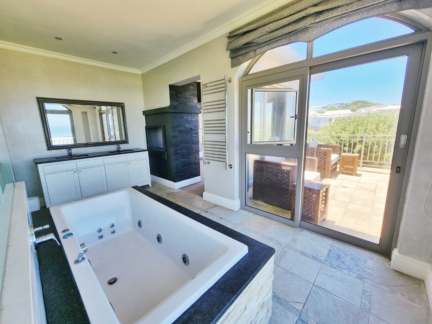 Upstairs, three ocean-facing rooms provide breathtaking views, while a generously proportioned downstairs bedroom with an en-suite bathroom opens to the central pool area. The main bedroom is a private sanctuary, complete with a gas fireplace, a double shower, and a large bath facing the ocean. Extend your living space outdoors on the patio, boasting 180-degree views of the coastline.