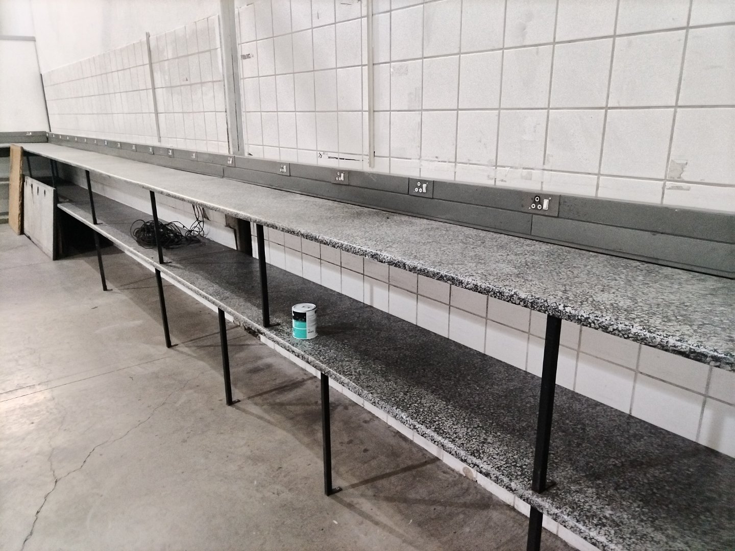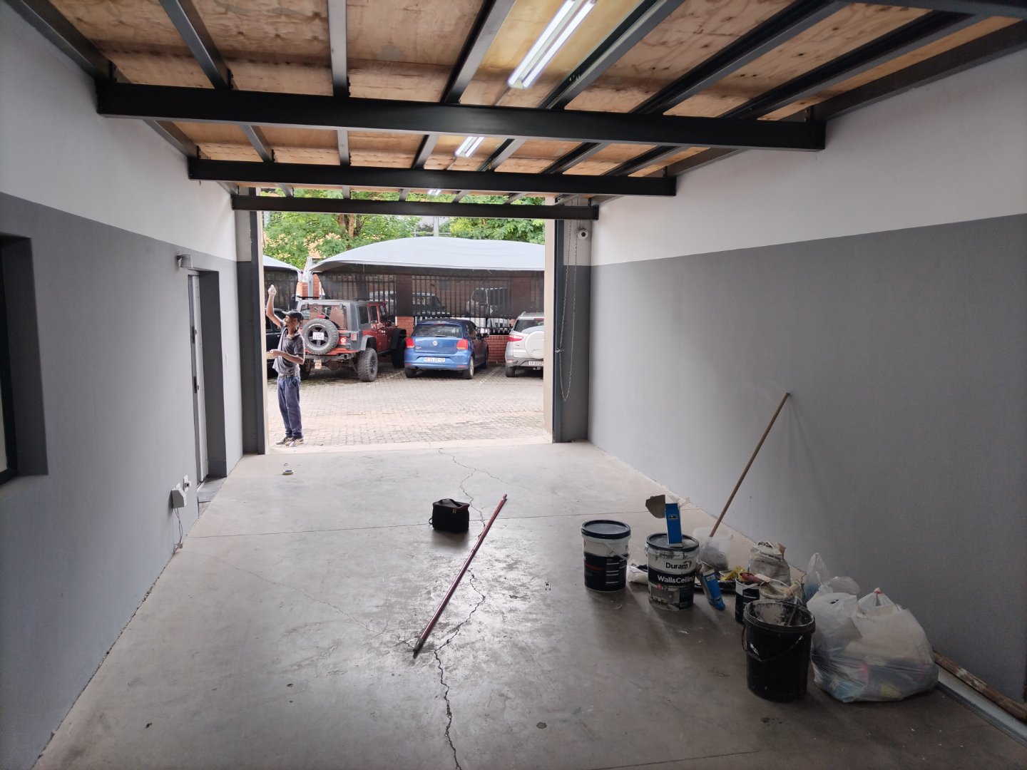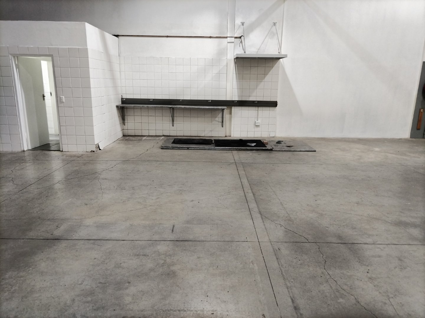 Then the warehouse's back portion, with an installed counter and plugs, is ideal for part repairs, with two storage areas and a spray booth.