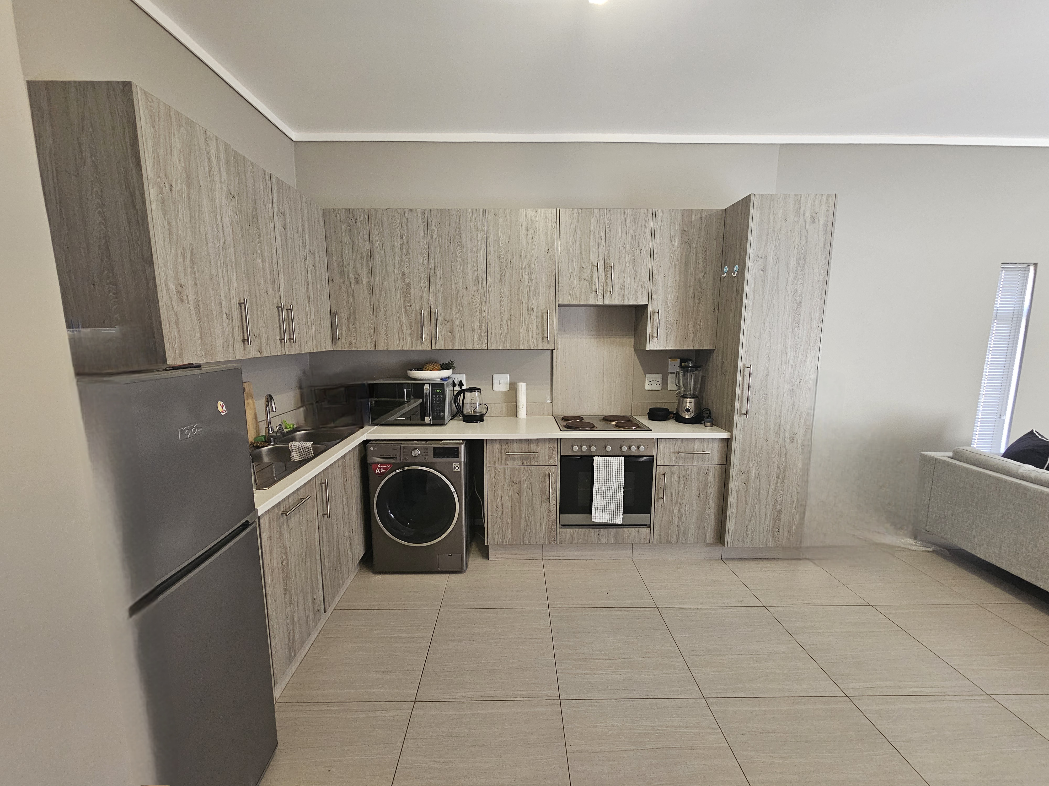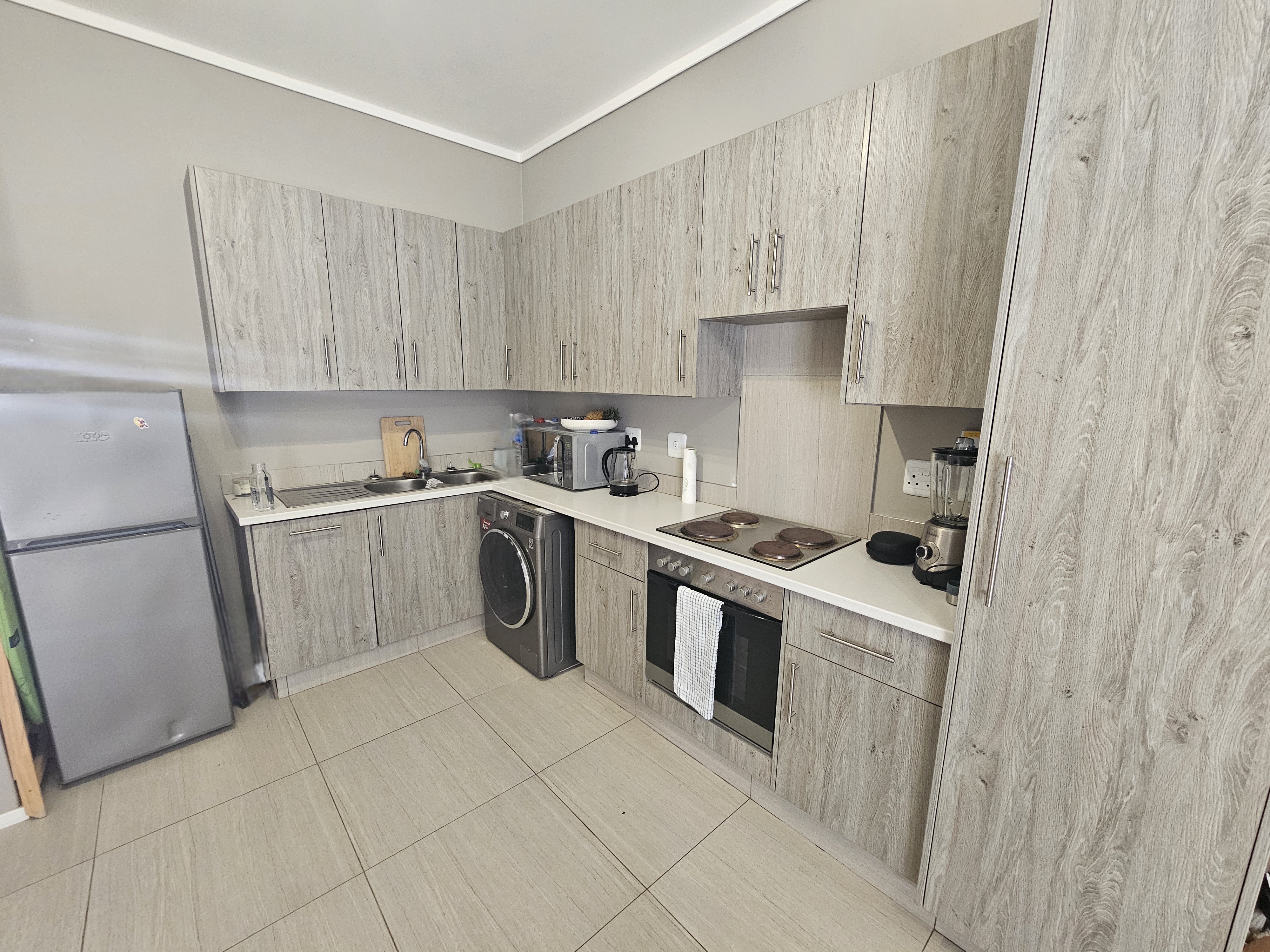Open-plan kitchen with built-in stove and oven, seamlessly flowing into the lounge