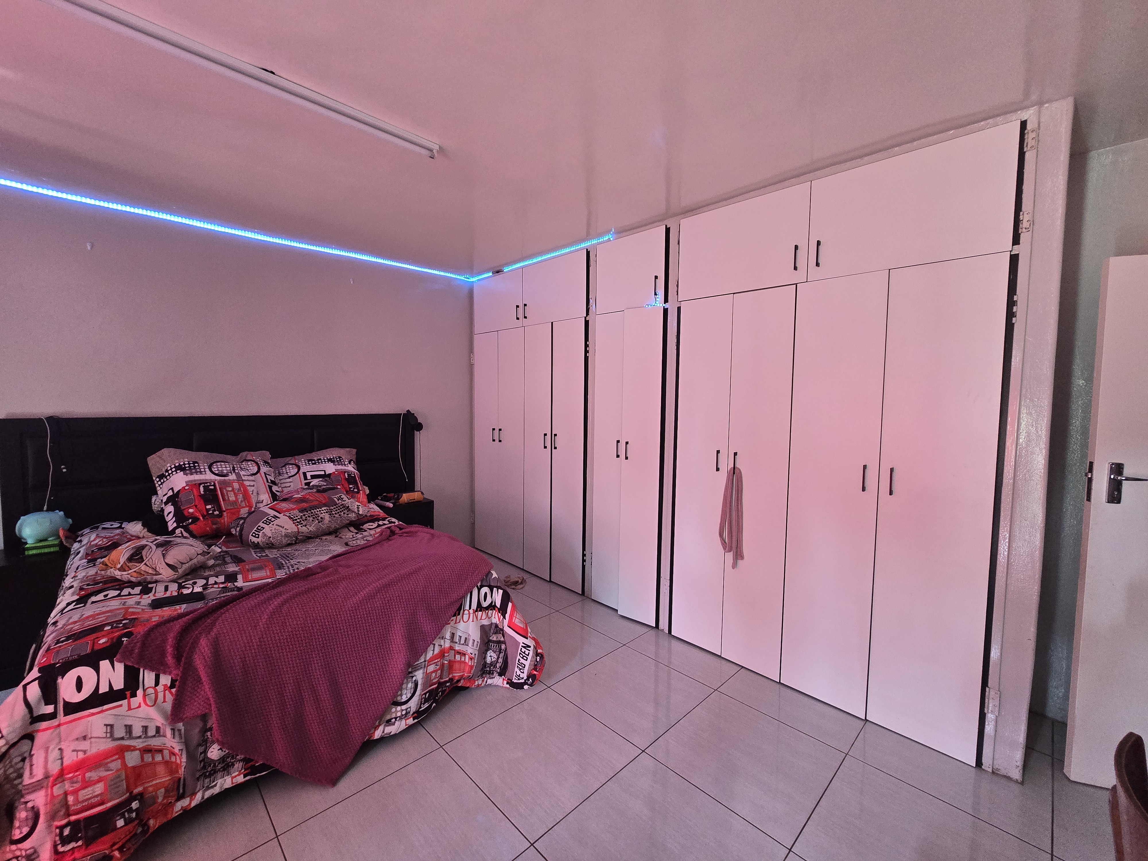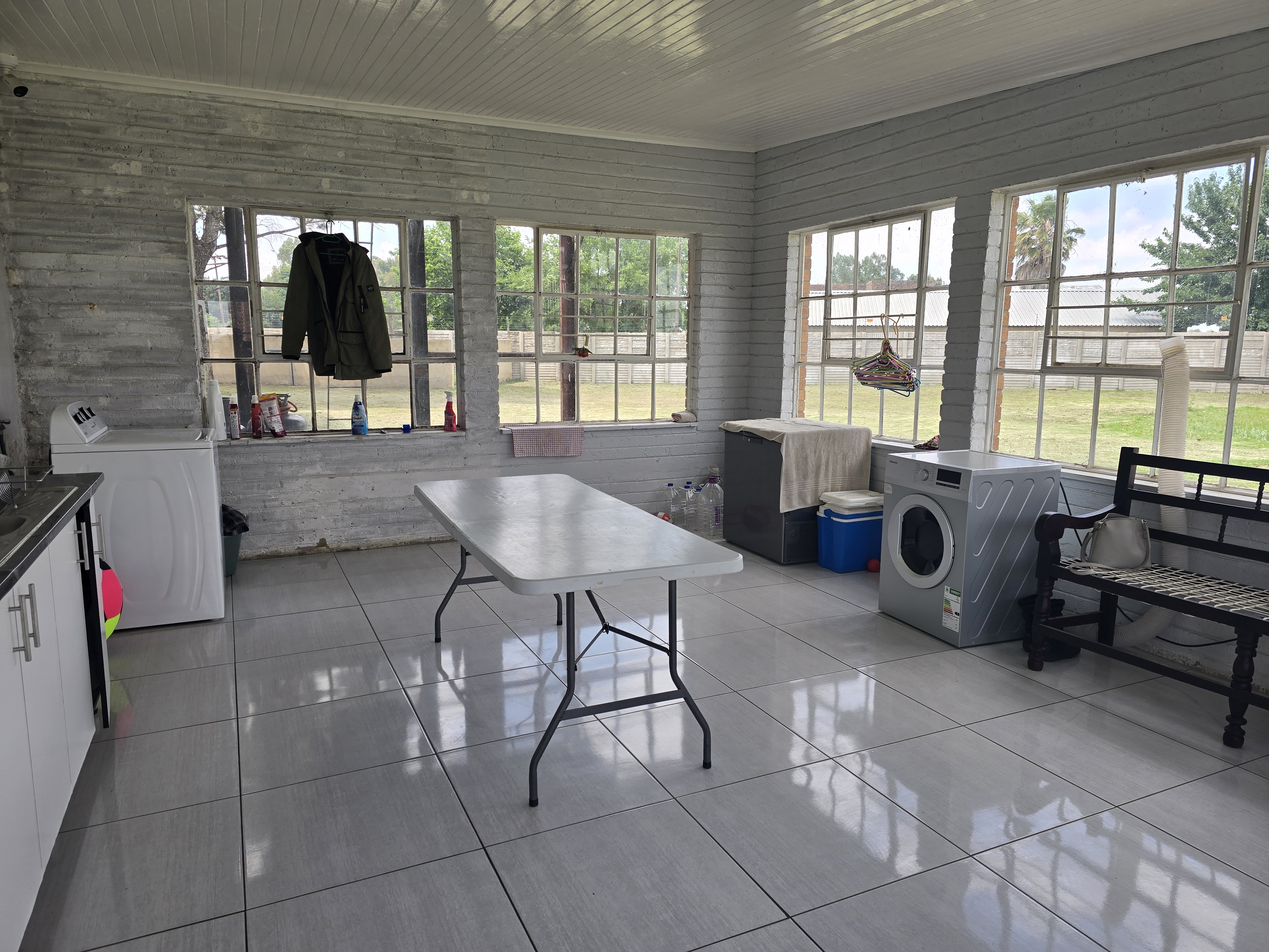 The open-plan sitting, dining, and kitchen area boasts beautiful white cupboards, a dream for any homeowner, along with a spacious laundry room.