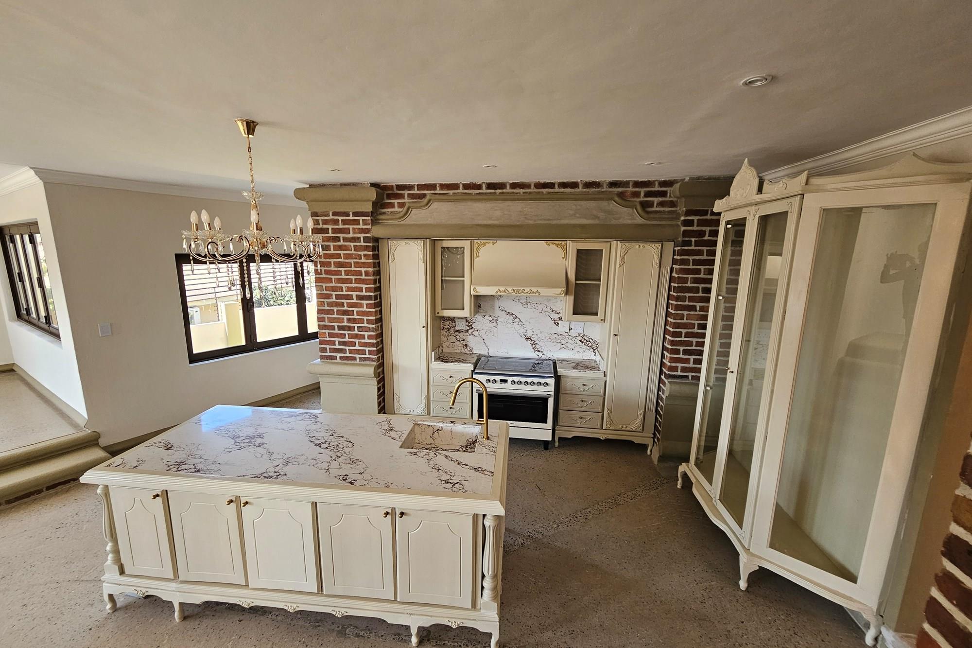 Gourmet Kitchen: The kitchen is a chef’s dream, fitted with beautifully carved cupboards, marble tops, and a gas stove. Adjacent to the kitchen, you’ll find a spacious laundry/scullery area.