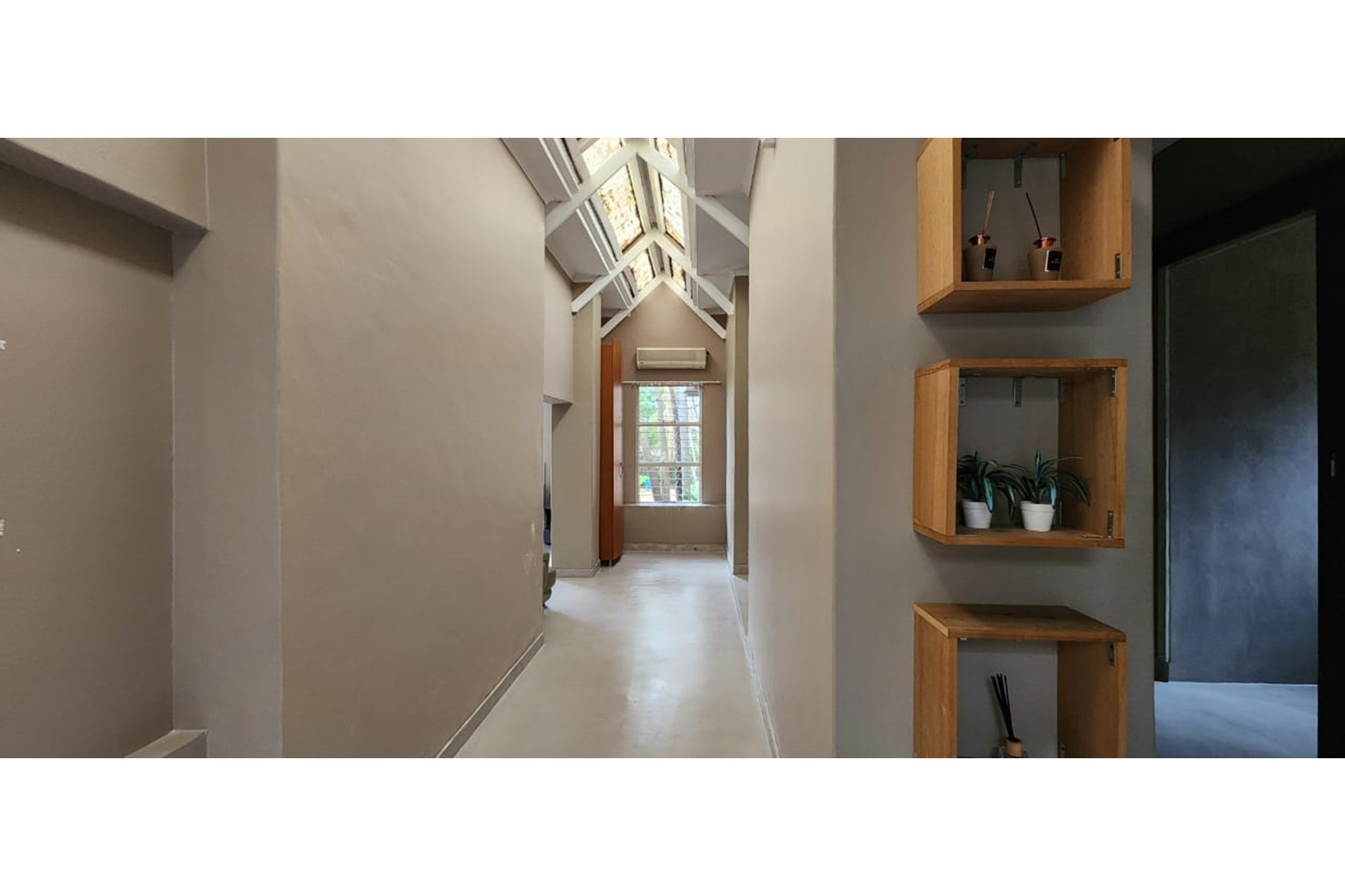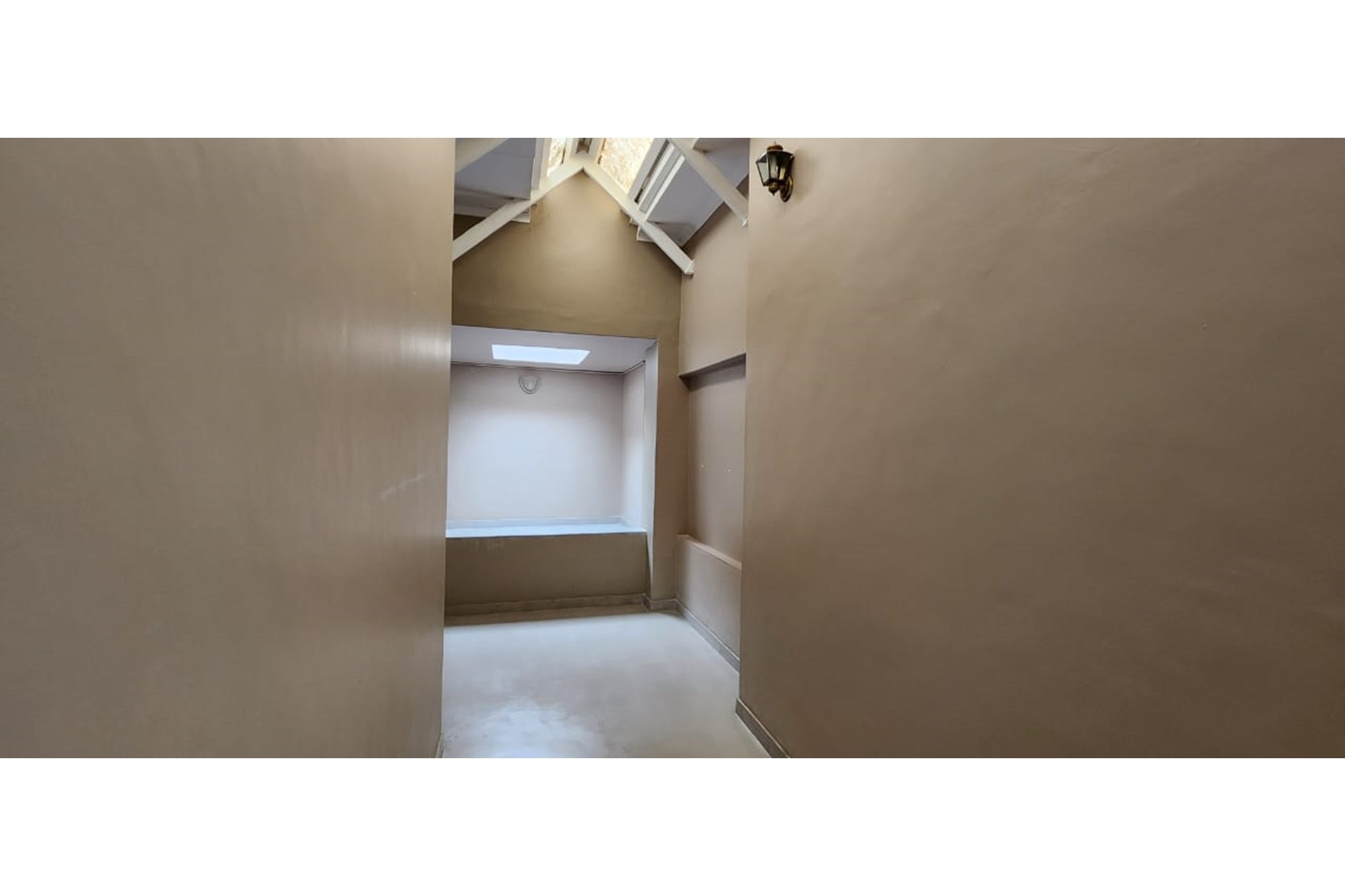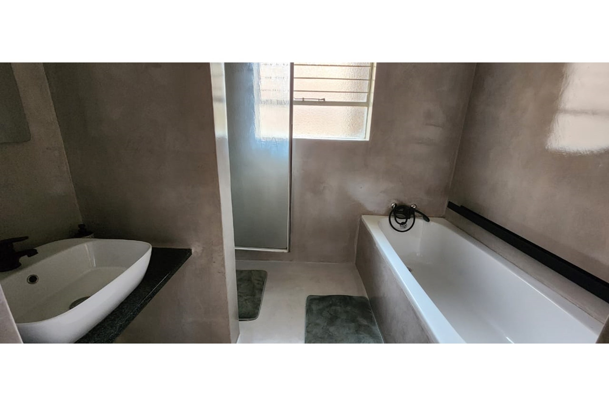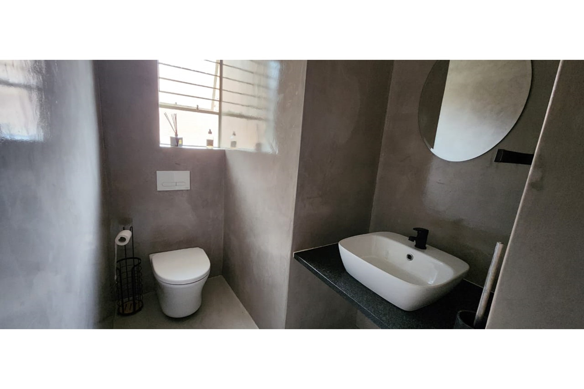 Park in the paved driveway and enter through the front door into a foyer, the private lounge is on the left. The living area with open plan kitchen include the dining room and tv / family room. The large study is light and bright with a long roof window and creates and interesting interior. There are 3 bedrooms and 2 bathrooms. The Master bedroom has an en-suite bathroom and ample cupboard space. The 2 remaining bedrooms share a bathroom.