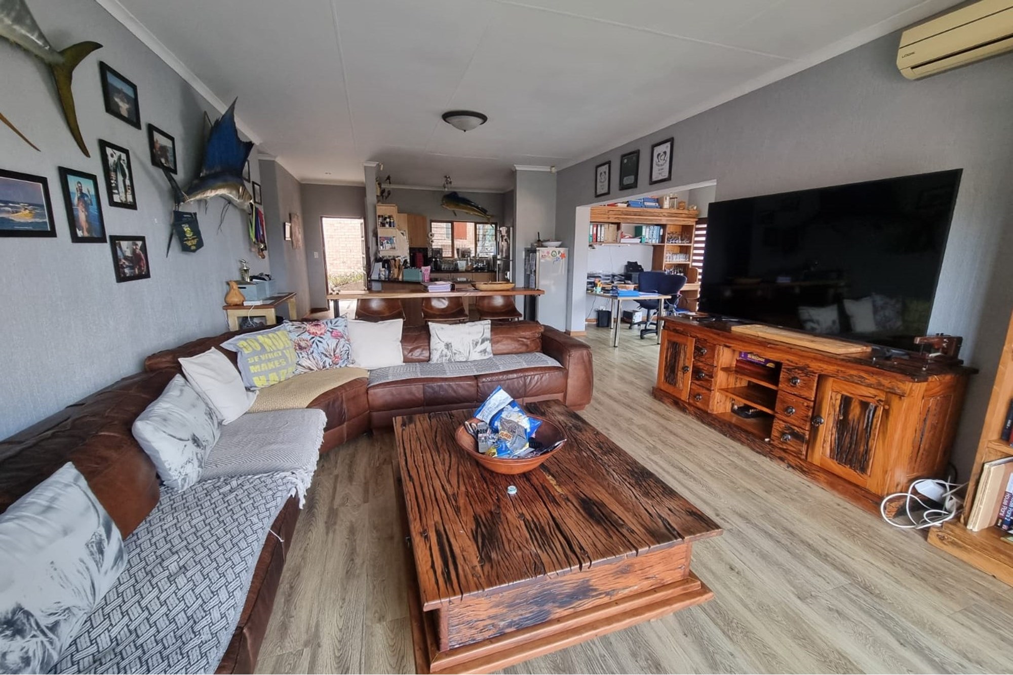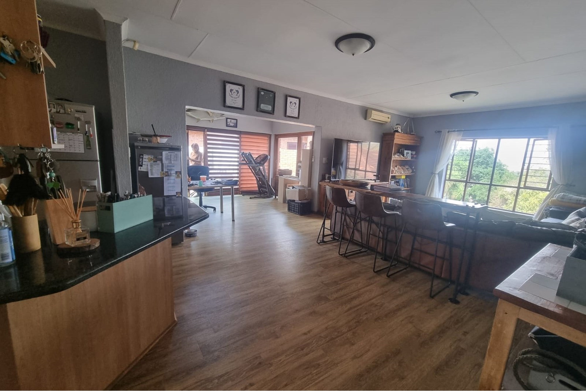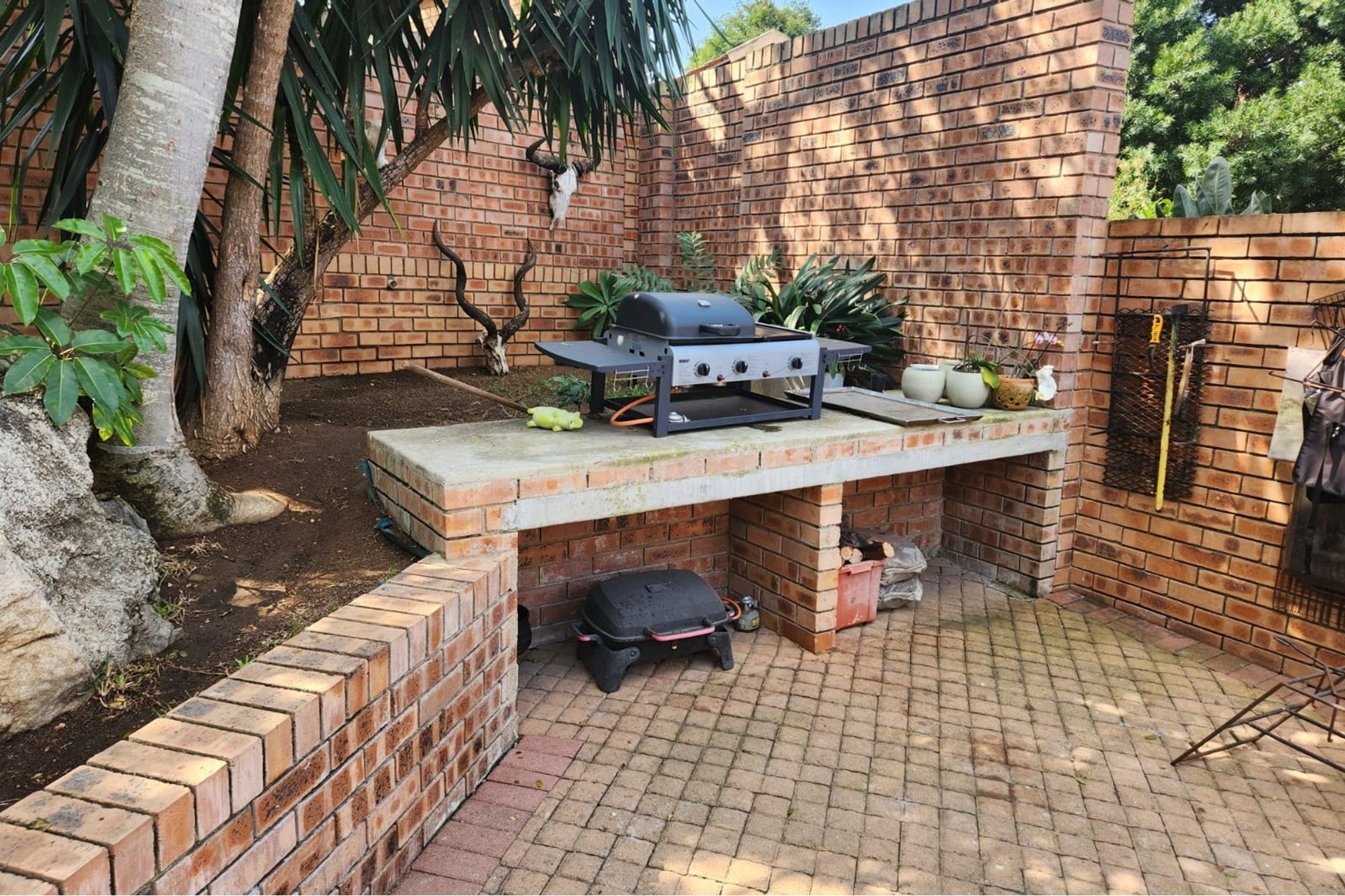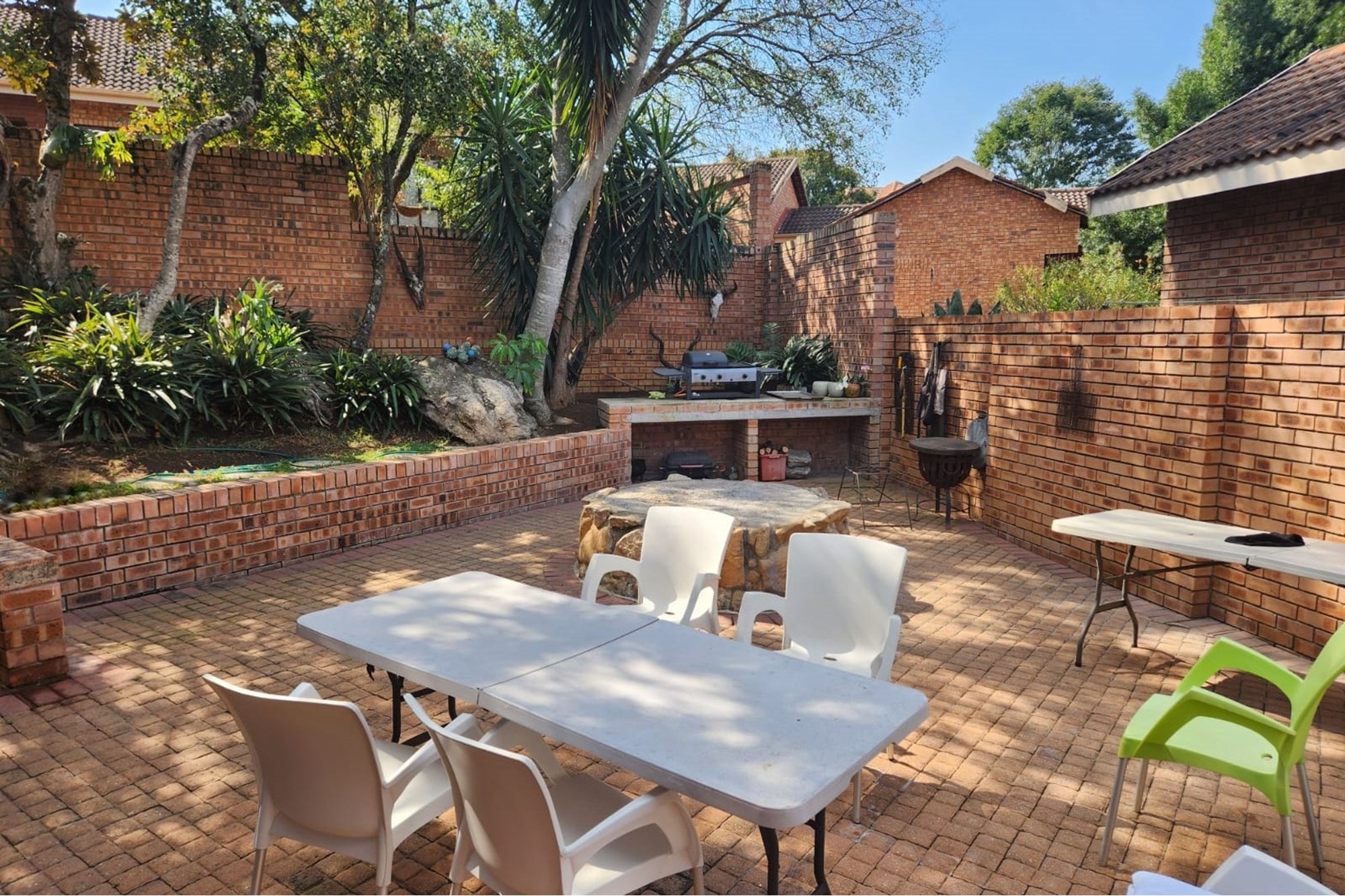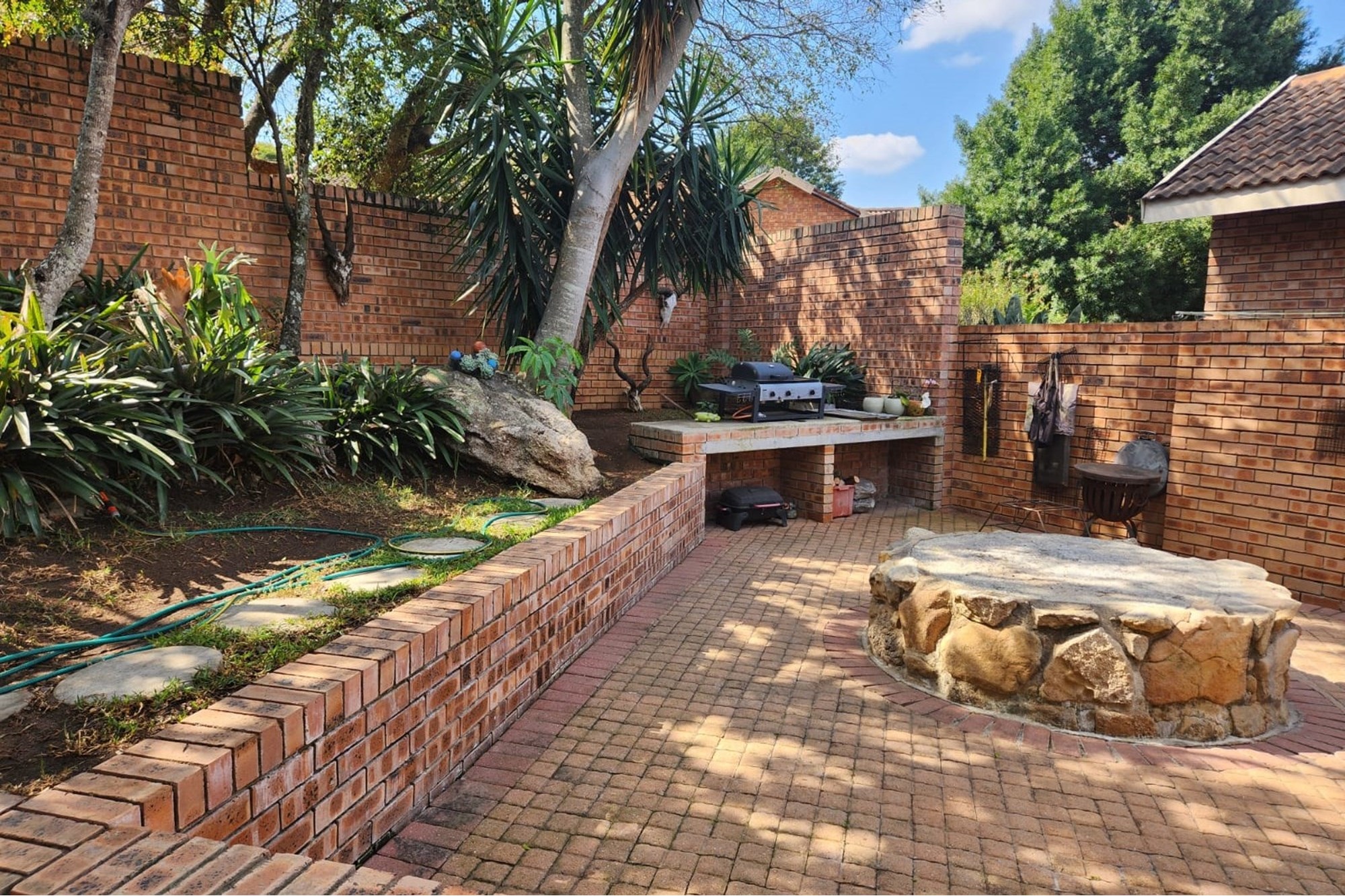The house offers a Lovely Open-plan Lounge, Kitchen and Dining room layout with a packaway doors giving access to the low maintenance backyard with Boma fireplace and Braai under large shady trees. The living areas has 2 air-conditioners to ensure your comfort.