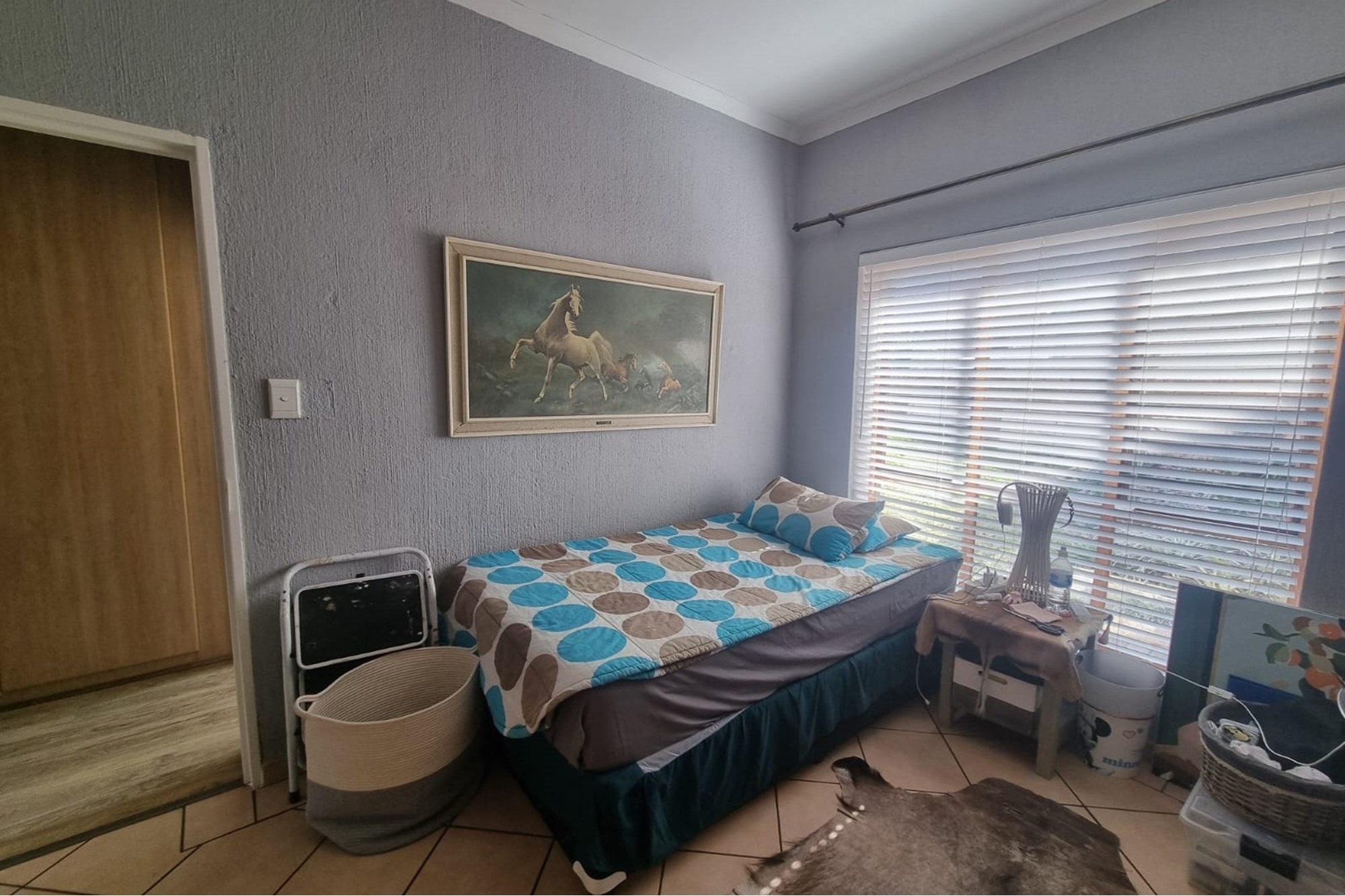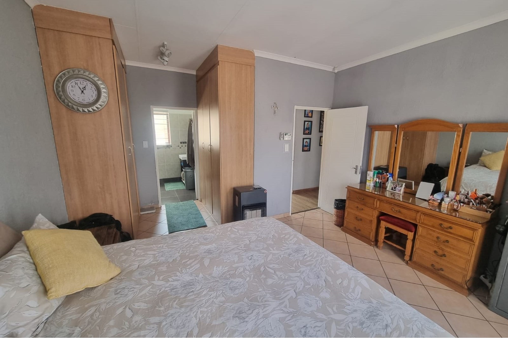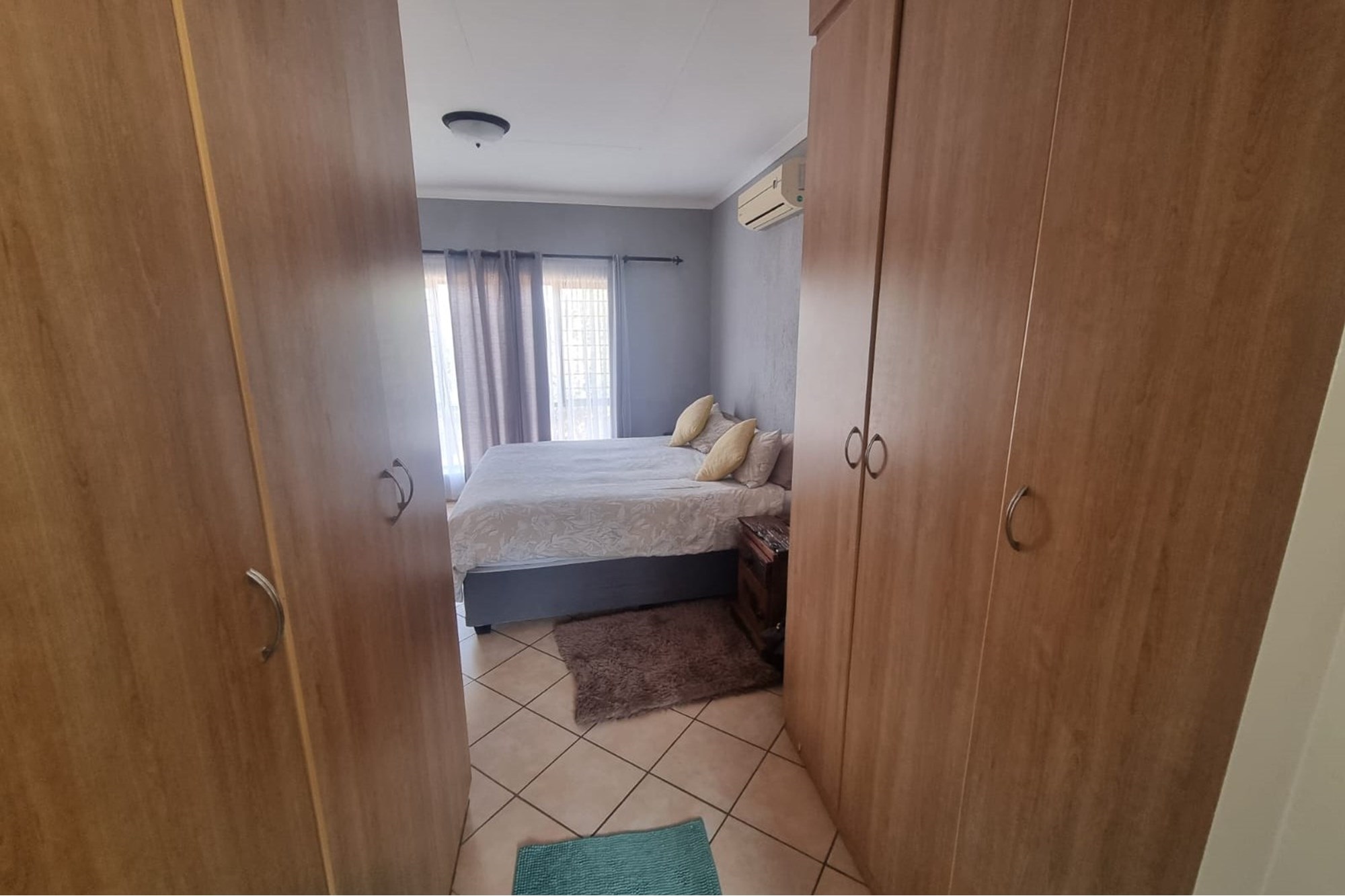 The passageway takes you to the three bedrooms, and bathrooms. The main bedroom is spacious with lots of wardrobe space and air-conditioning and en-suit bathroom. One of the other bedrooms has an air-conditioner and the third bedroom does not. The full bathroom is shared.