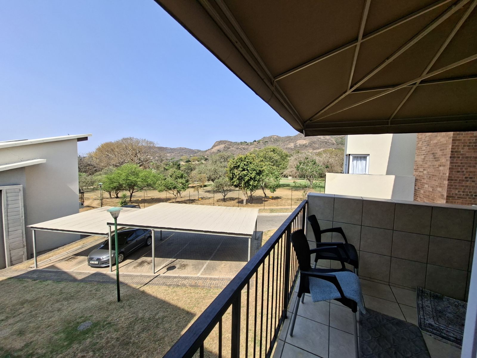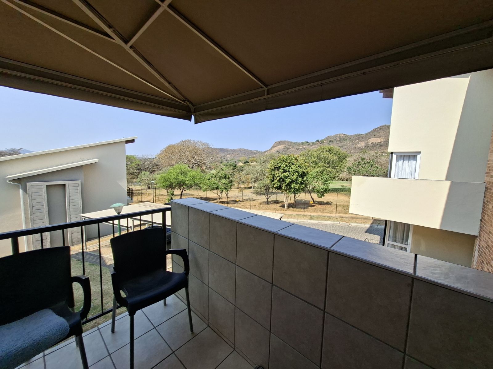 Situated on the second floor, the unit features an open-plan living area that opens onto a private balcony with views across the fairway at Matumi Golf Estate. The main bedroom includes an en-suite bathroom, while a second bathroom serves the additional bedroom and guests.