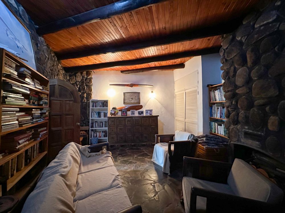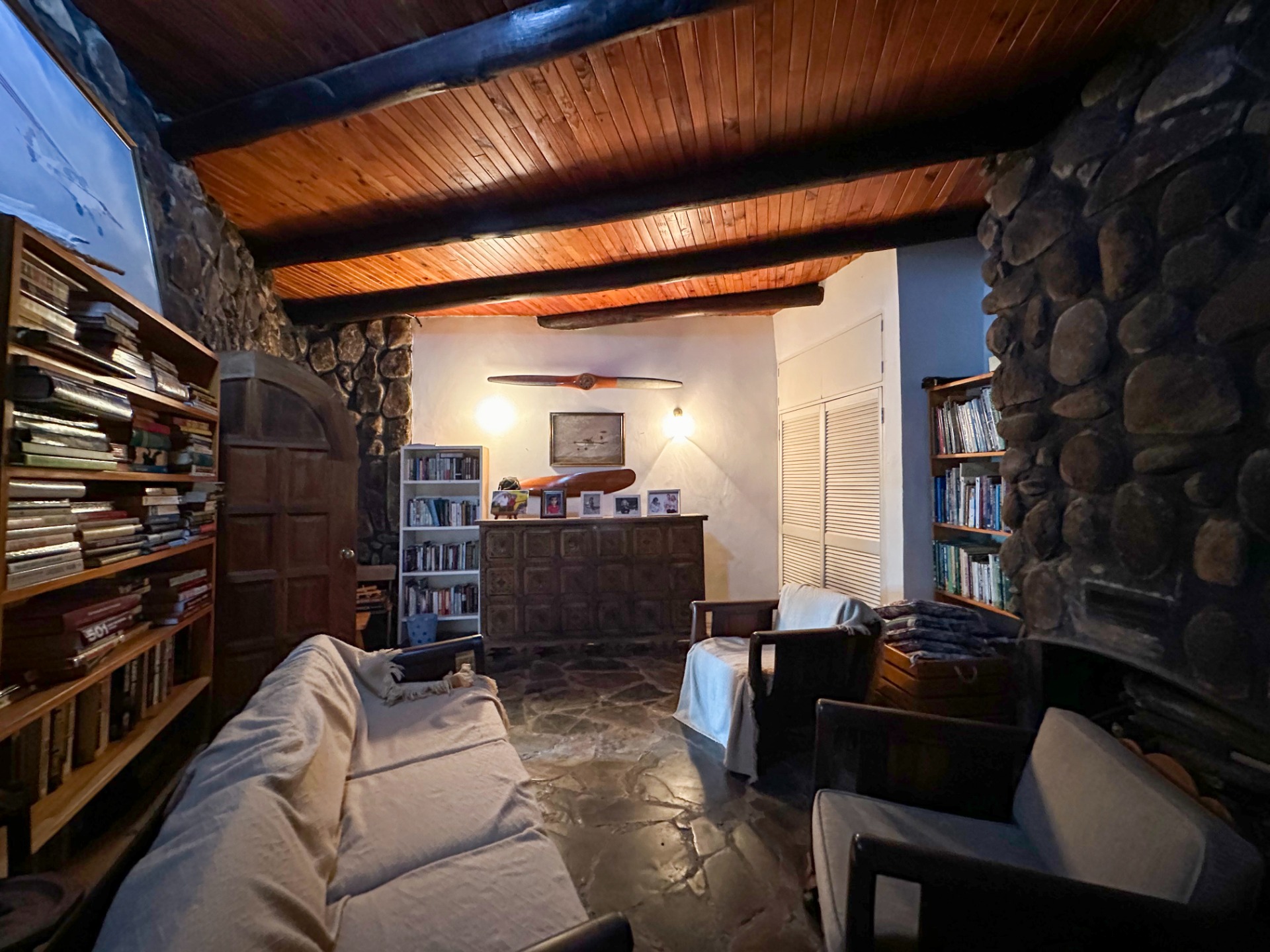 The interior boasts three lounges, two of which open onto a covered patio through glass sliding doors. This patio offers breathtaking views of the garden and swimming pool, making it perfect for relaxation and entertainment. For the reading enthusiast, a cozy library awaits, providing the ideal sanctuary for literary pursuits.